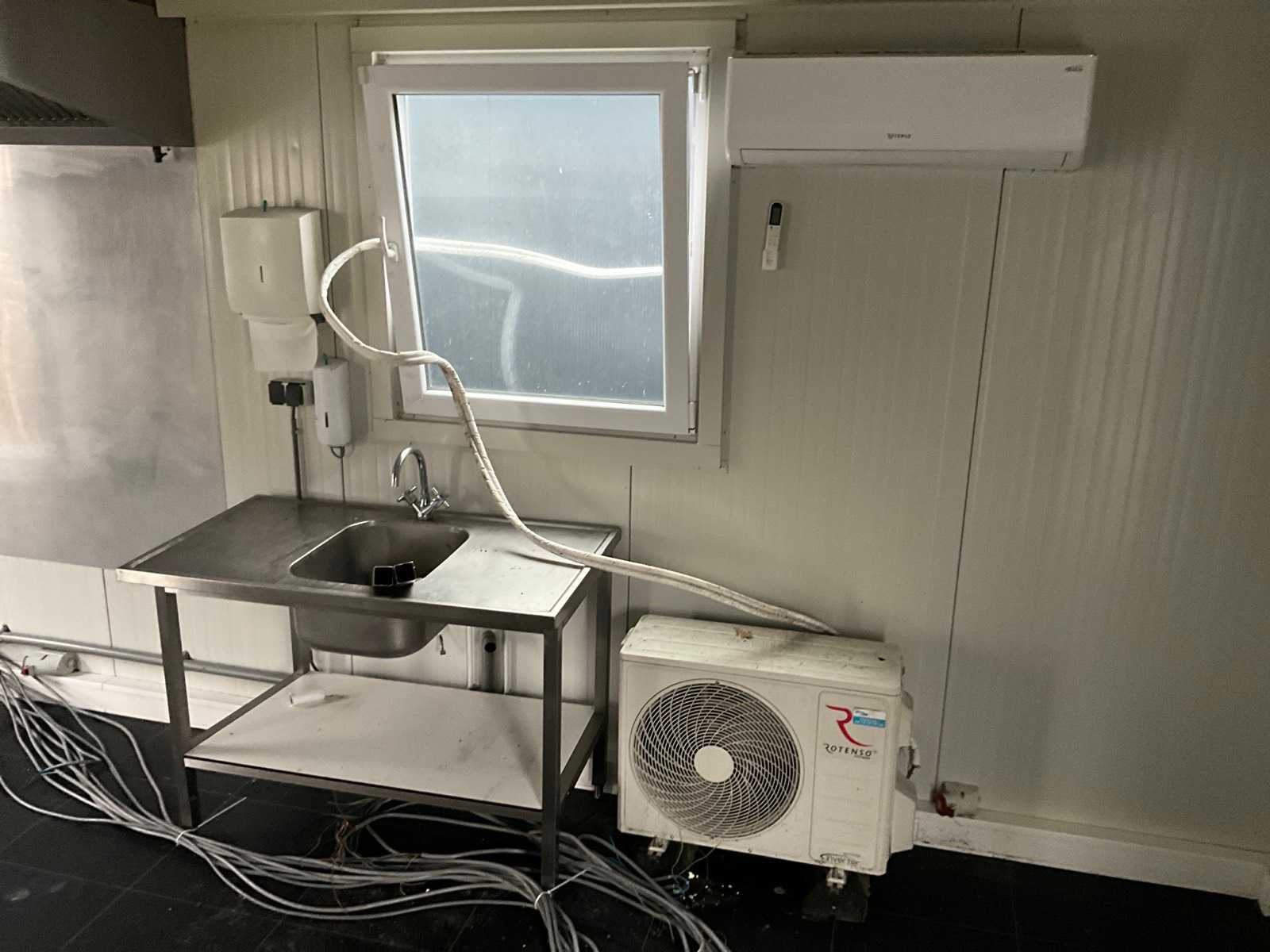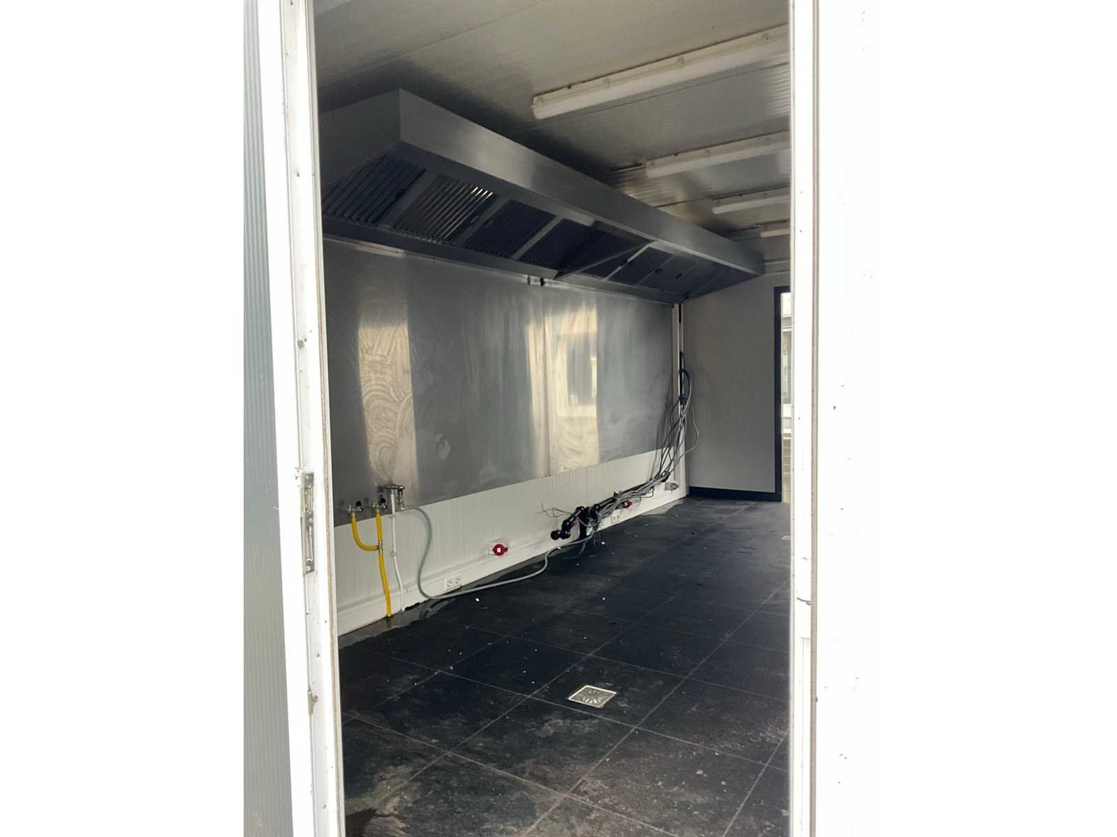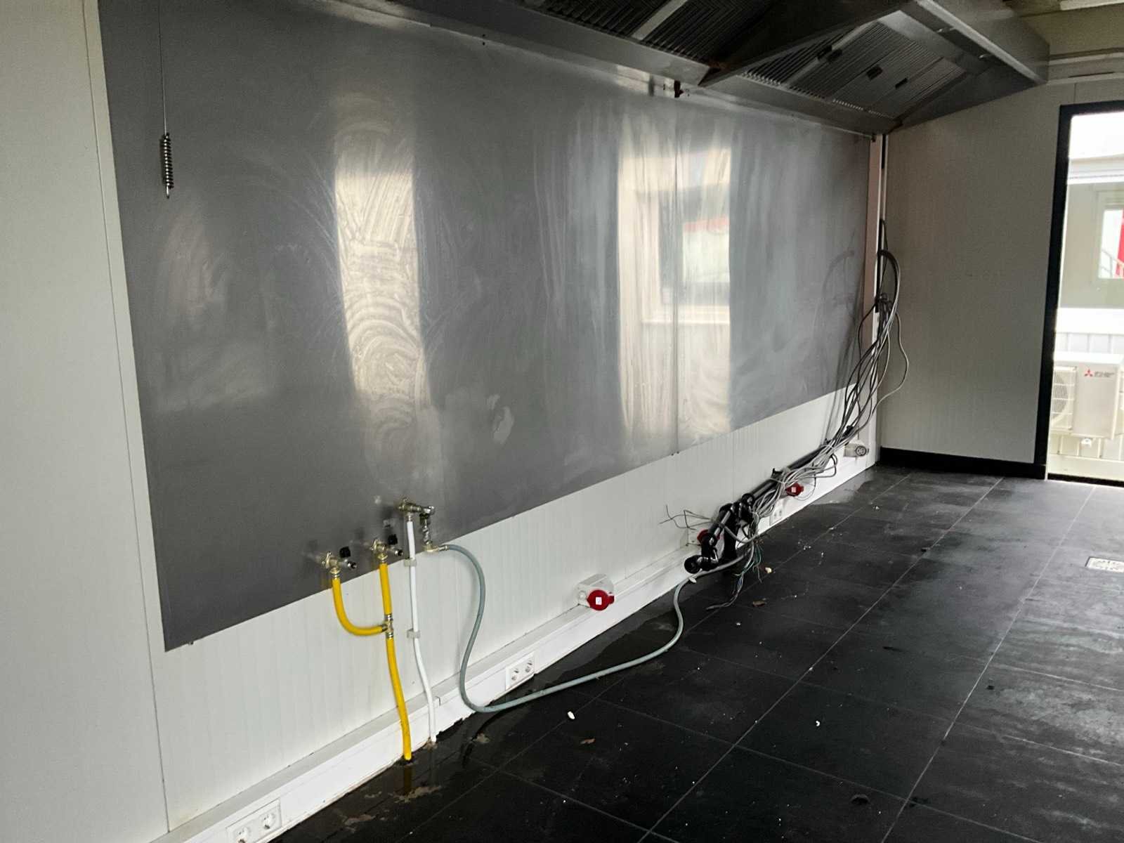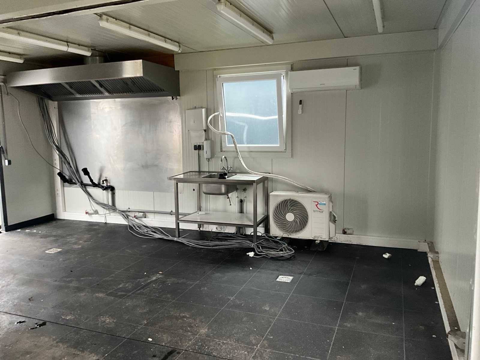 Bestaande uit: 2x geschakelde keukenunit voorzien van: 2x RVS afzuigkap, Werkbreedte circa 4500 mm en 2500 mm, airconditioning, RVS aanrecht, 10x krachtstroom aansluiting, 4x schrobput, kunststof deur en kozijn, water en gas aansluiting, groepenkast, afmeting circa: 6300x6300x3100. 1x losstaande unit voorzien: elektrische boiler “Stiebel Eltron” type: SHZ 120 Ltr LCD, krachtstroom schakel-/ groepenkast. Inclusief luchtbehandelingskast.