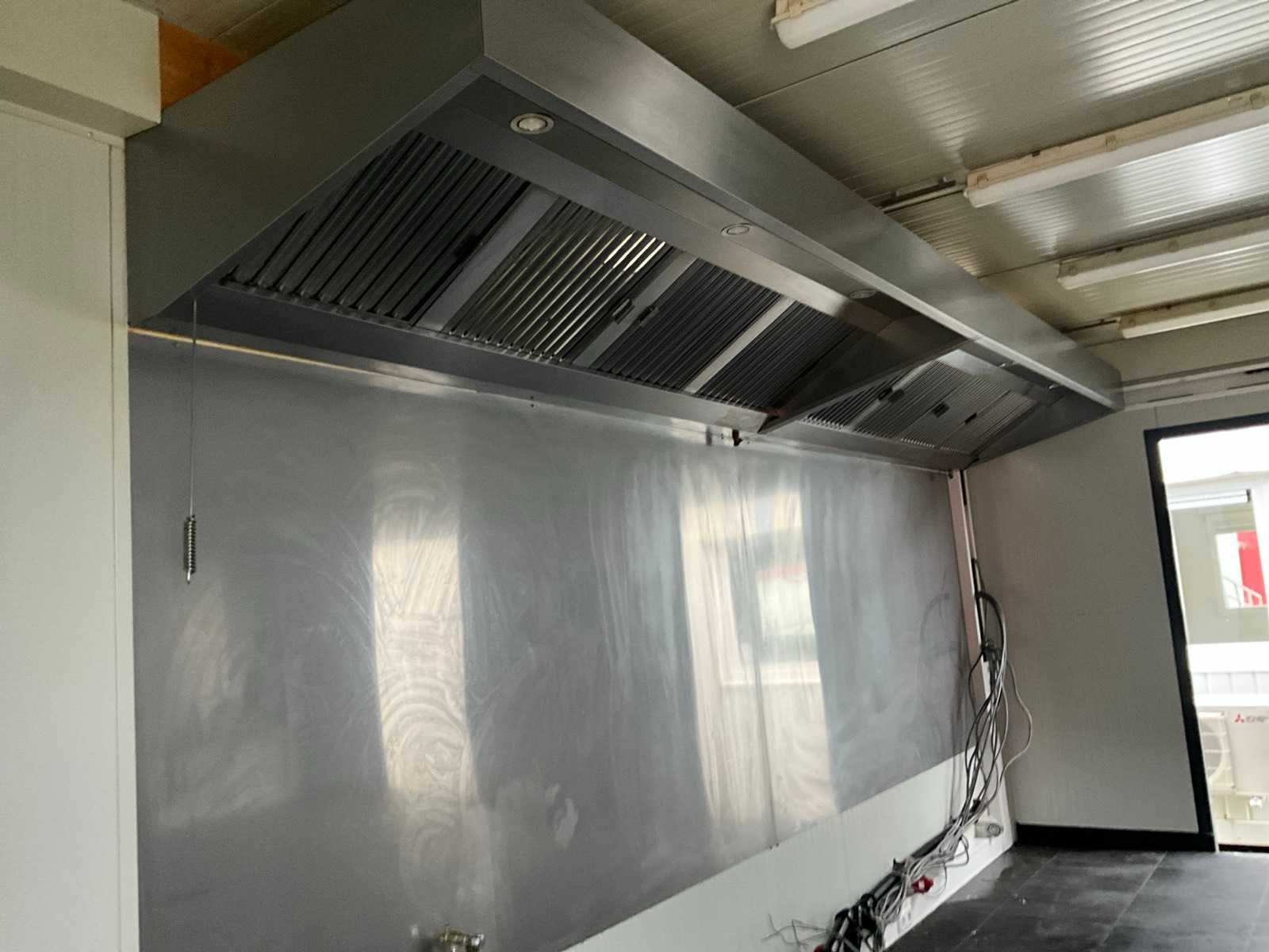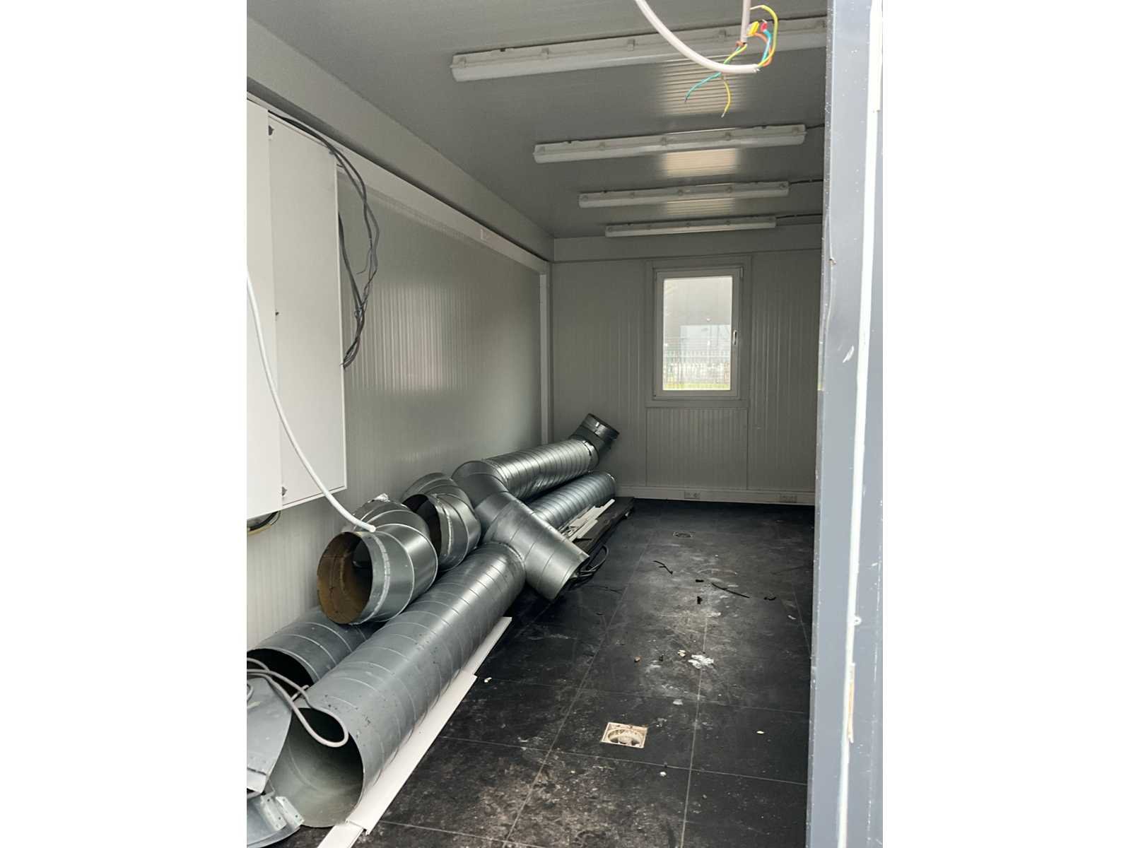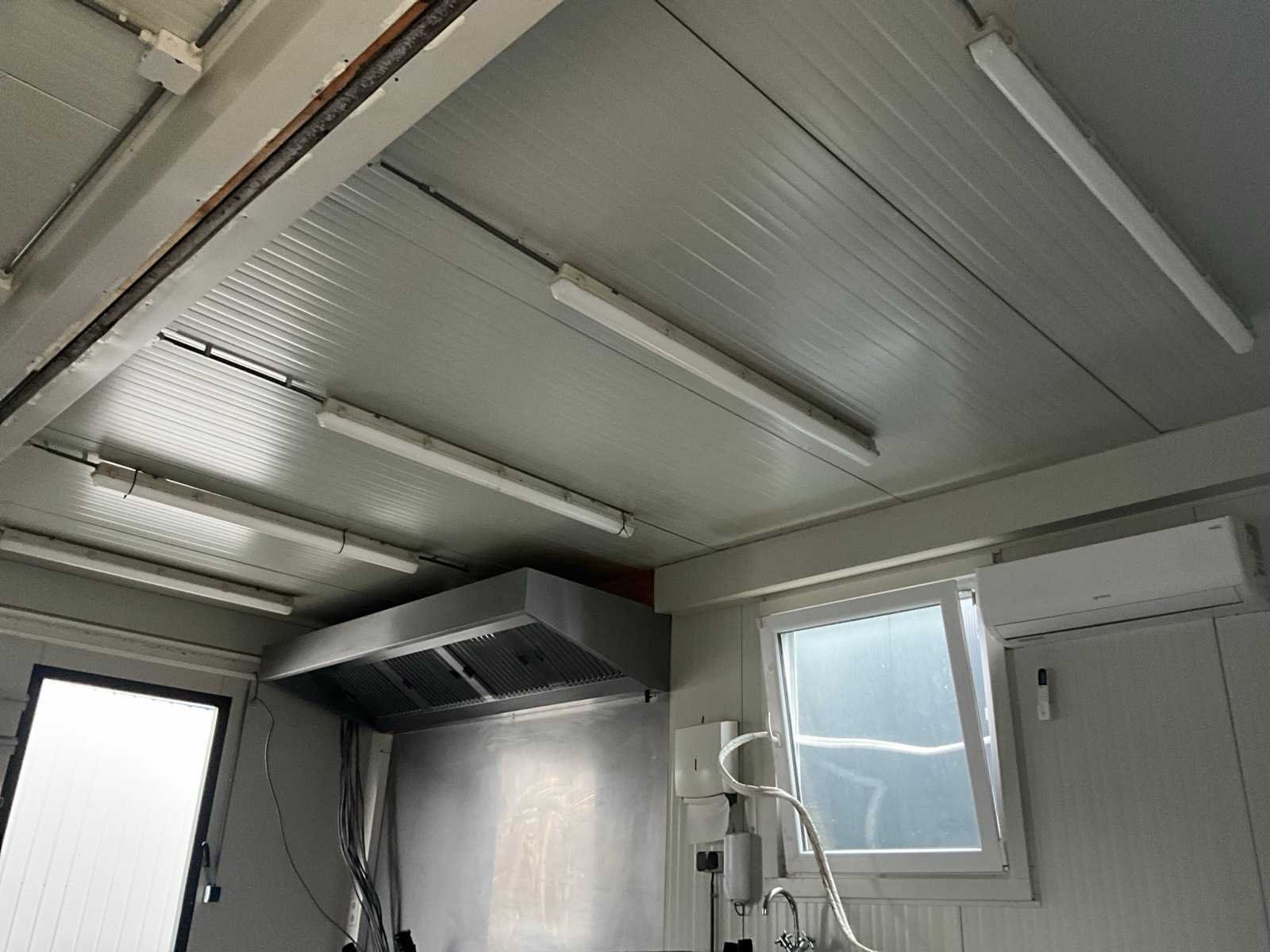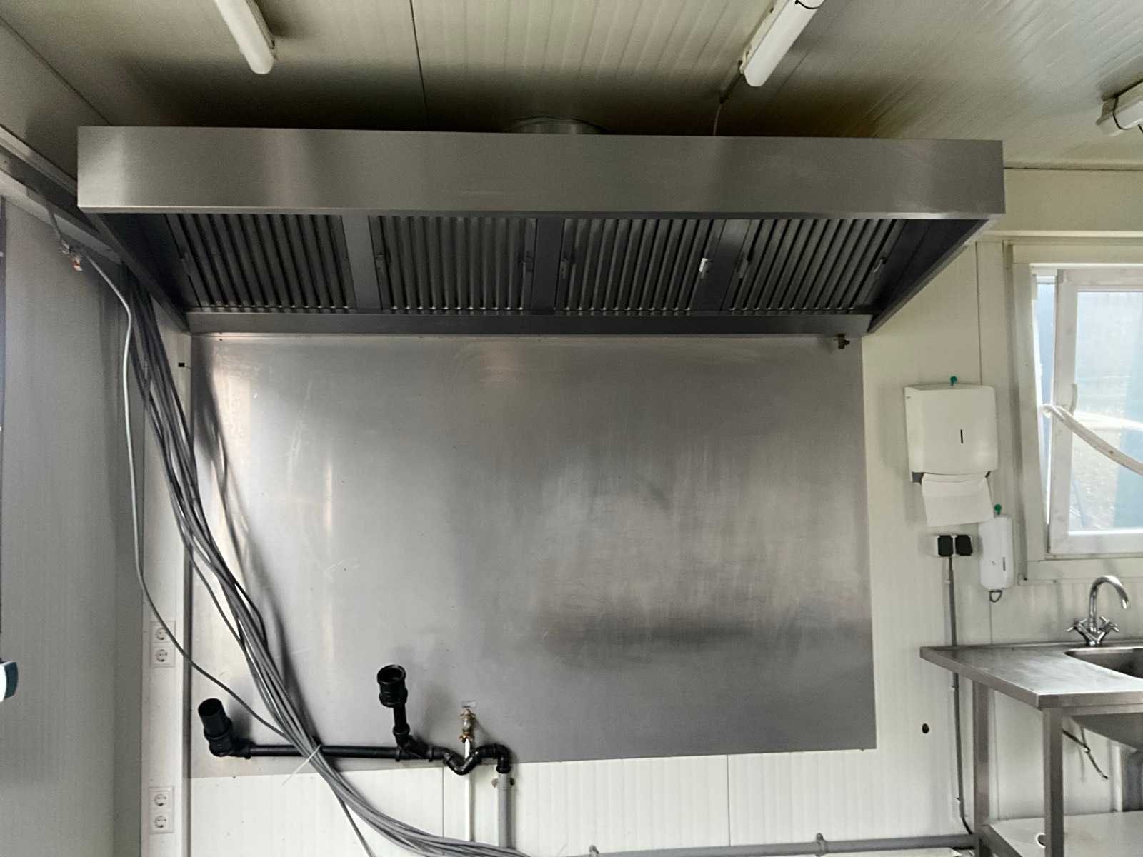 Bestaande uit: 2x geschakelde keukenunit voorzien van: 2x RVS afzuigkap, Werkbreedte circa 4500 mm en 2500 mm, airconditioning, RVS aanrecht, 10x krachtstroom aansluiting, 4x schrobput, kunststof deur en kozijn, water en gas aansluiting, groepenkast, afmeting circa: 6300x6300x3100. 1x losstaande unit voorzien: elektrische boiler “Stiebel Eltron” type: SHZ 120 Ltr LCD, krachtstroom schakel-/ groepenkast. Inclusief luchtbehandelingskast.
