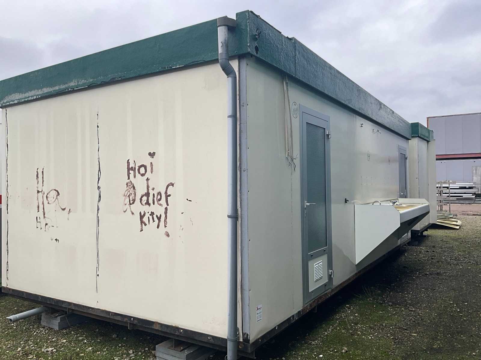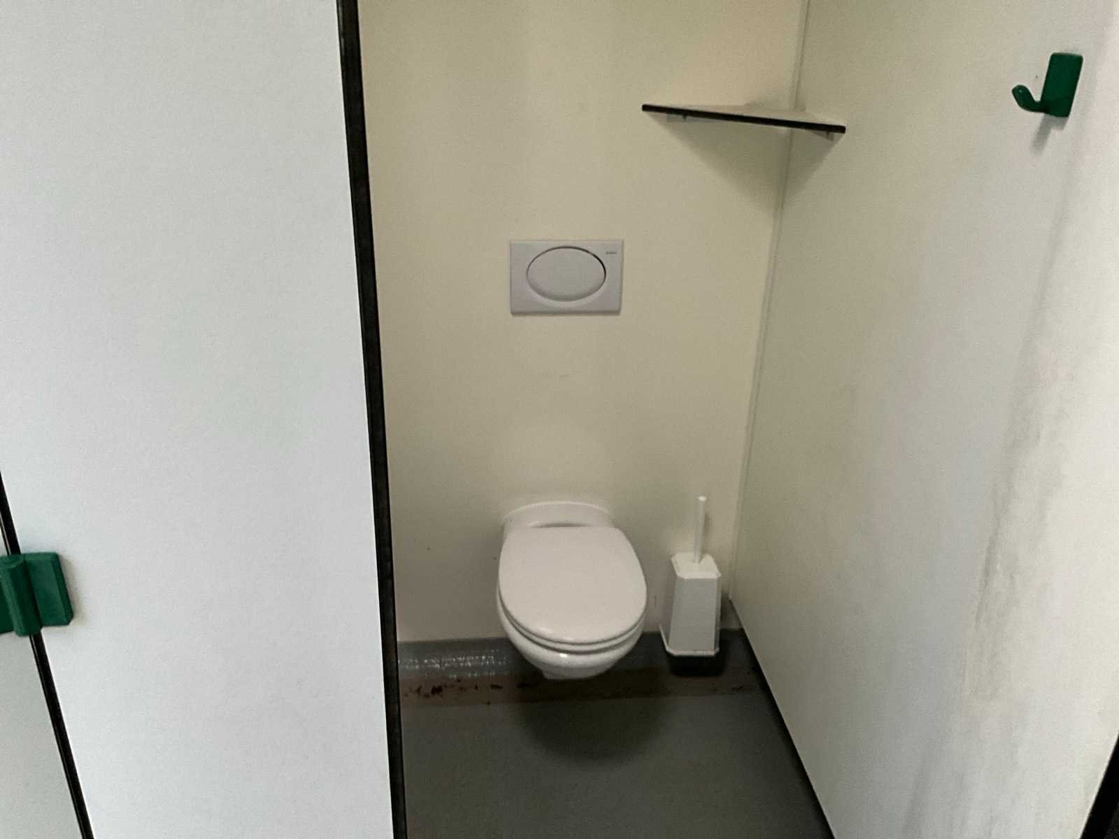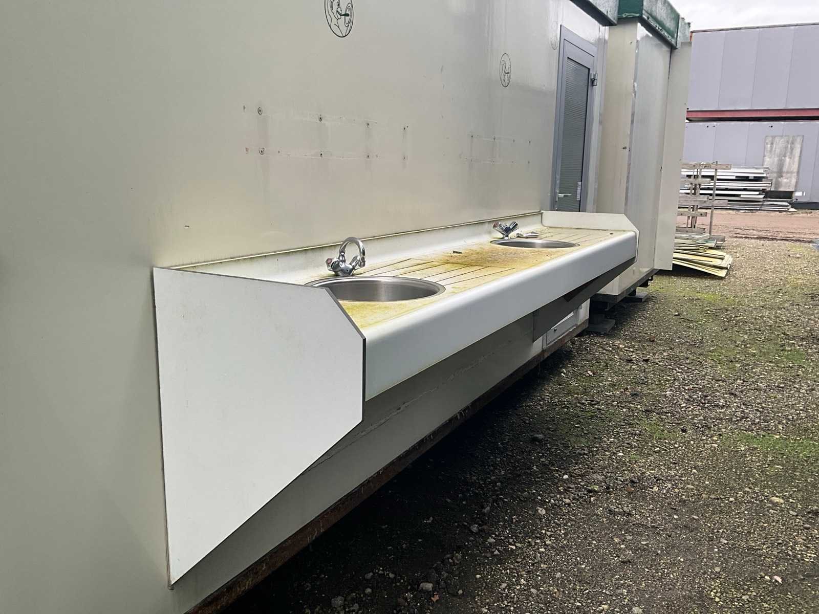 Voorzien van 2x doucheruimte 4x toiletruimte. 2X wastafel 1x binnen 1x buitenzijde let op totale breedte met buiten wastafel 450cm, AO SMITH innovo gasgestookte boiler, mechanische afzuiging Totale afmeting L: 7850mm Totale afmeting Breedte: 3800mm Totale afmeting Hoogte: 3100mm