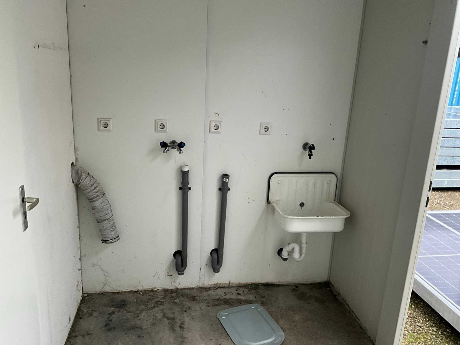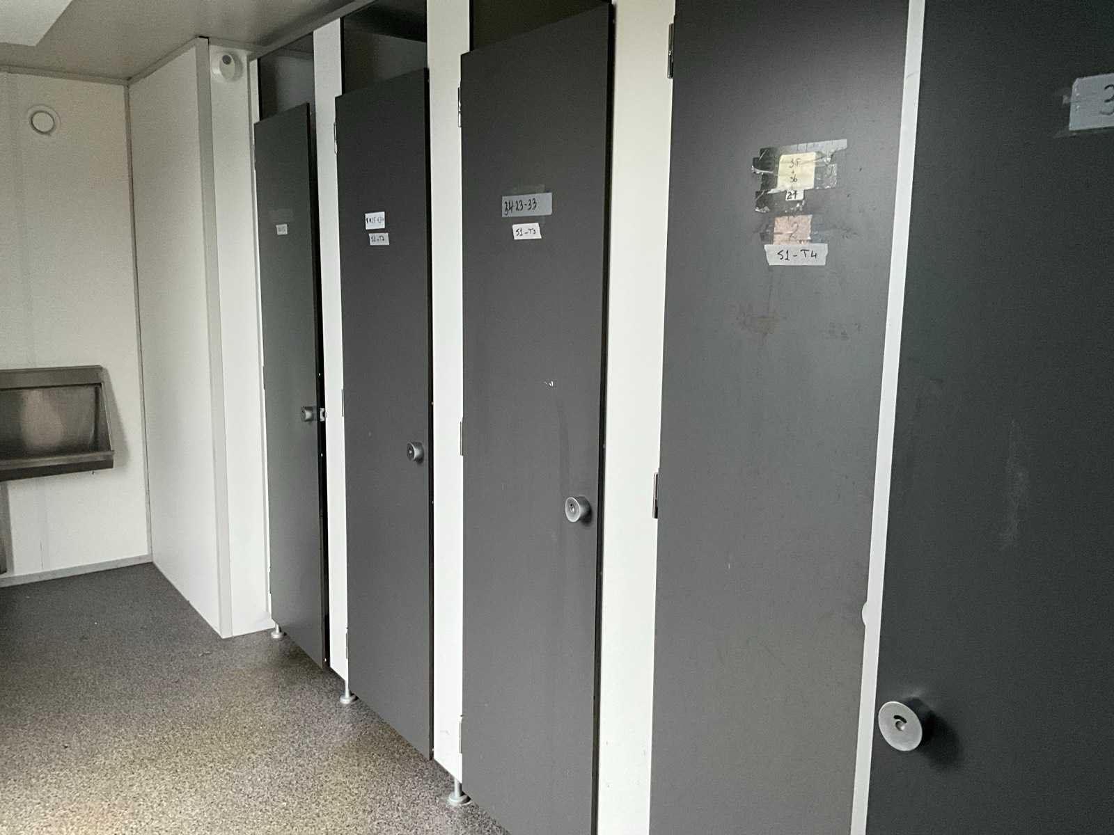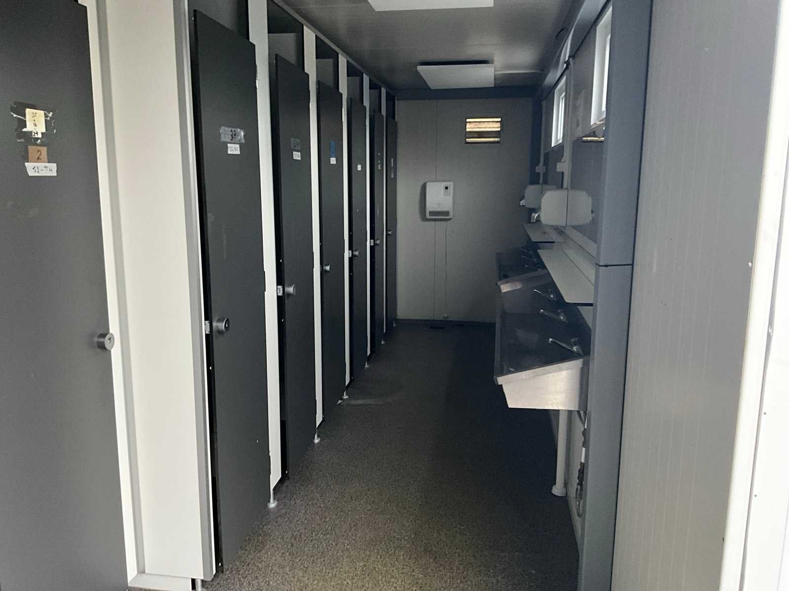 Voorzien van 4X toiletruimte, 1x urinoir, 6X doucheruimte, 2x rvs wasbak, 2x handdroger. Mechanische afzuiging, water buffervat, opslagruimte Totale afmeting L: 14800mm Totale afmeting Breedte: 3500mm Totale afmeting Hoogte: 3000mm