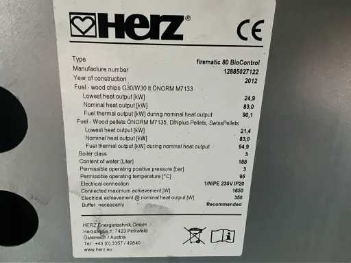 De silo van kavel 239 kan gecombineerd worden met deze kavel Merk: Herz Type: BioControl 3000 Serienummer: 12885027122 Vrijstaand: true Vermogen: 83kW Lengte: 1700 Breedte: 1500 Hoogte: 1700