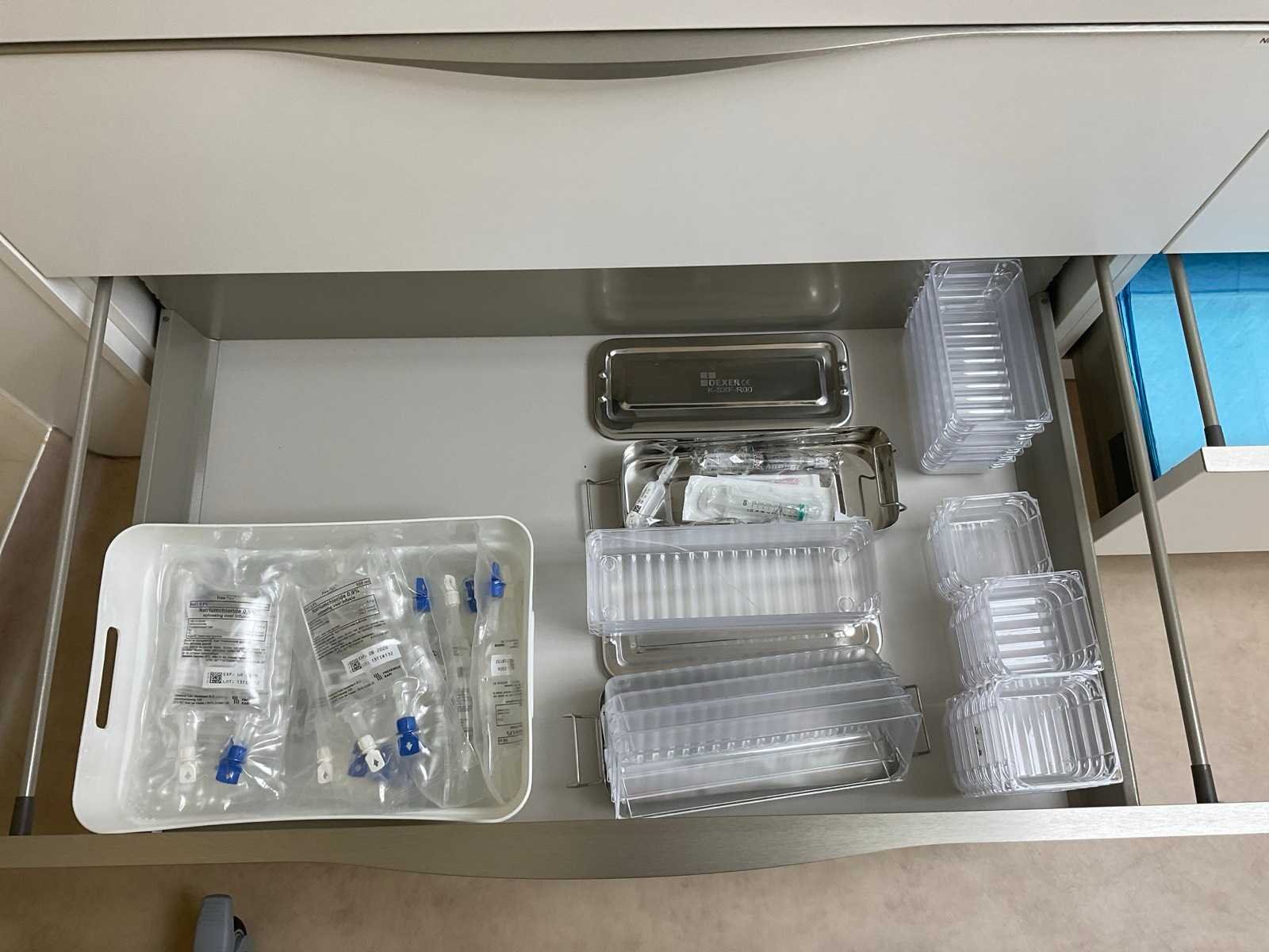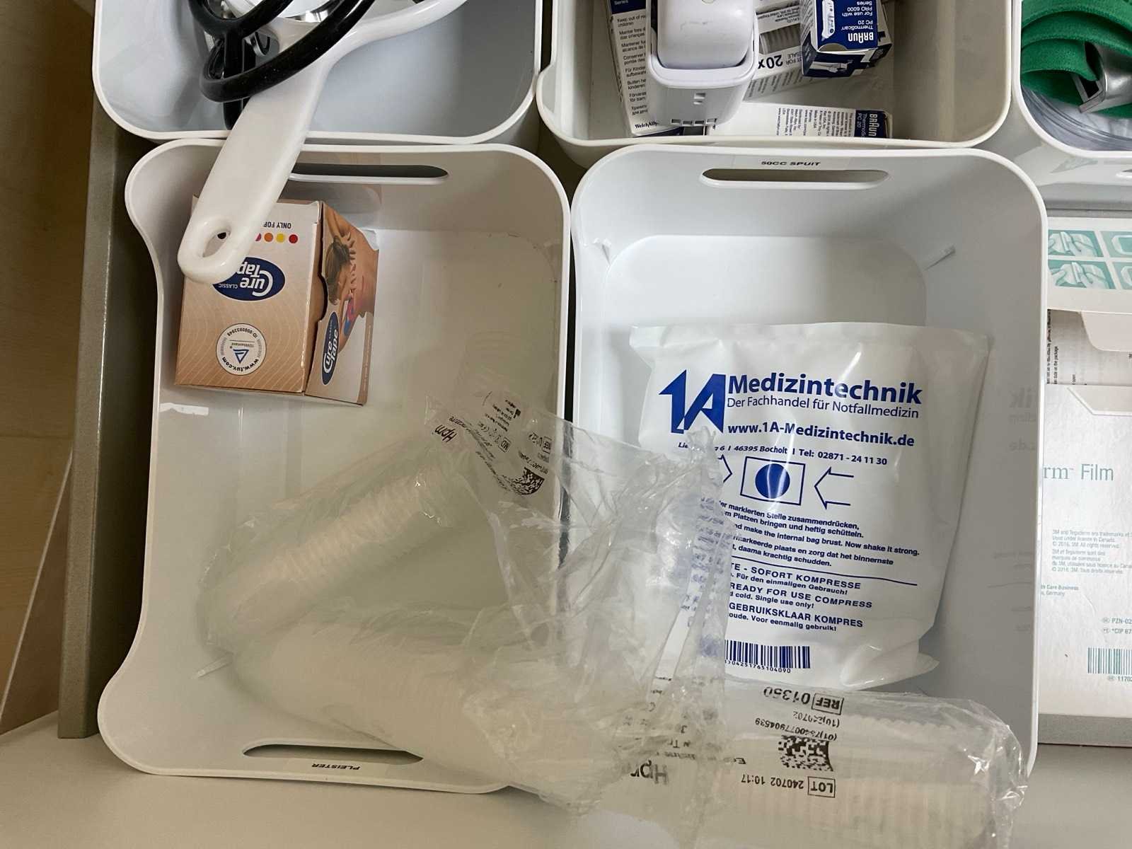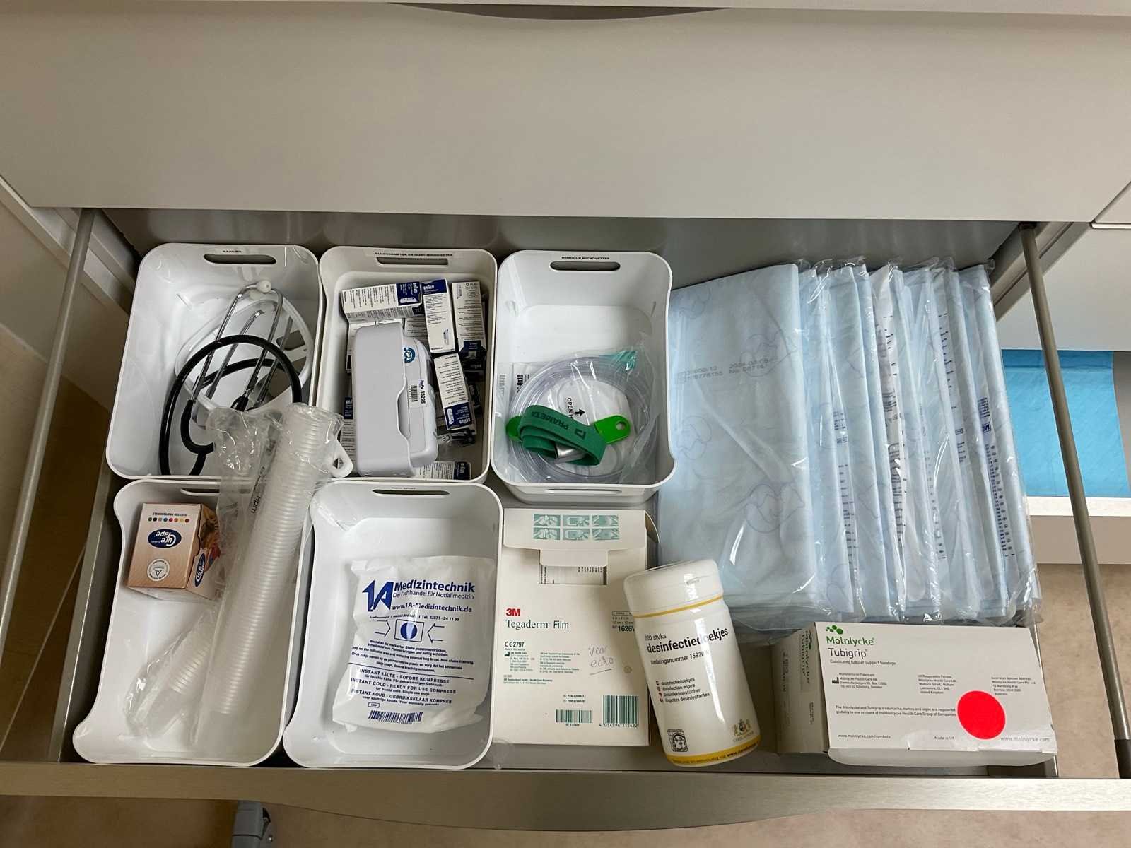 Inhoud lades bestaande o.a. uit spoelspuiten, driewegkraan, injectienaalden, oorthermometer, stethoscoop en oplossing voor infusie.
