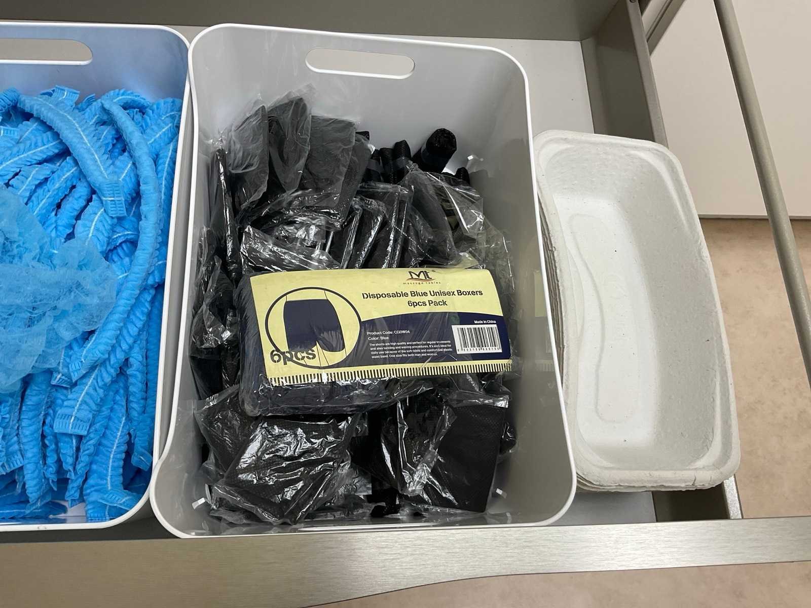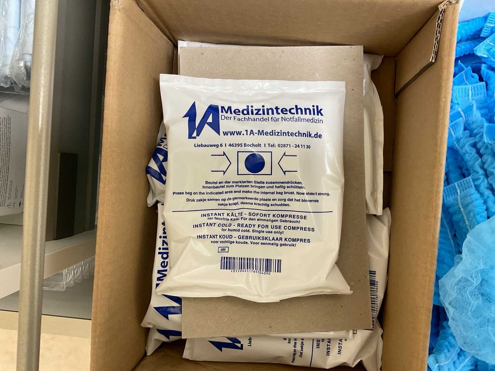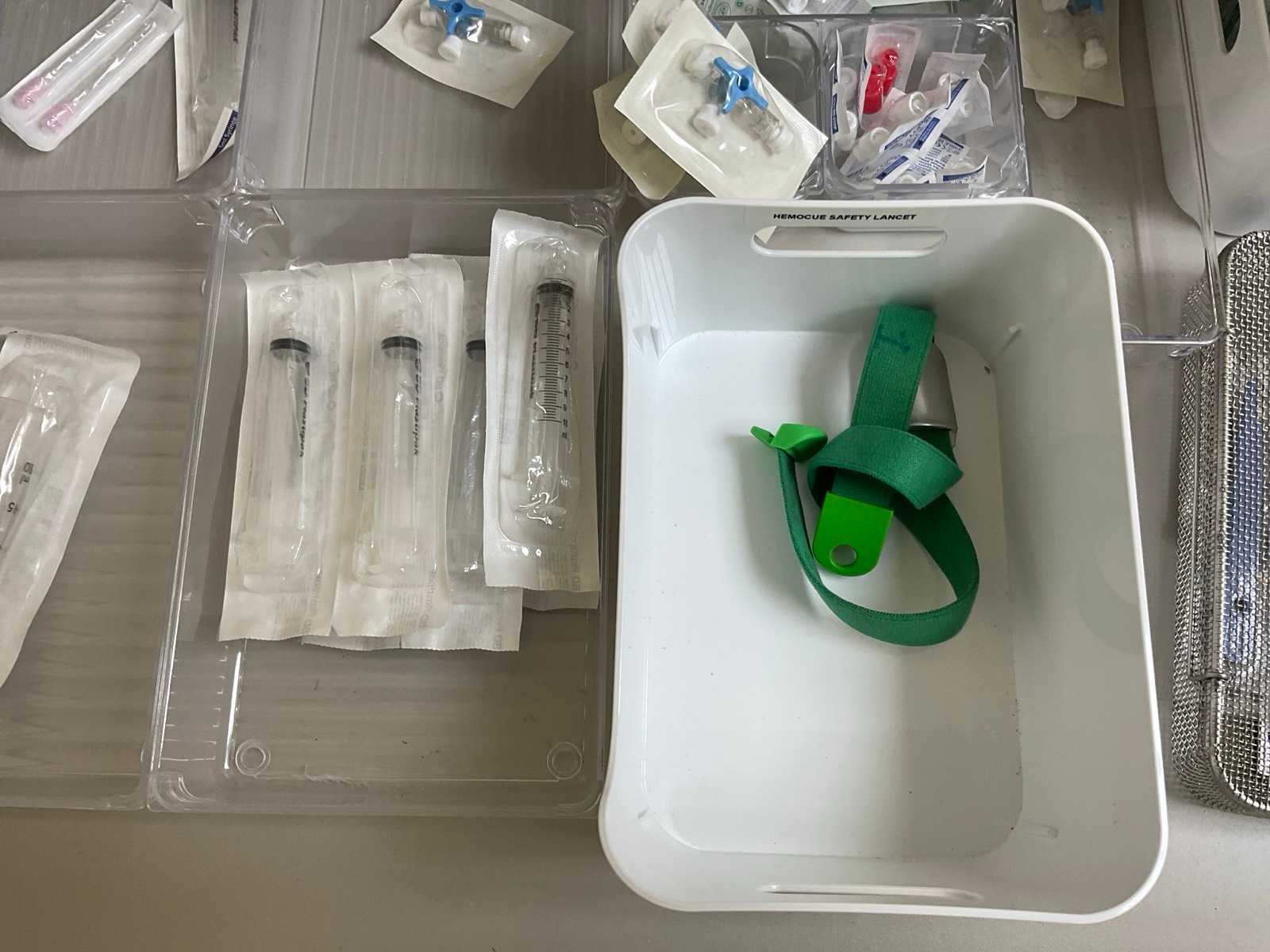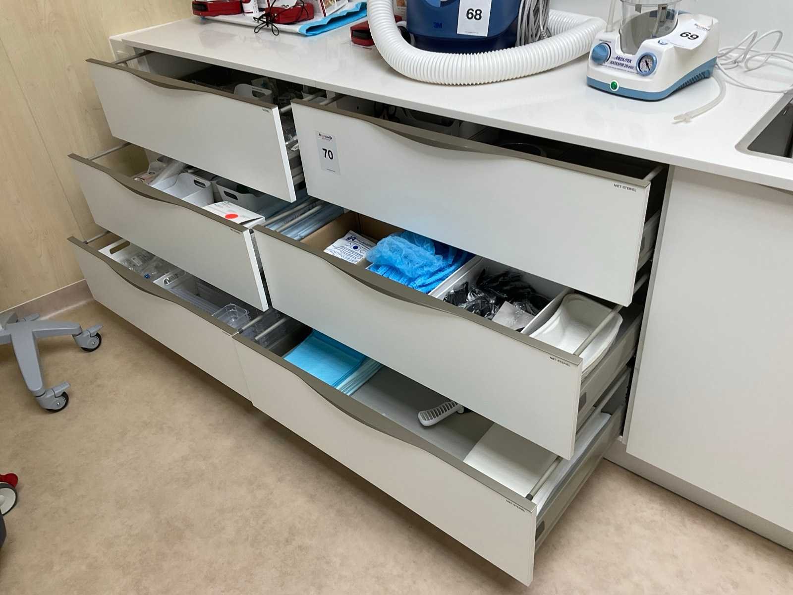 Inhoud lades bestaande o.a. uit spoelspuiten, driewegkraan, injectienaalden, oorthermometer, stethoscoop en oplossing voor infusie.