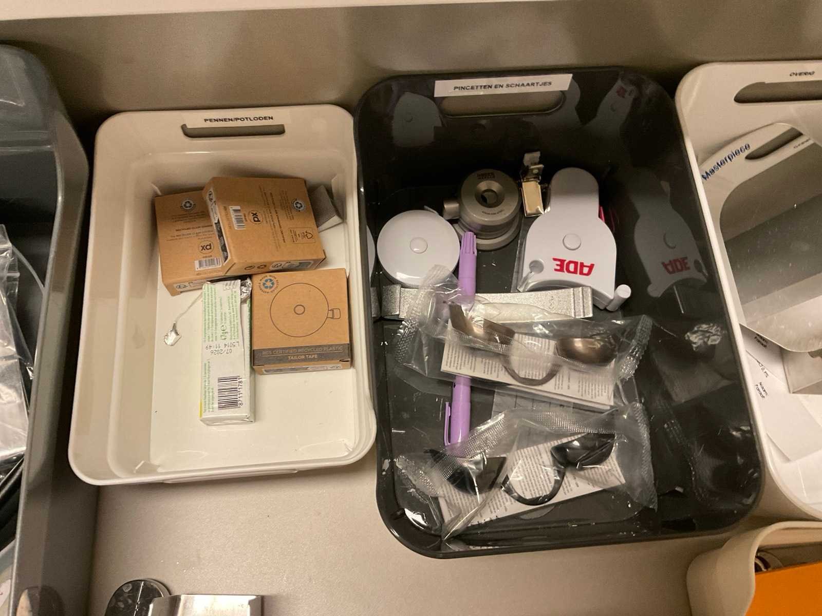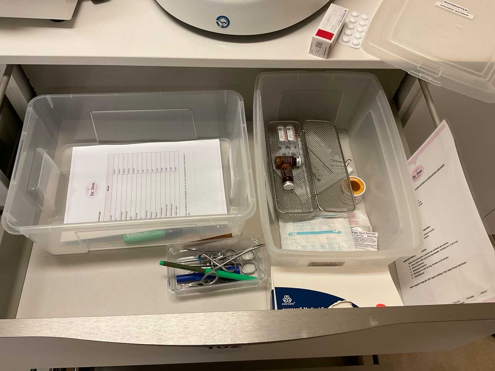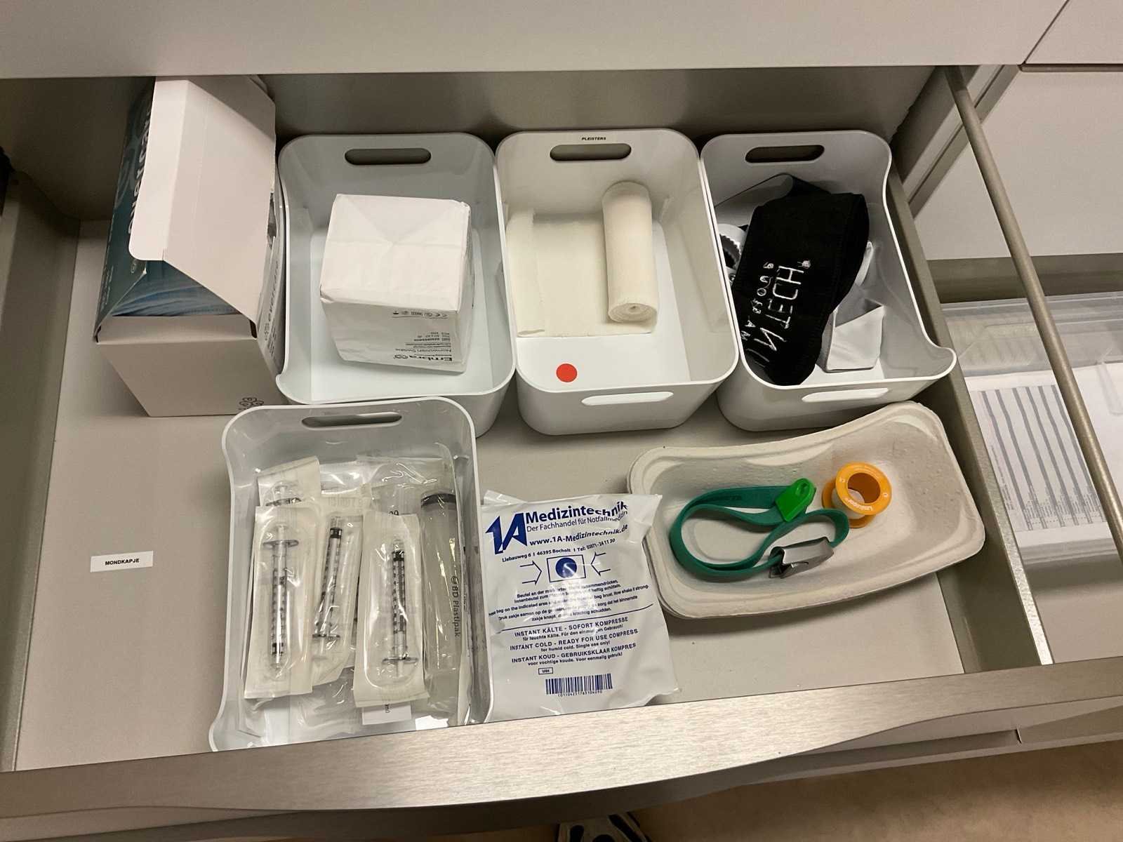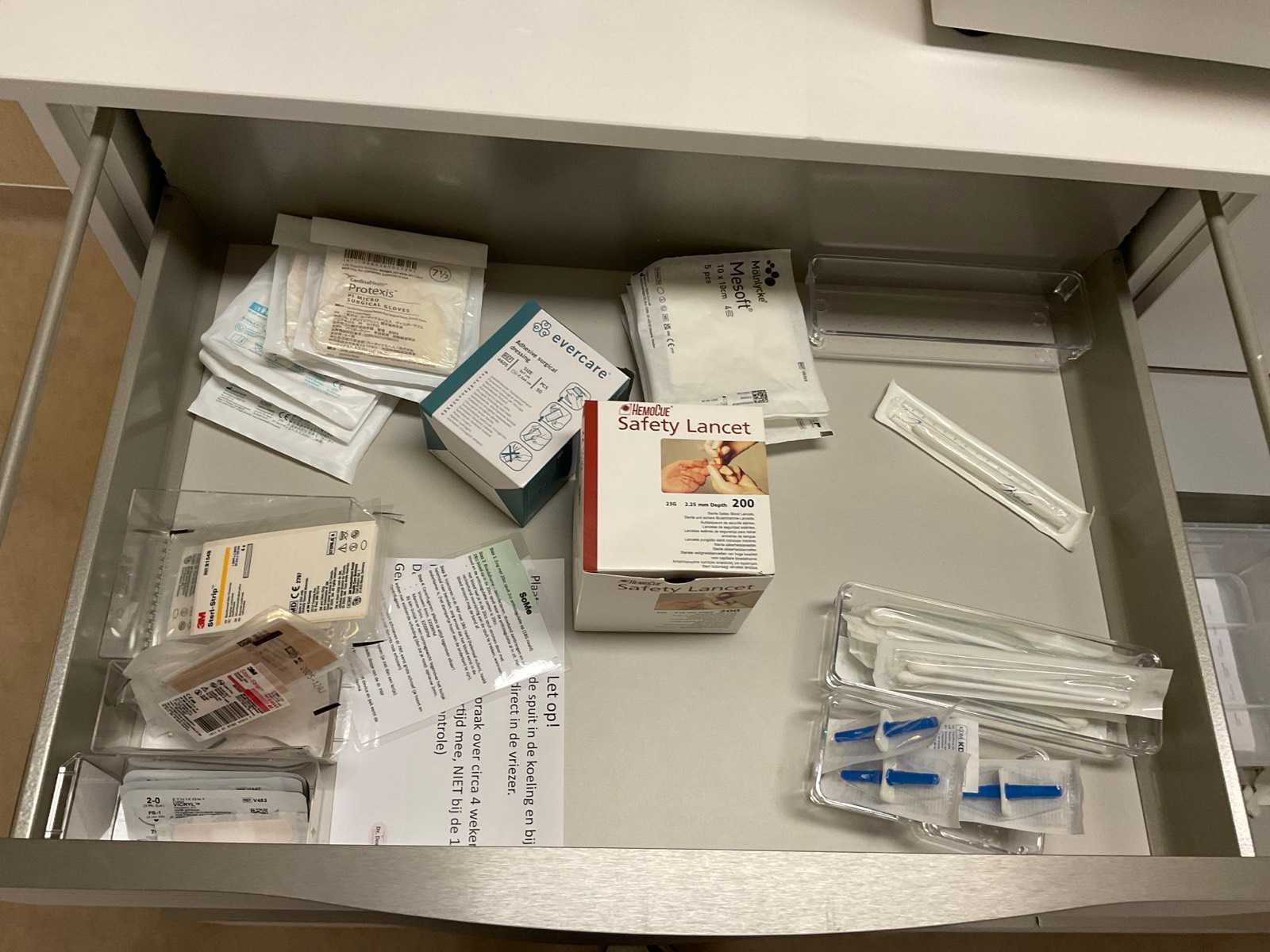 Inhoud van aanrechtblok bestaande uit diverse medische benodigdheden.