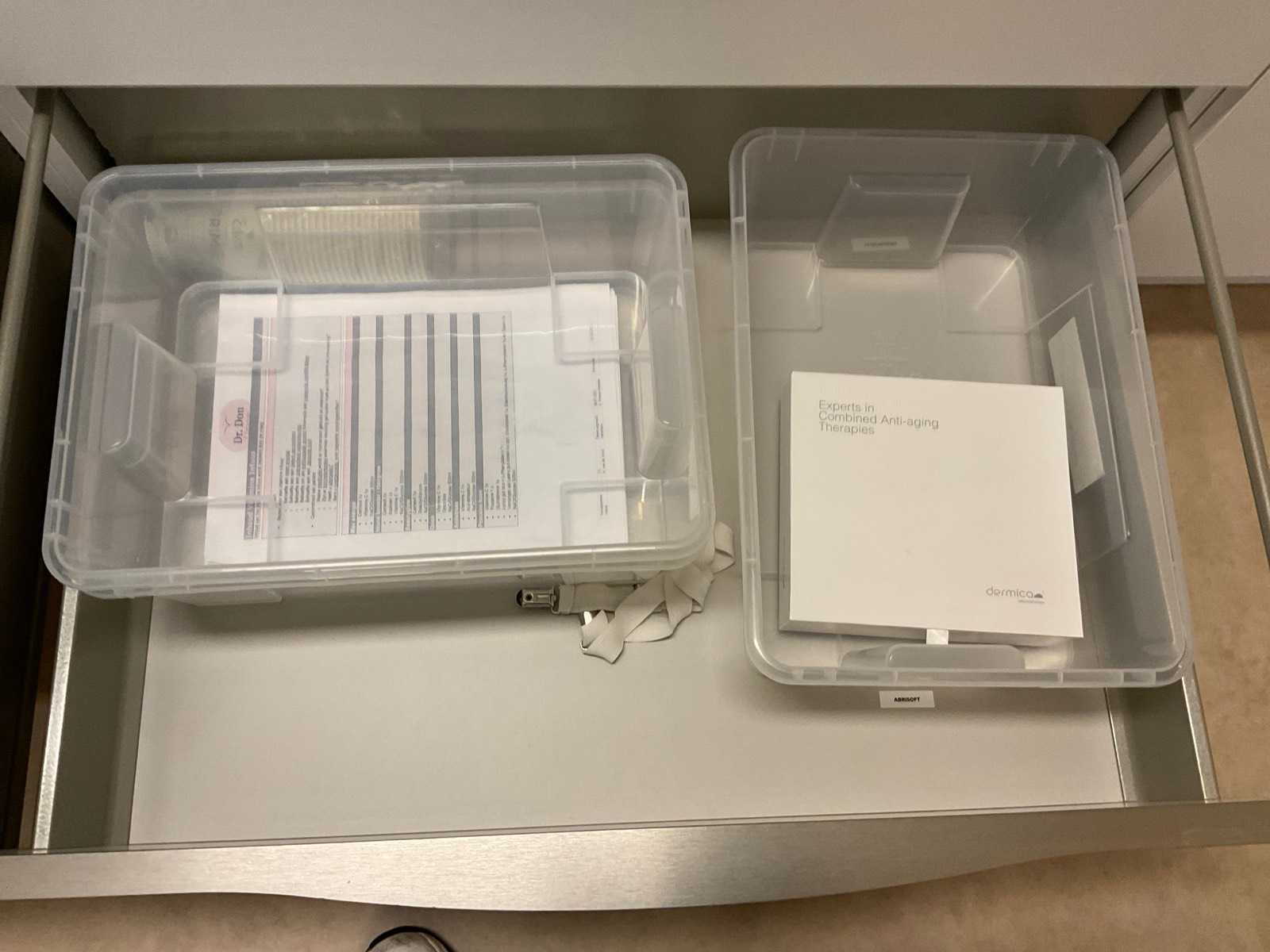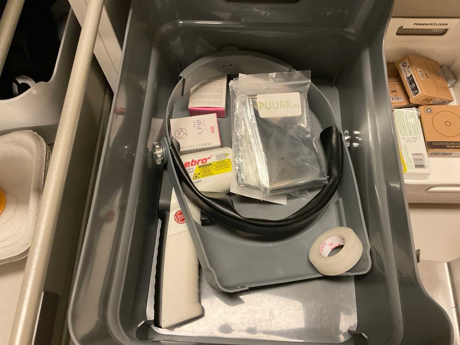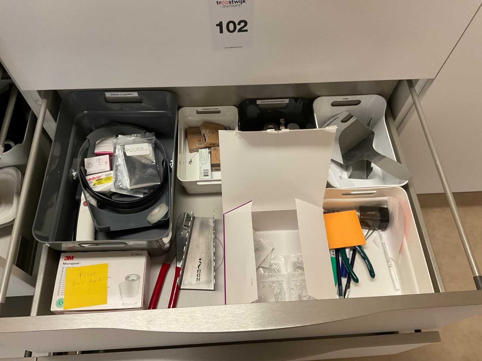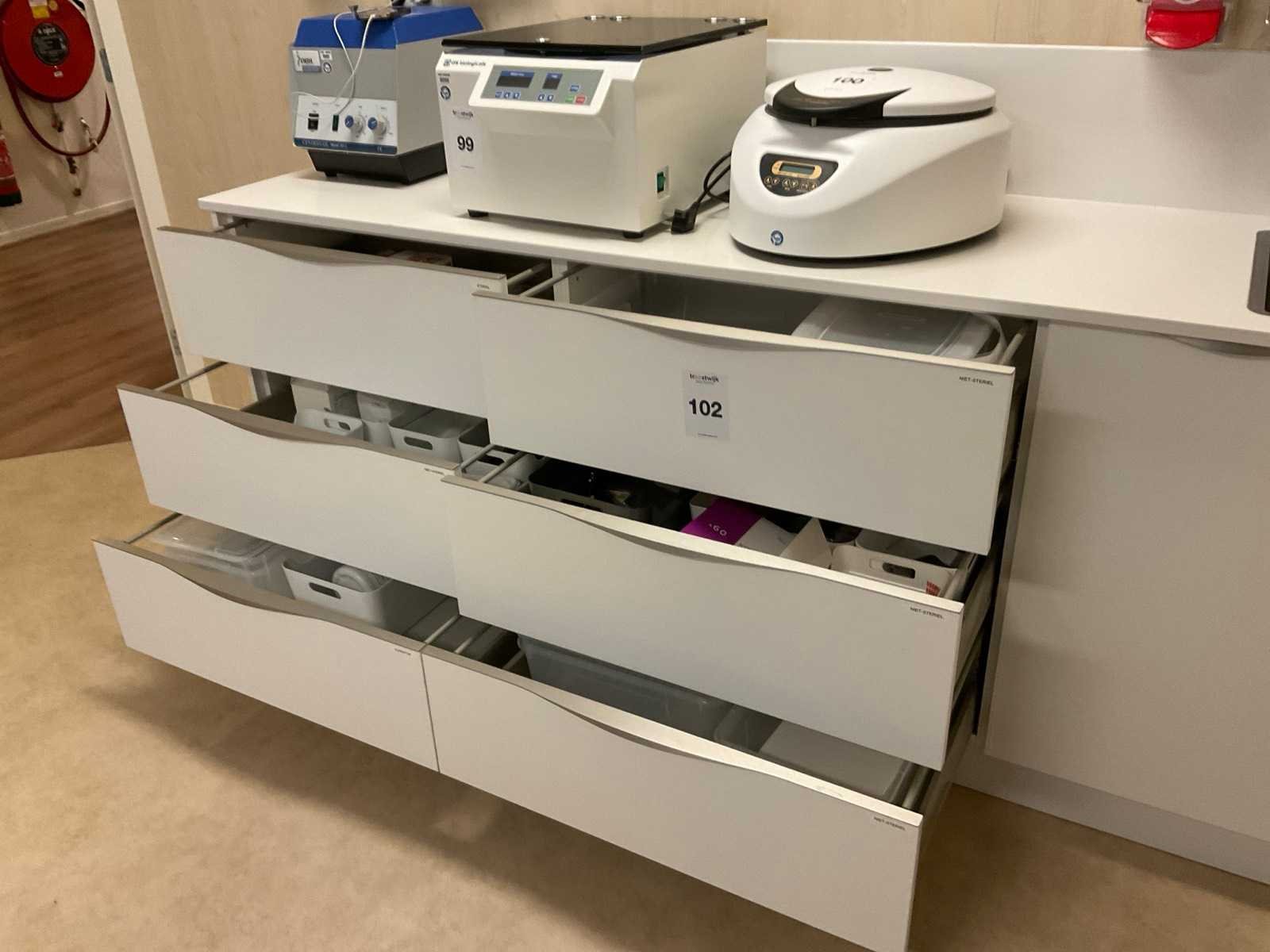 Inhoud van aanrechtblok bestaande uit diverse medische benodigdheden.