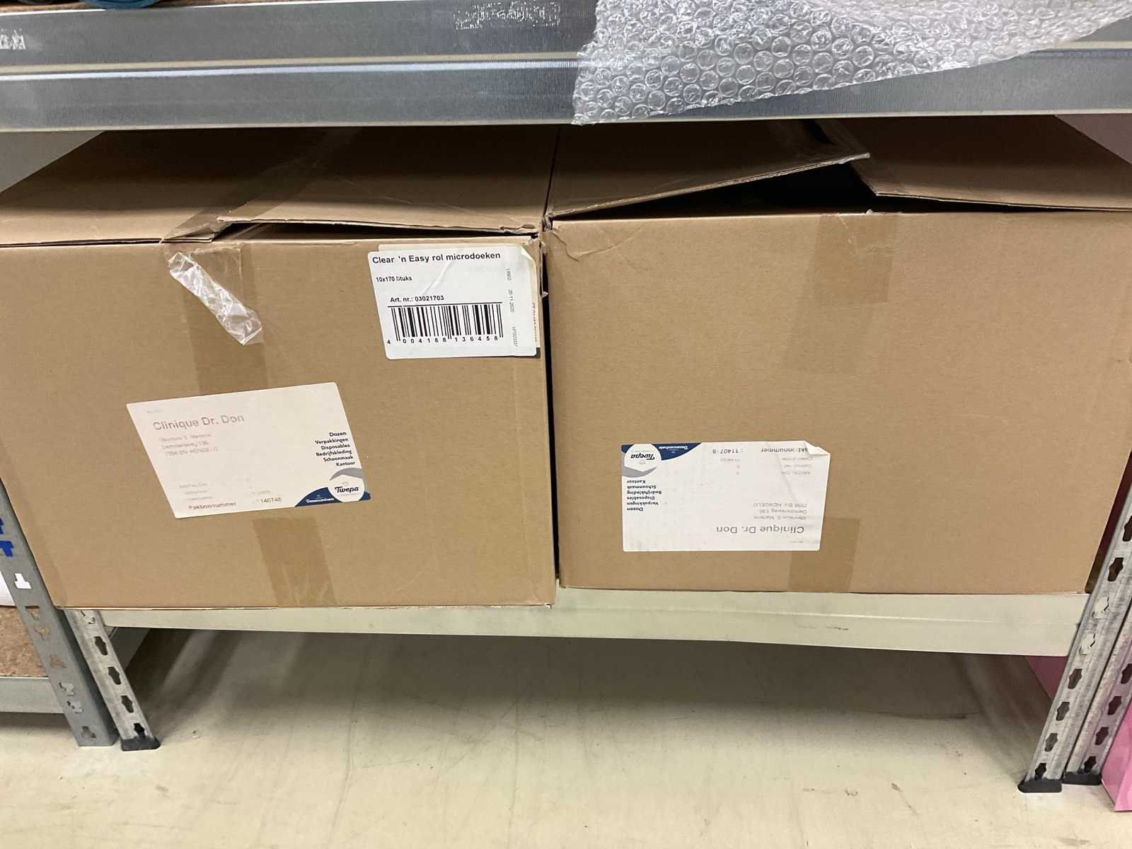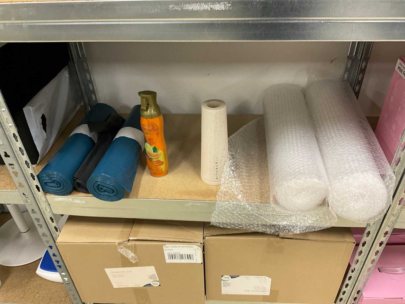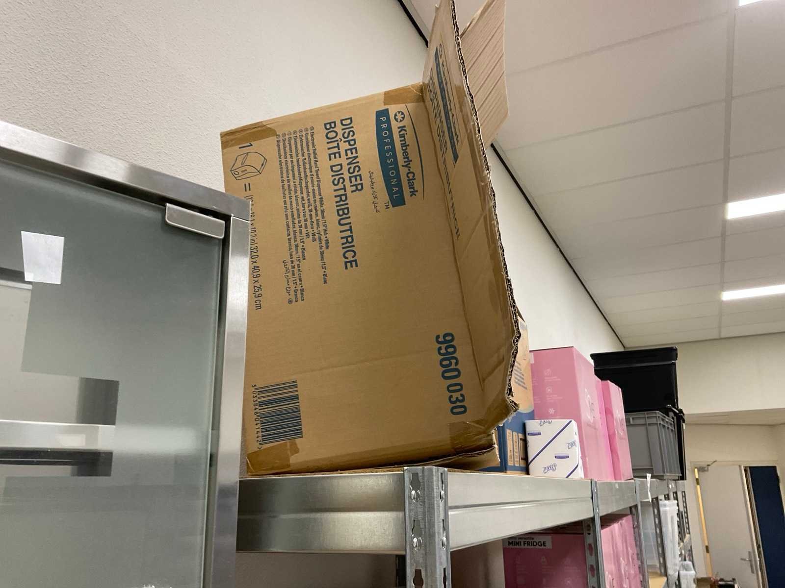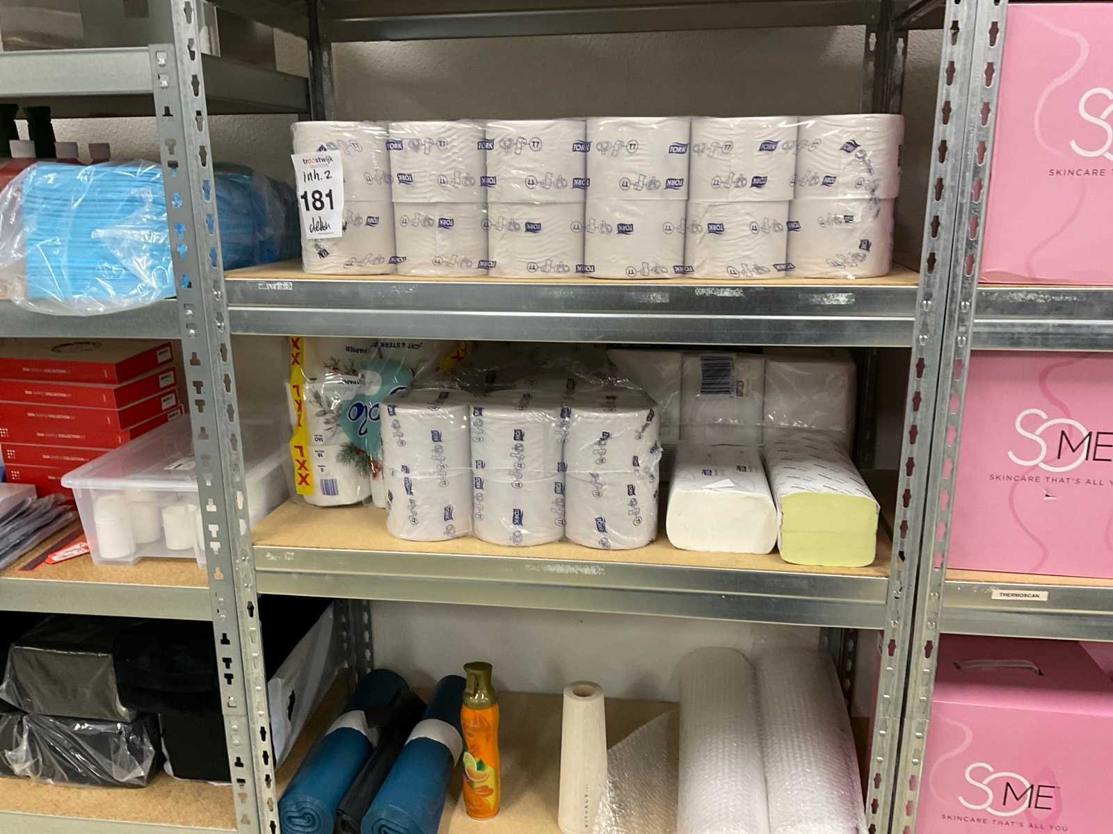 De inhoud van 2 stellingen, bestaande uit oa: automatische papier dispenser, papier, microdoeken, desinfectiemiddel, kussens, scheermesjes, medicijn kasten, toiletpapier en dispenser Merk: Kimberly Clark, Scott