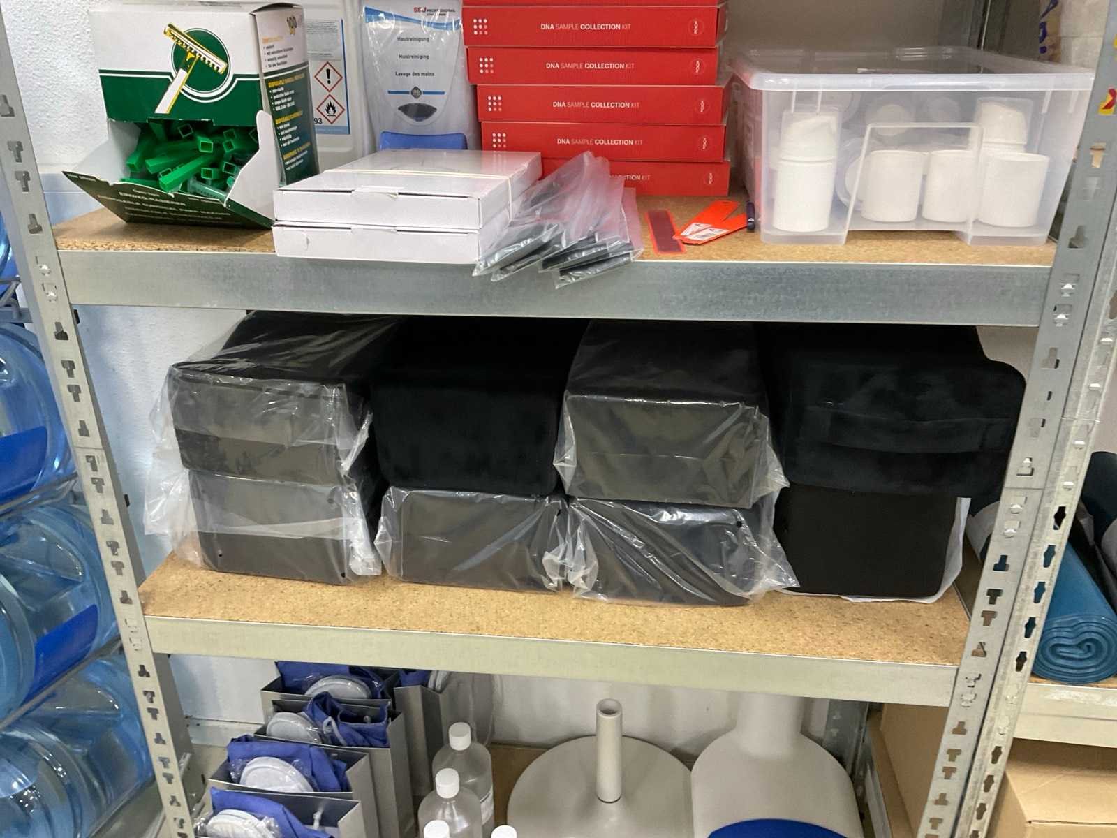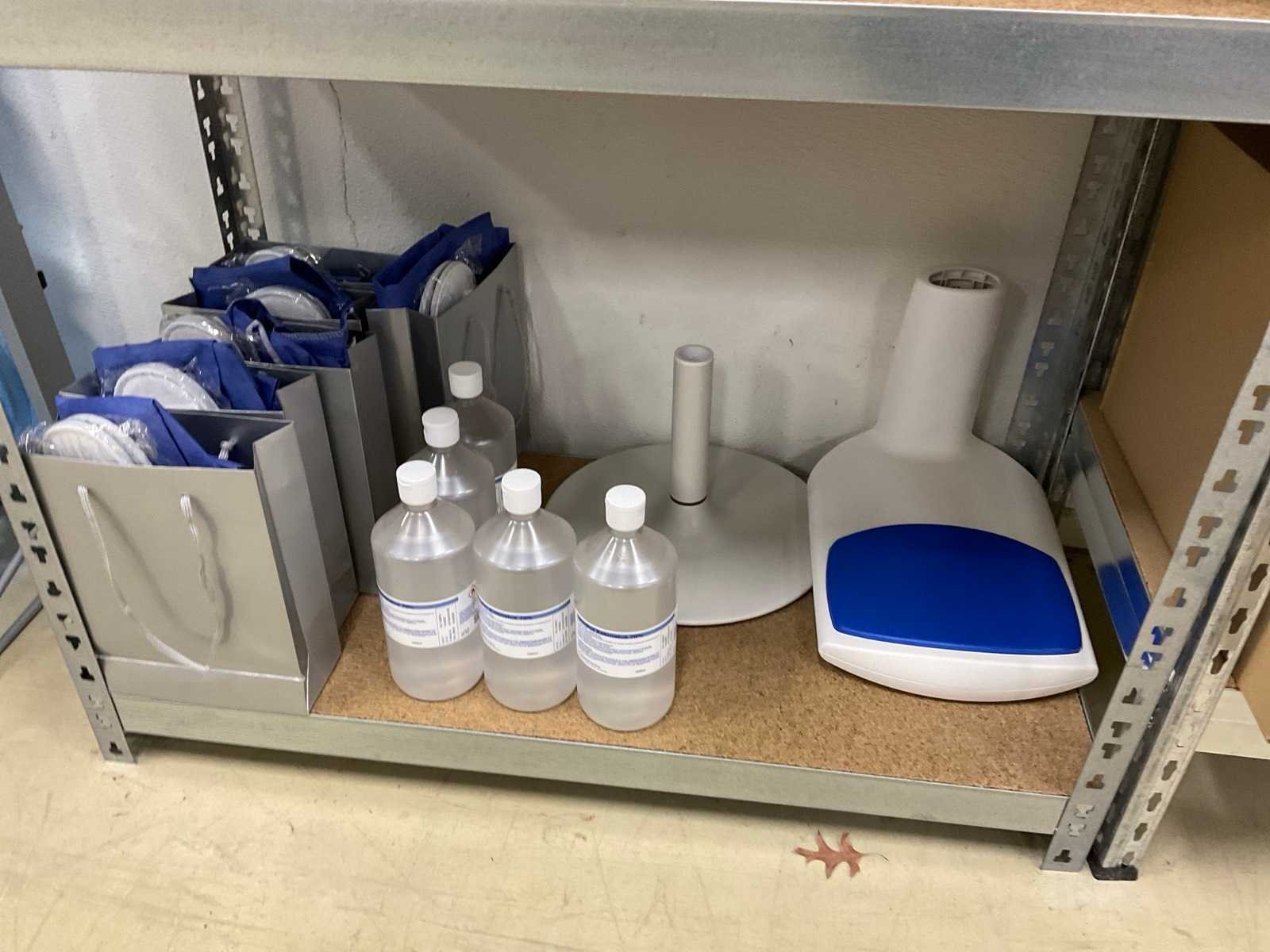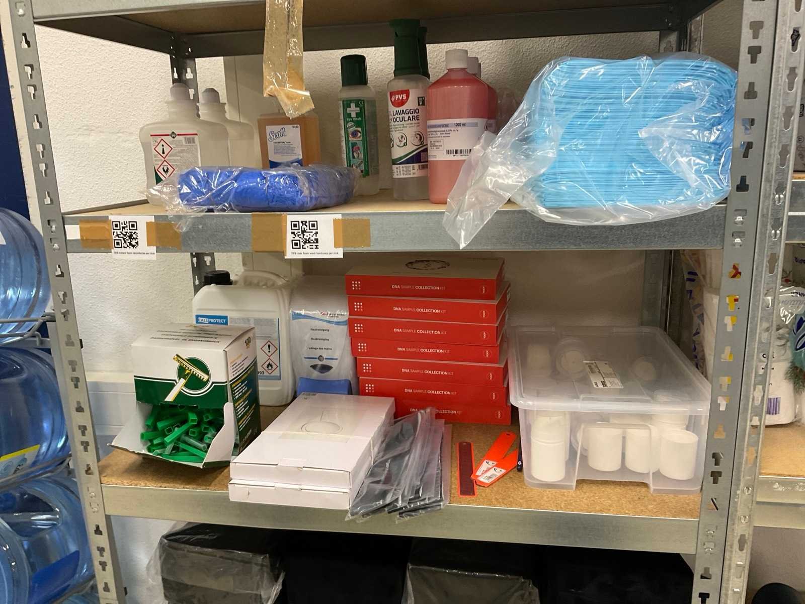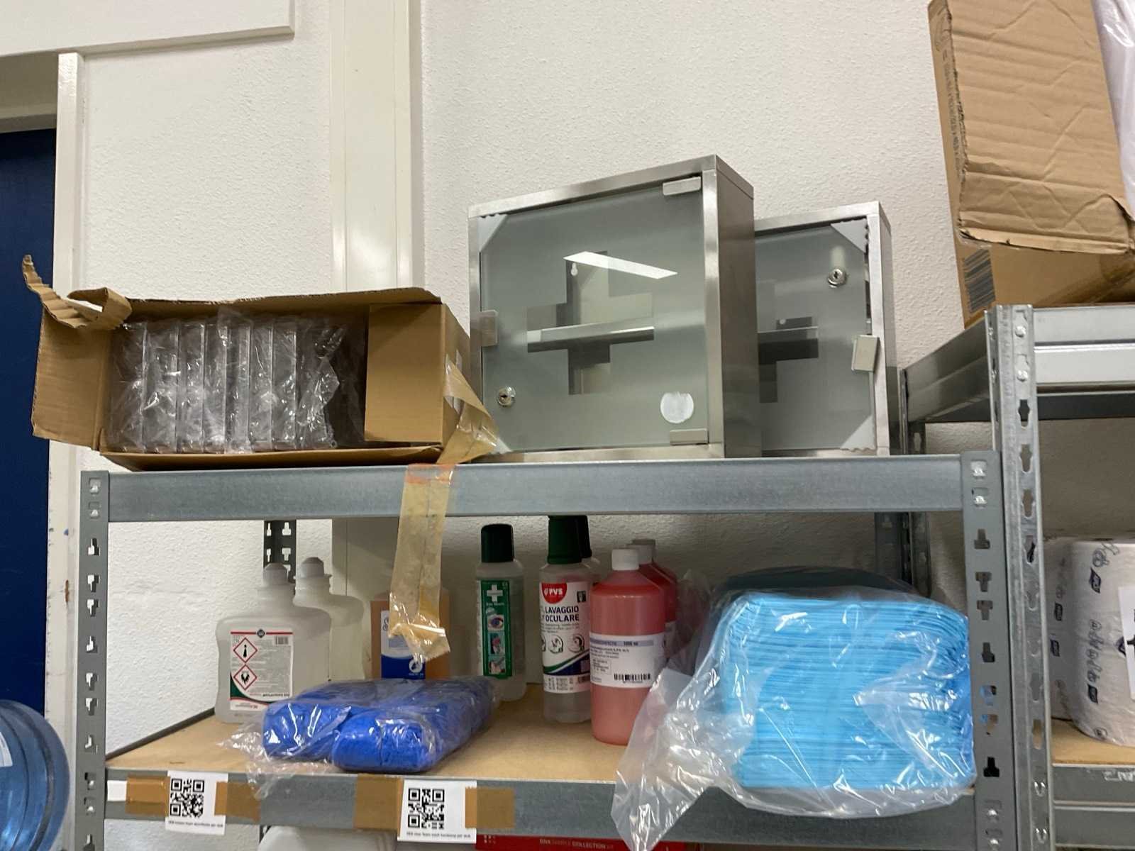 De inhoud van 2 stellingen, bestaande uit oa: automatische papier dispenser, papier, microdoeken, desinfectiemiddel, kussens, scheermesjes, medicijn kasten, toiletpapier en dispenser Merk: Kimberly Clark, Scott
