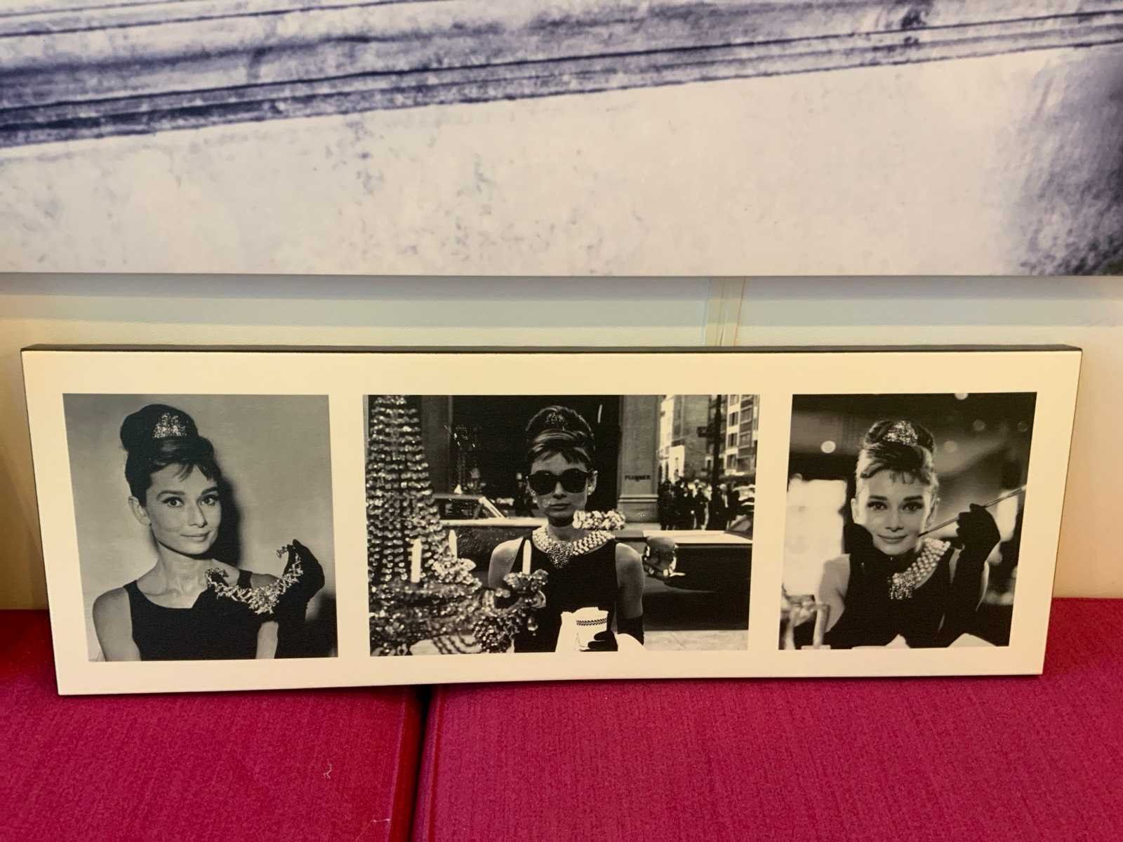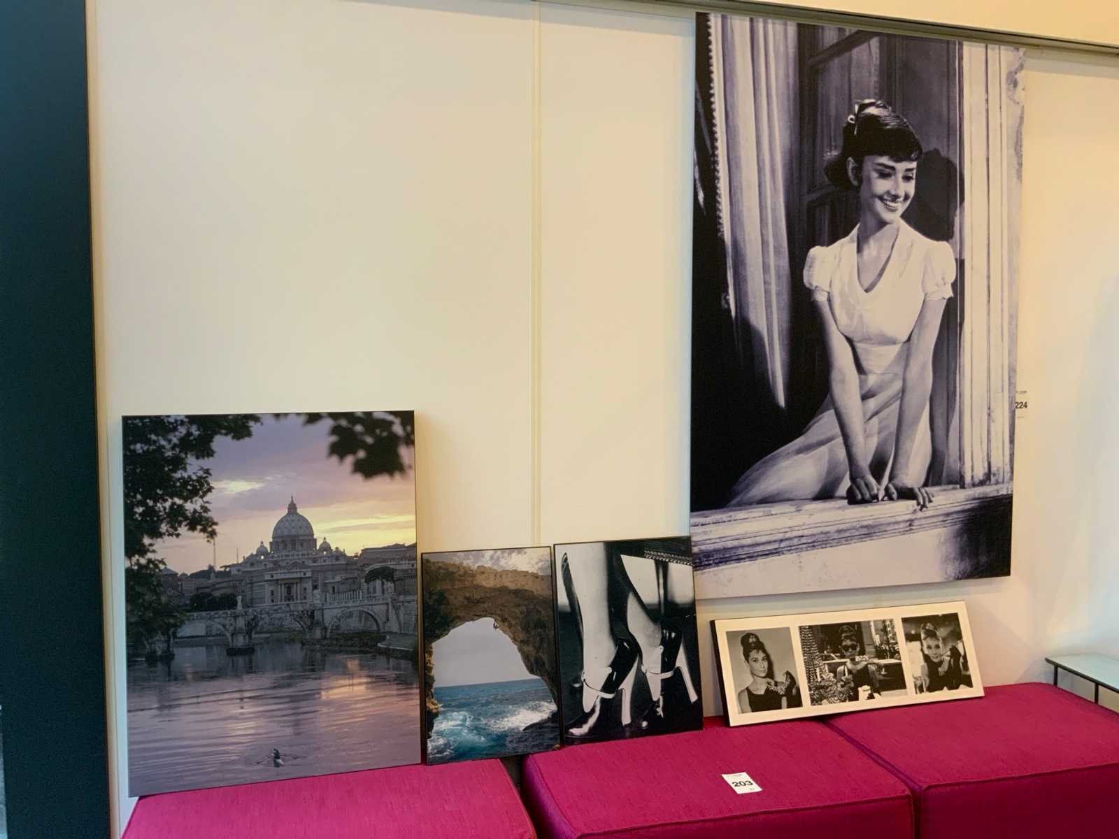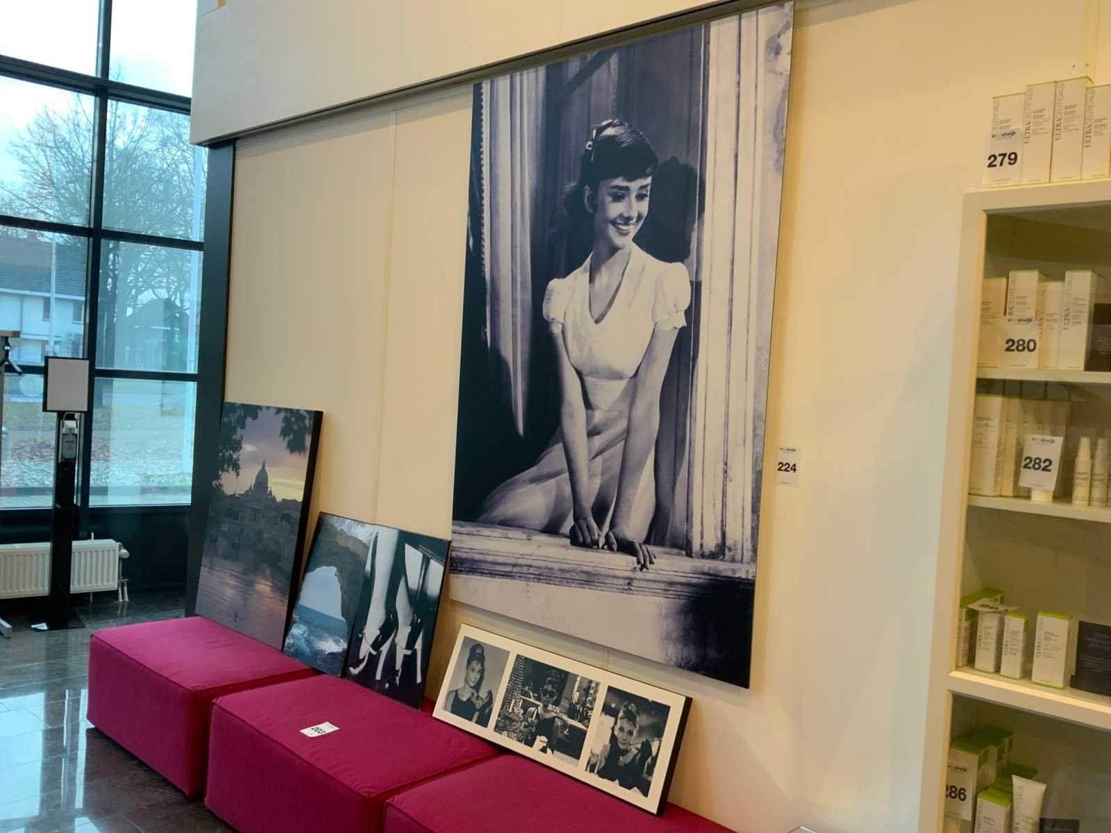 Diverse prenten zowel op hout als op canvas. Waaronder audrey hepburn In diverse afmetingen waarvan grootste 122x182 cm Lengte: 122cm Hoogte: 182cm