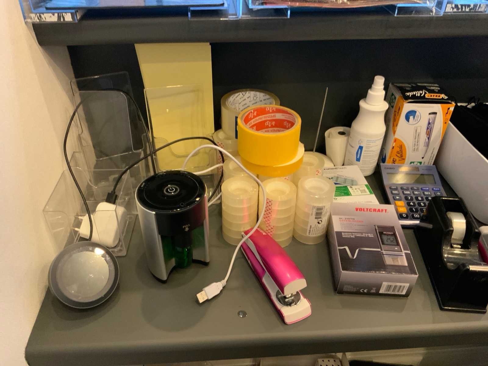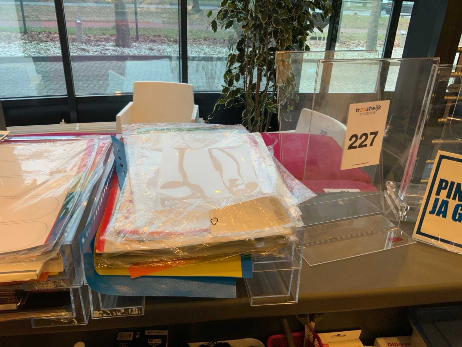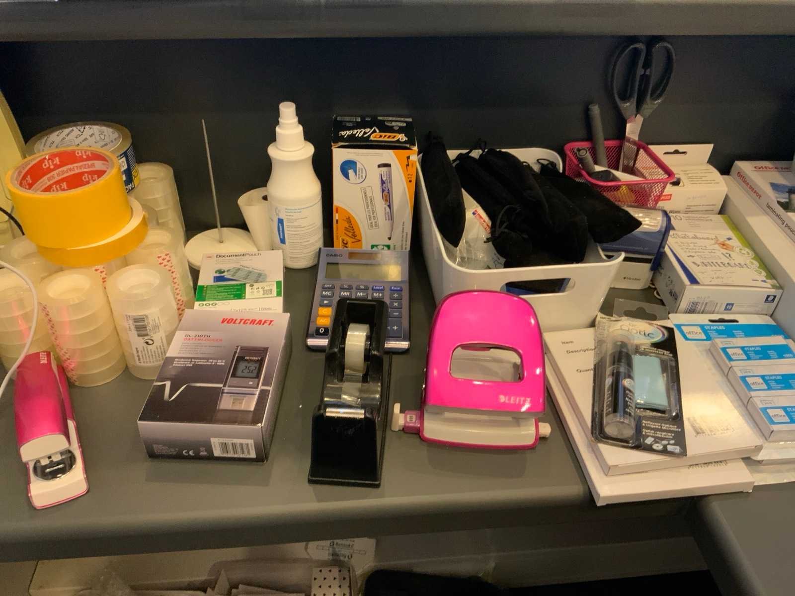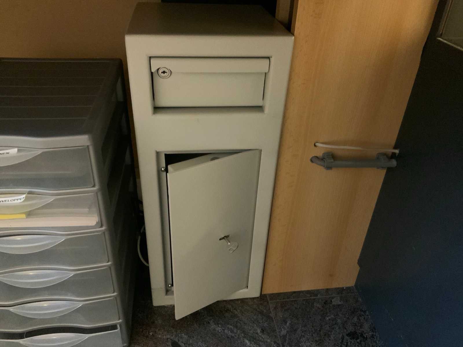 Inhoud van de balie bestaande uit radiator, opbergbakken, postvakken, bureaustoel, kluis welke vast gemonteerd is en divers kantoorgerei