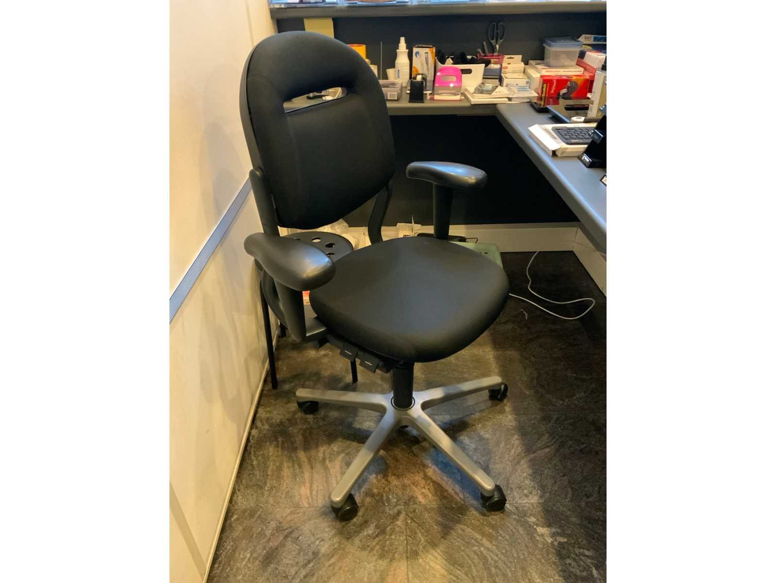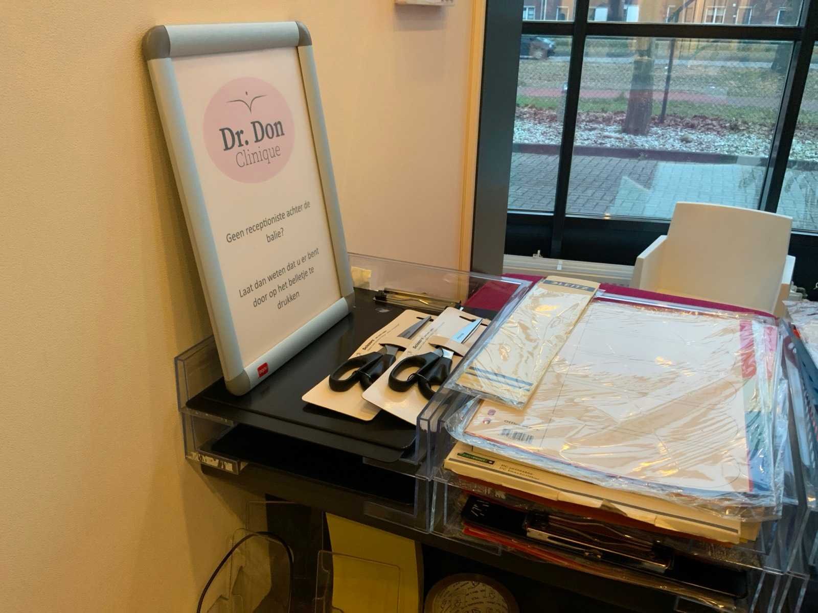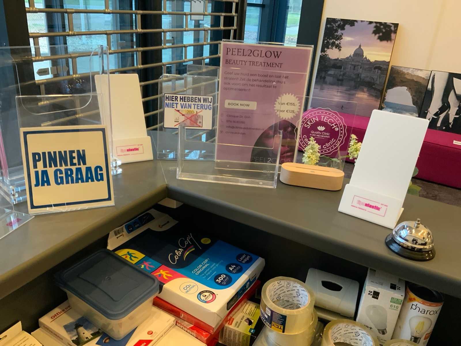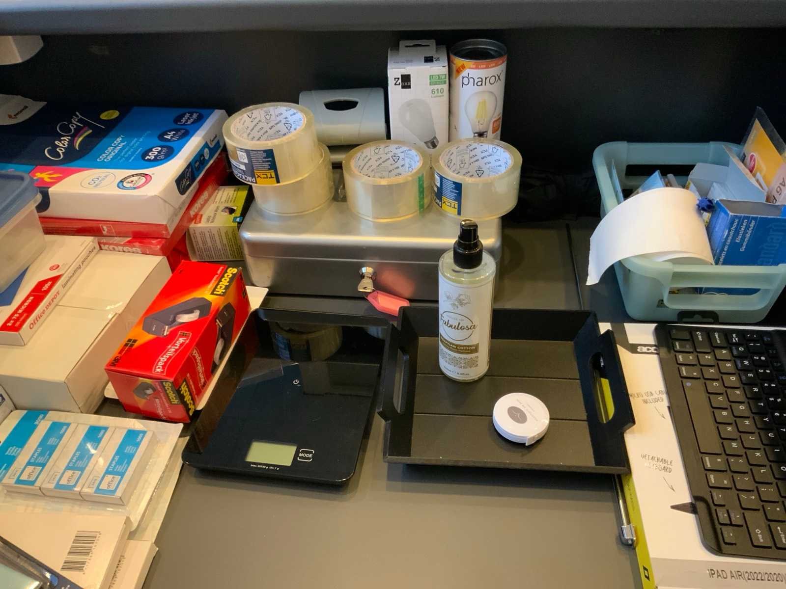 Inhoud van de balie bestaande uit radiator, opbergbakken, postvakken, bureaustoel, kluis welke vast gemonteerd is en divers kantoorgerei