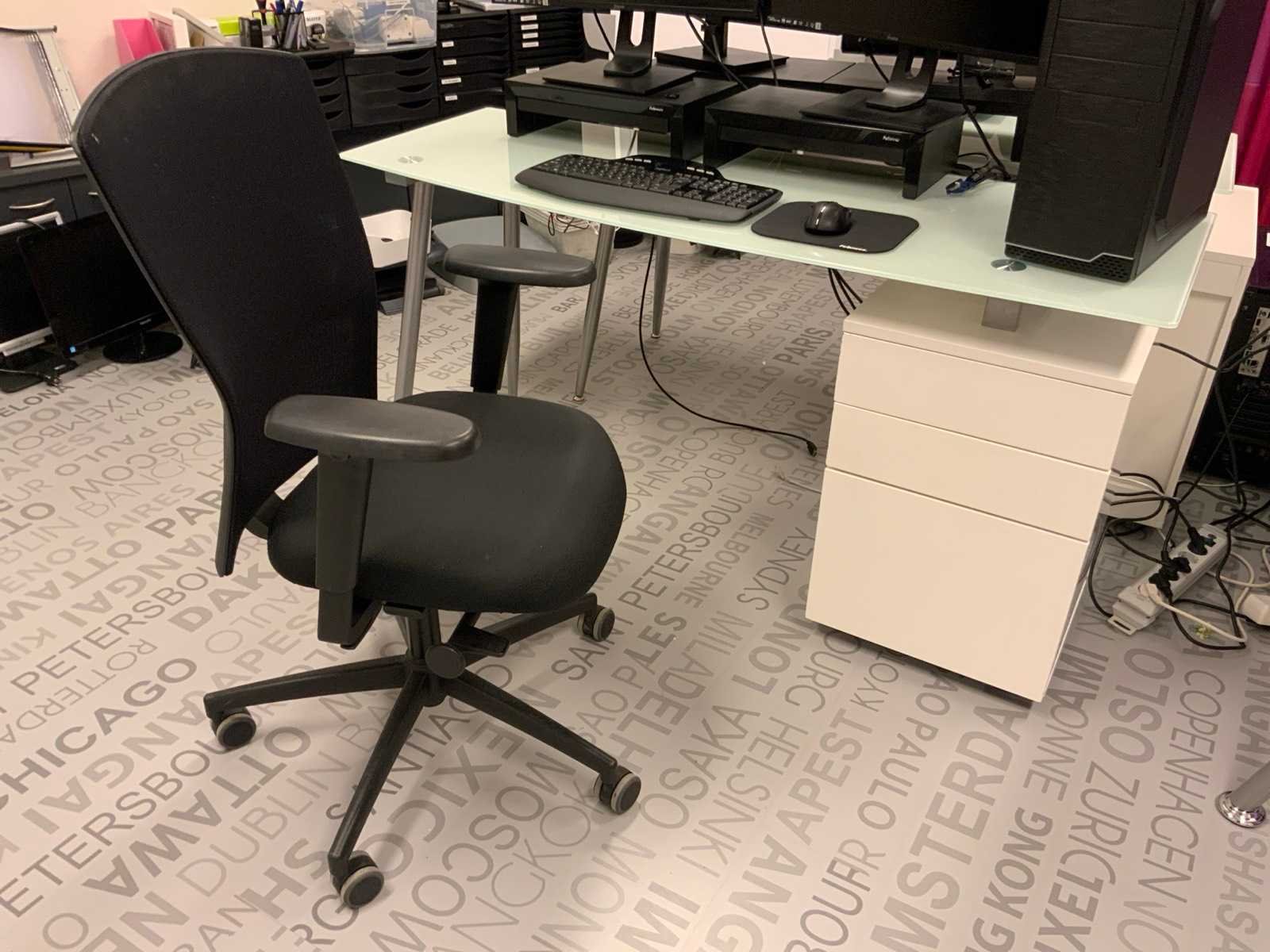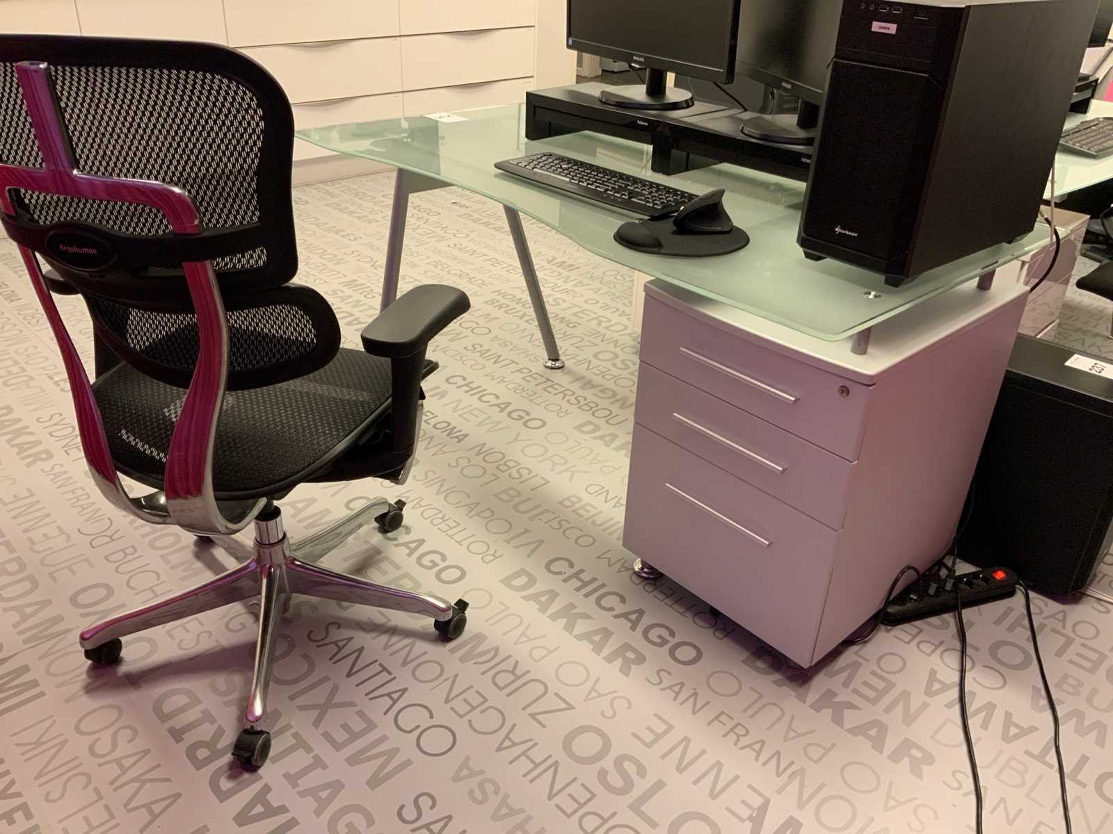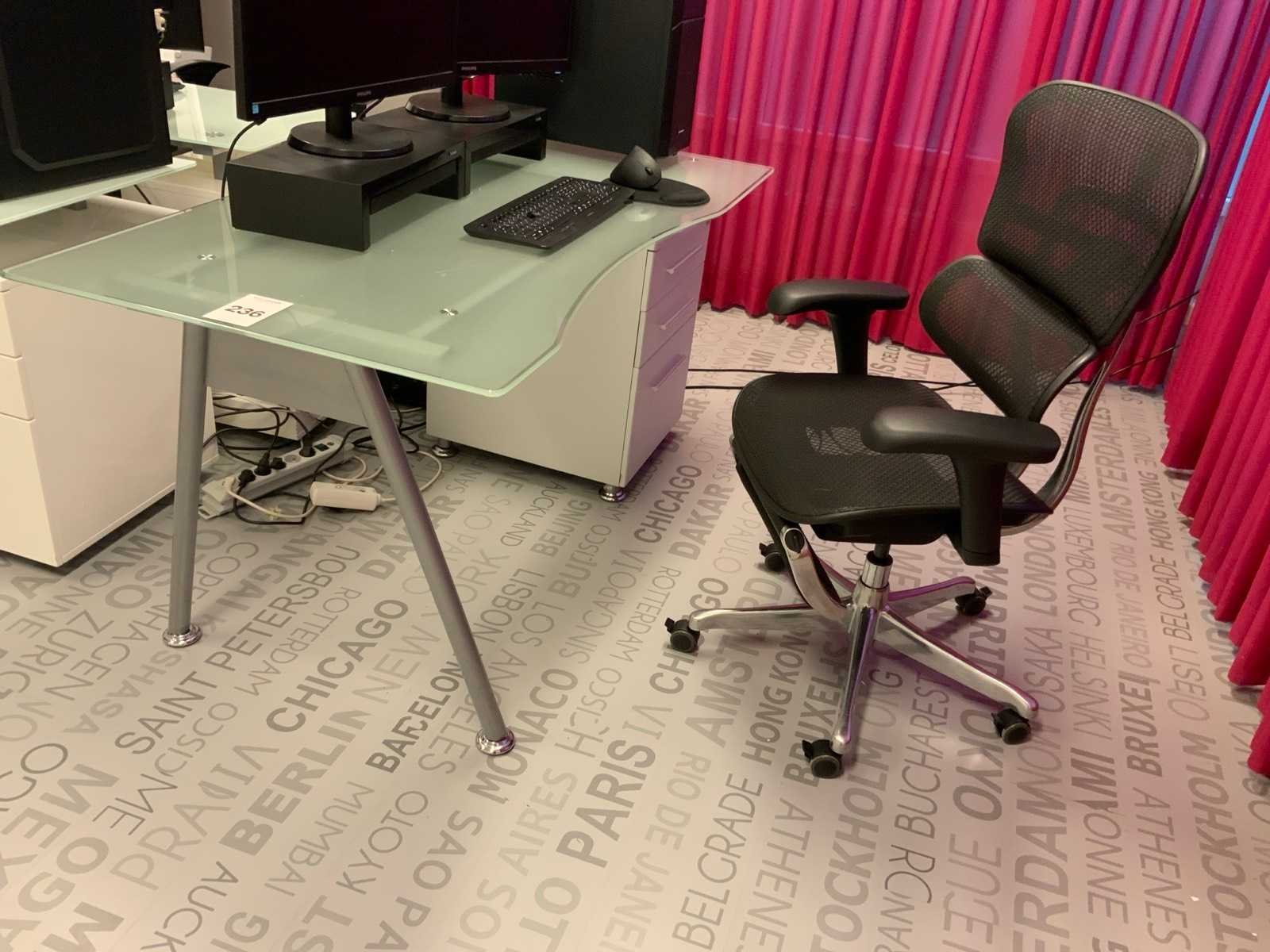 Bestaande uit bureau voorzien van glazen blad, ladeblok en bureaustoel Waarvan 2 stuks afm ca. 150x55x74 cm Computers en monitoren niet inbegrepen Lengte: 150cm Breedte: 80cm Hoogte: 76cm