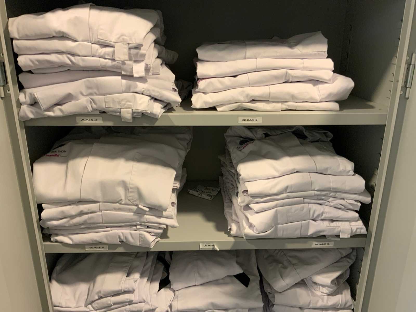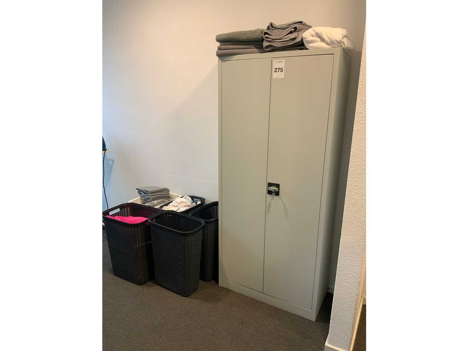 Bestaande uit draaideurkast met inhoud. Voorzien van 4 legborden en sleutels en diverse zorg kleding, deels bedrukt 5 wasmanden met inhoud, diverse handdoeken en kleding
