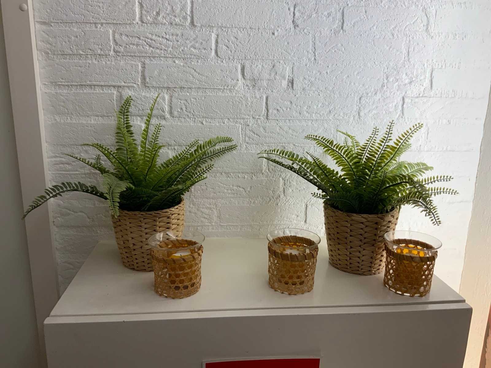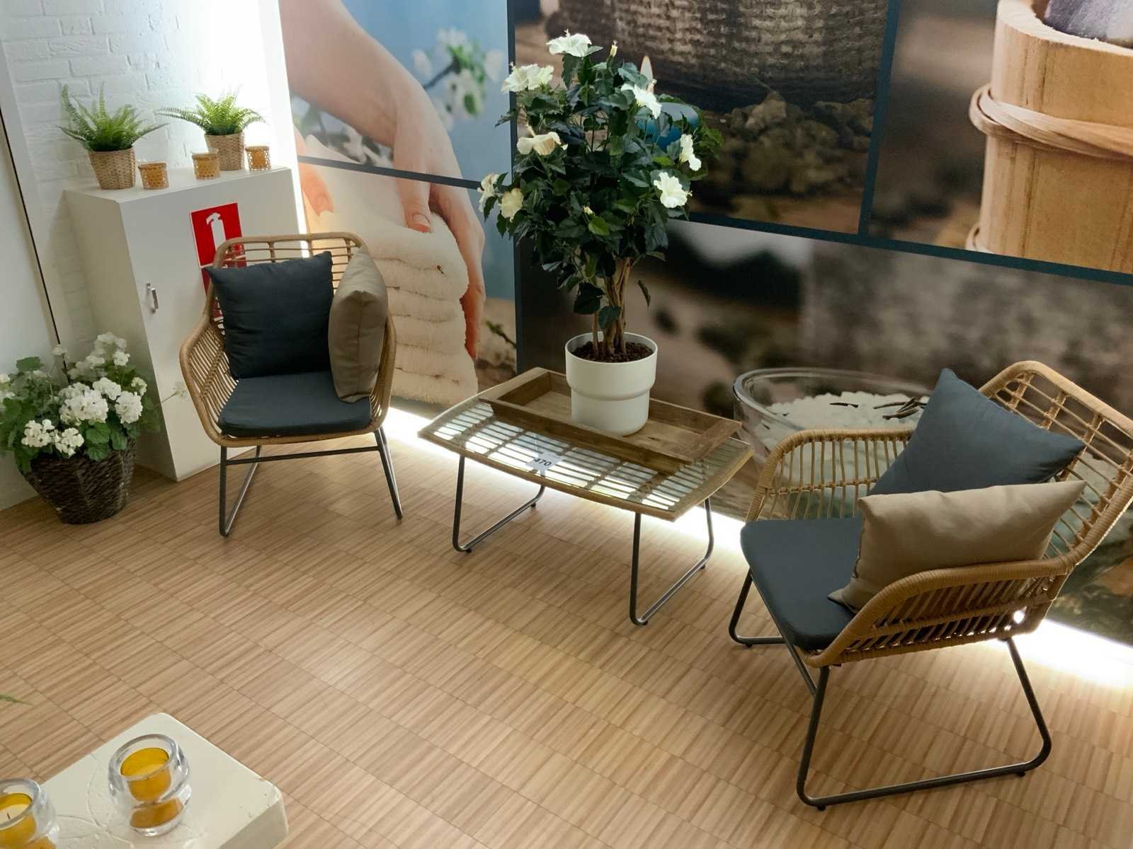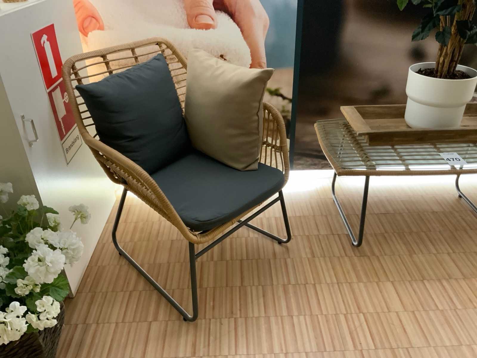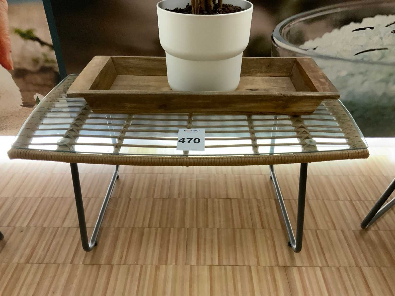 Bestaande uit salontafel voorzien van glazen blad. Afm ca. 95x52x44 cm 2 stoelen, 3 kunstplanten in pot en diverse decoratie waaronder windlichten