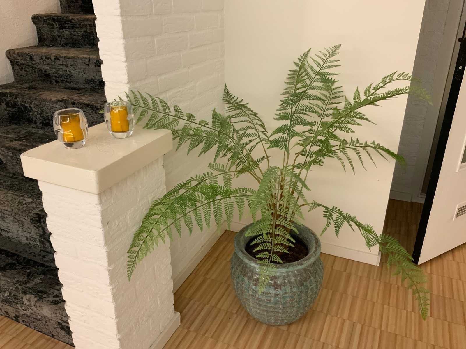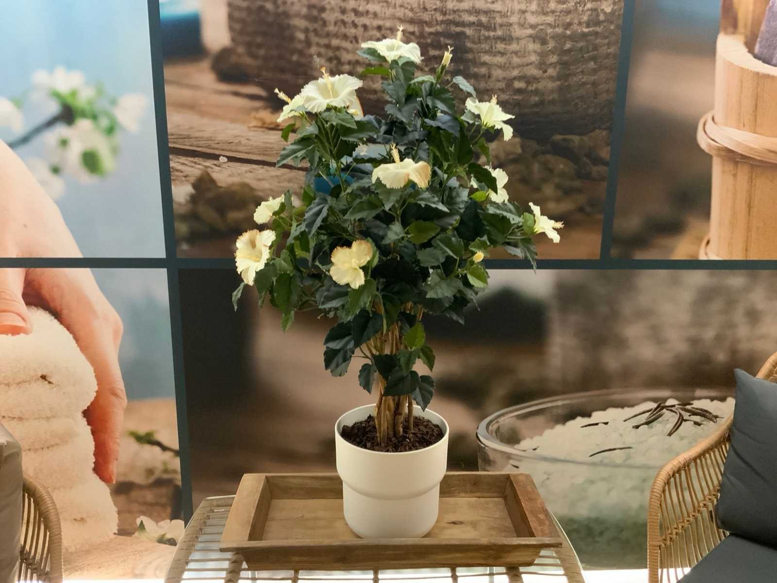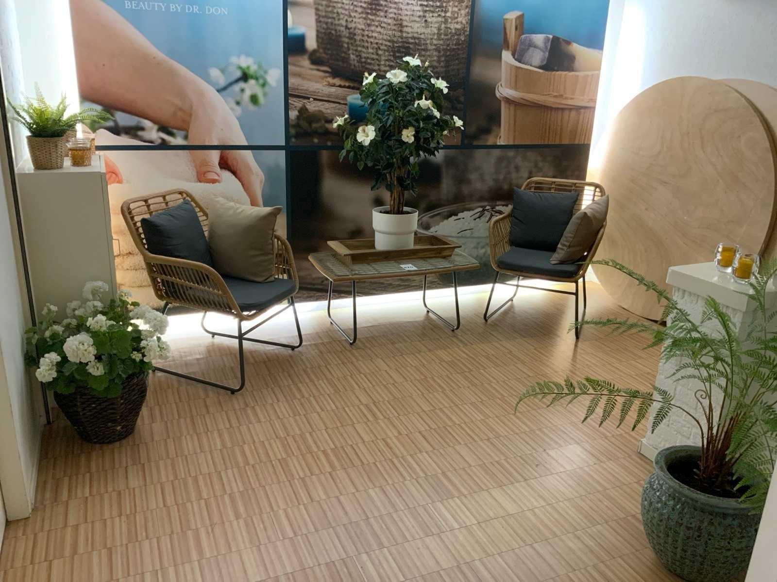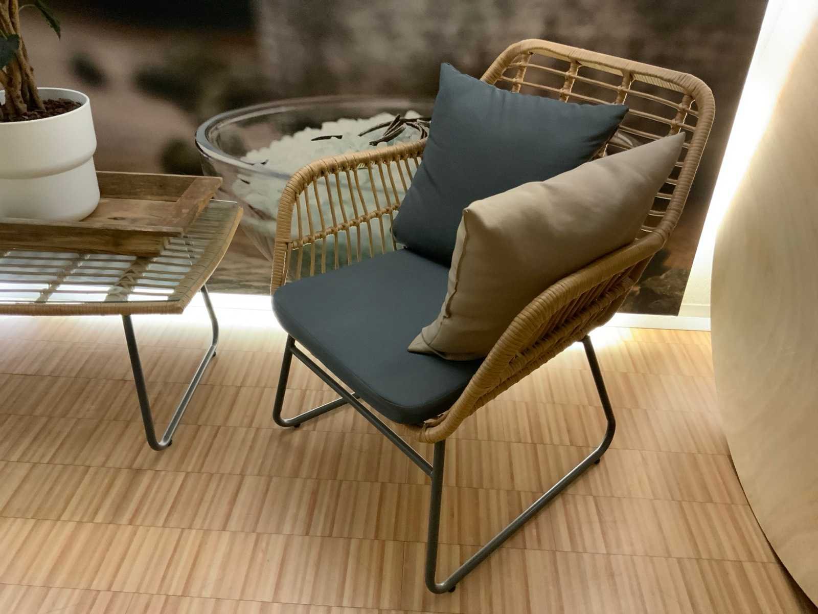 Bestaande uit salontafel voorzien van glazen blad. Afm ca. 95x52x44 cm 2 stoelen, 3 kunstplanten in pot en diverse decoratie waaronder windlichten