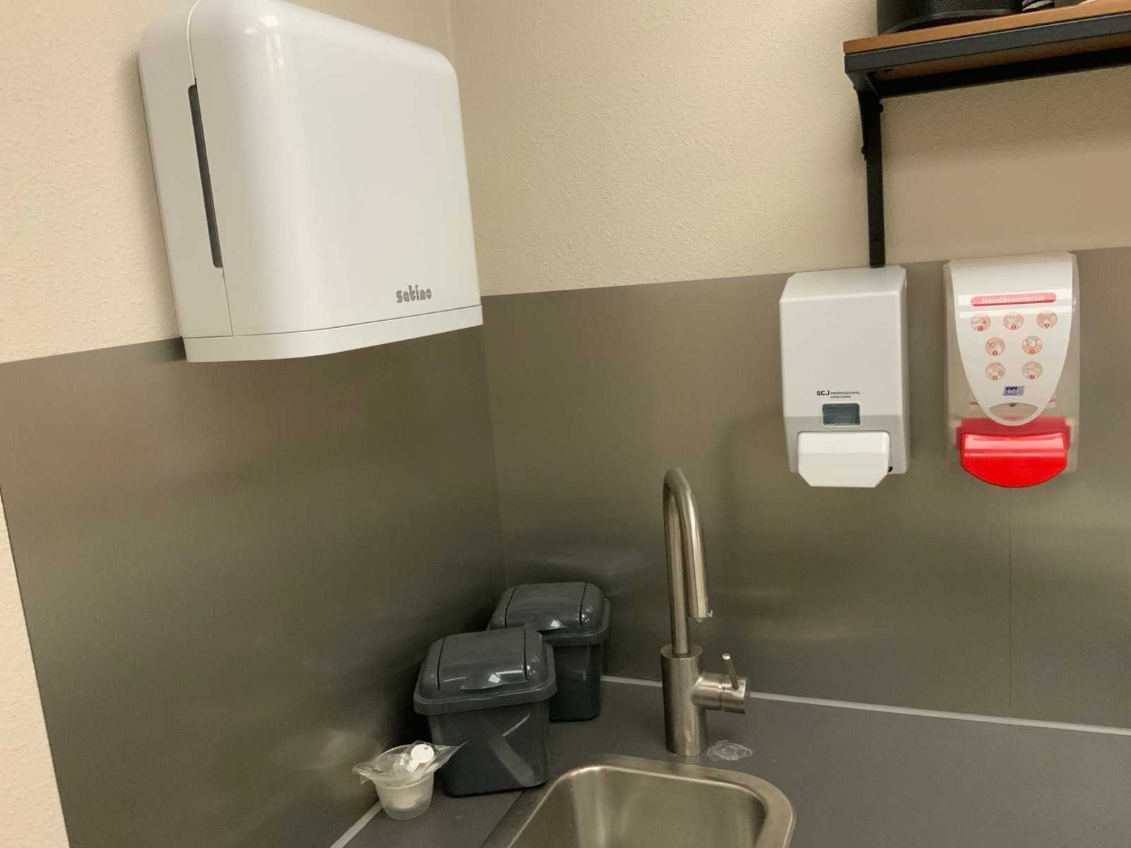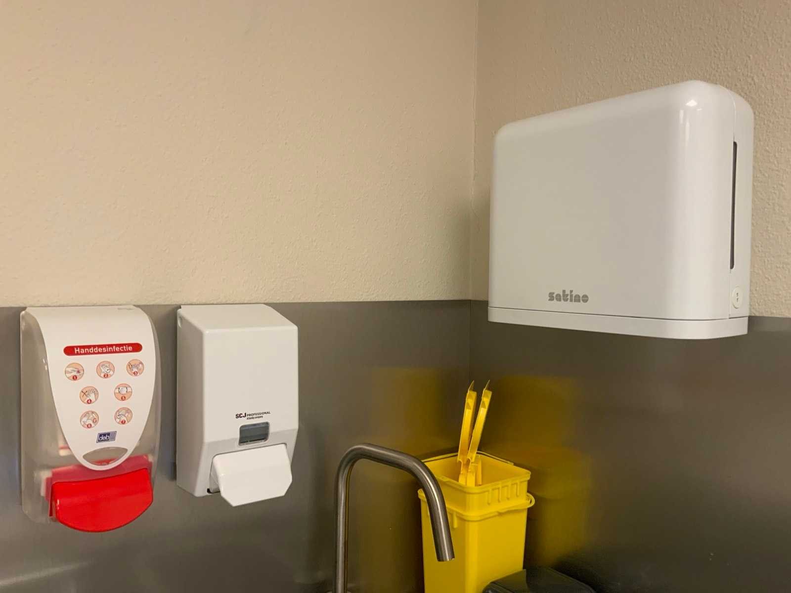 Bestaande uit papierer dispenser, zeepdispenser en handdesinfectie dispenser uit 4 behandelkamers Alsmede prullenbakjes, navul flacons zeep Dit kavel dient door de koper zelf gedemonteerd te worden en dient ook zelf te zorgen voor de benodigde gereedschappen, transport- en/of verpakkingsmateriaal Merk: SCJ professional