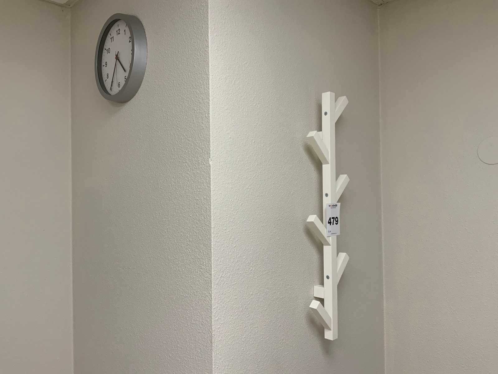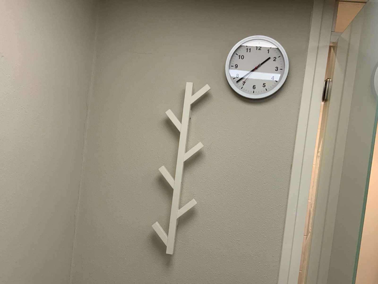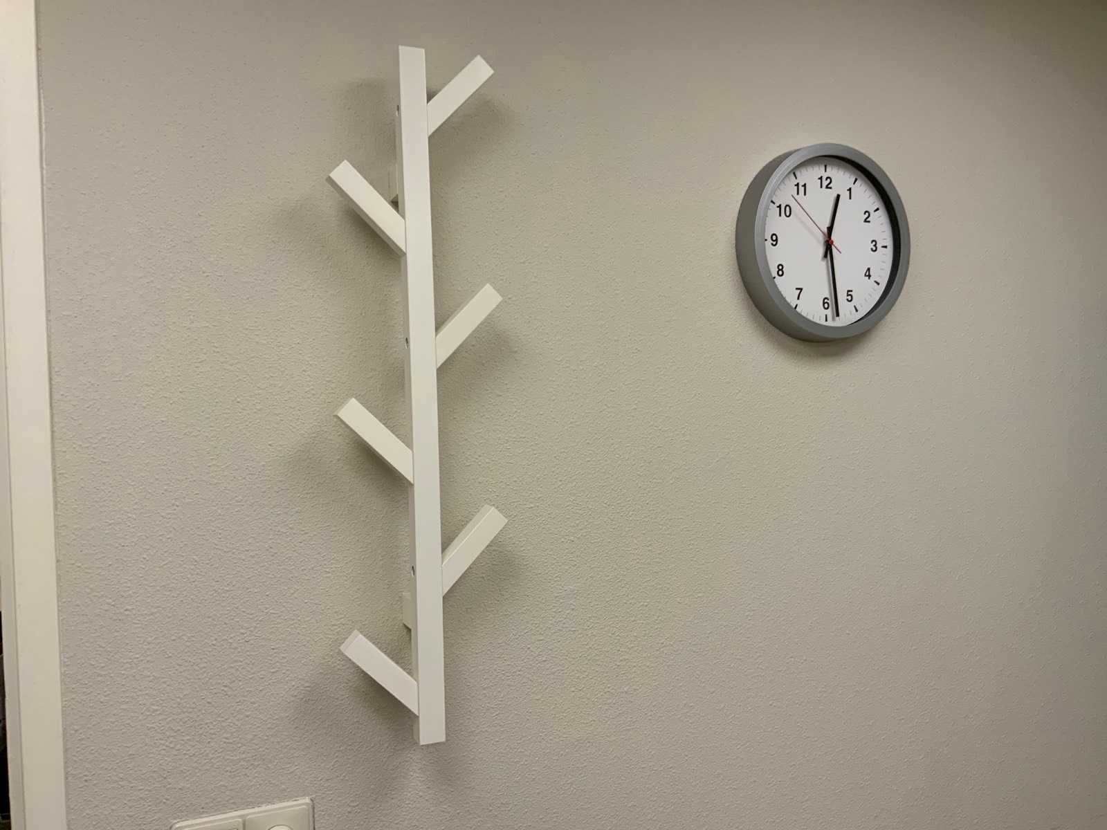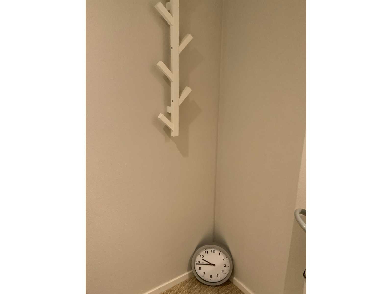 Bestaande uit houten wandgemonteerde kapstok en wandklok ø 27 cm in 4 behandel kamers Breedte: 20cm Hoogte: 80cm