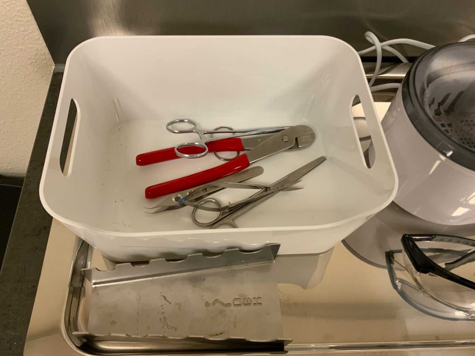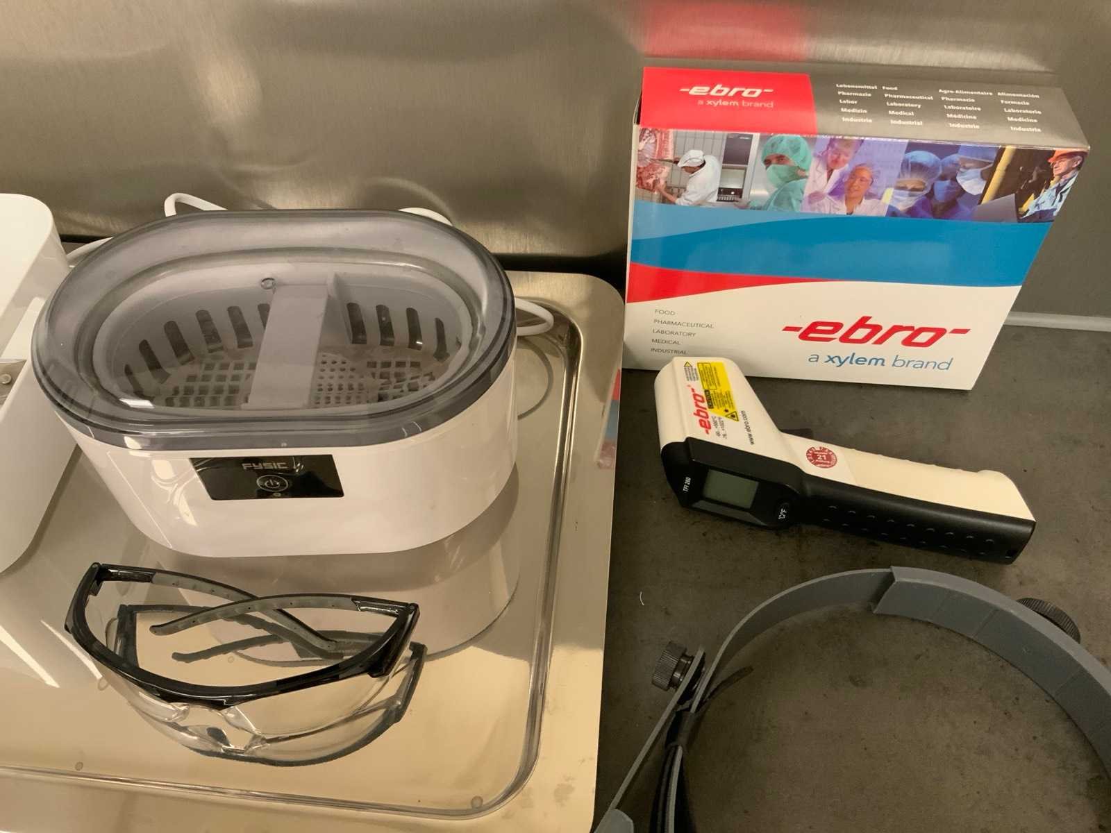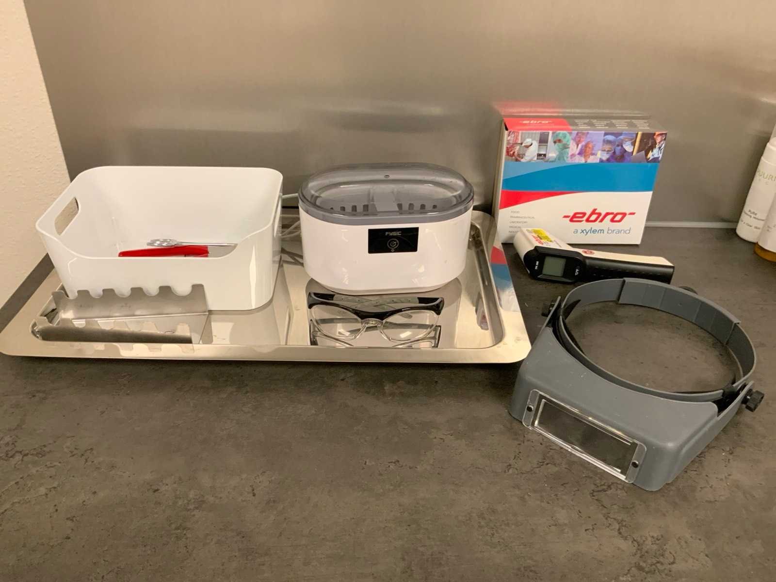 Diverse waaronder Fysic ultrasonic cleaner, Ebro temperatuur meter, handschoenen, spuiten, naalden Inhoud van laden