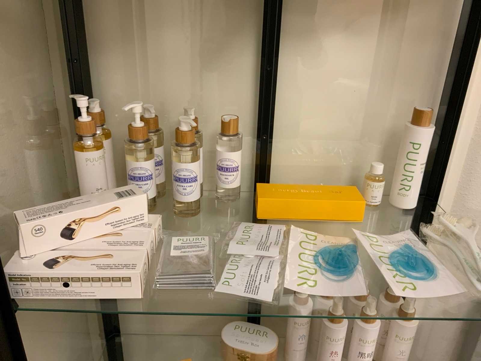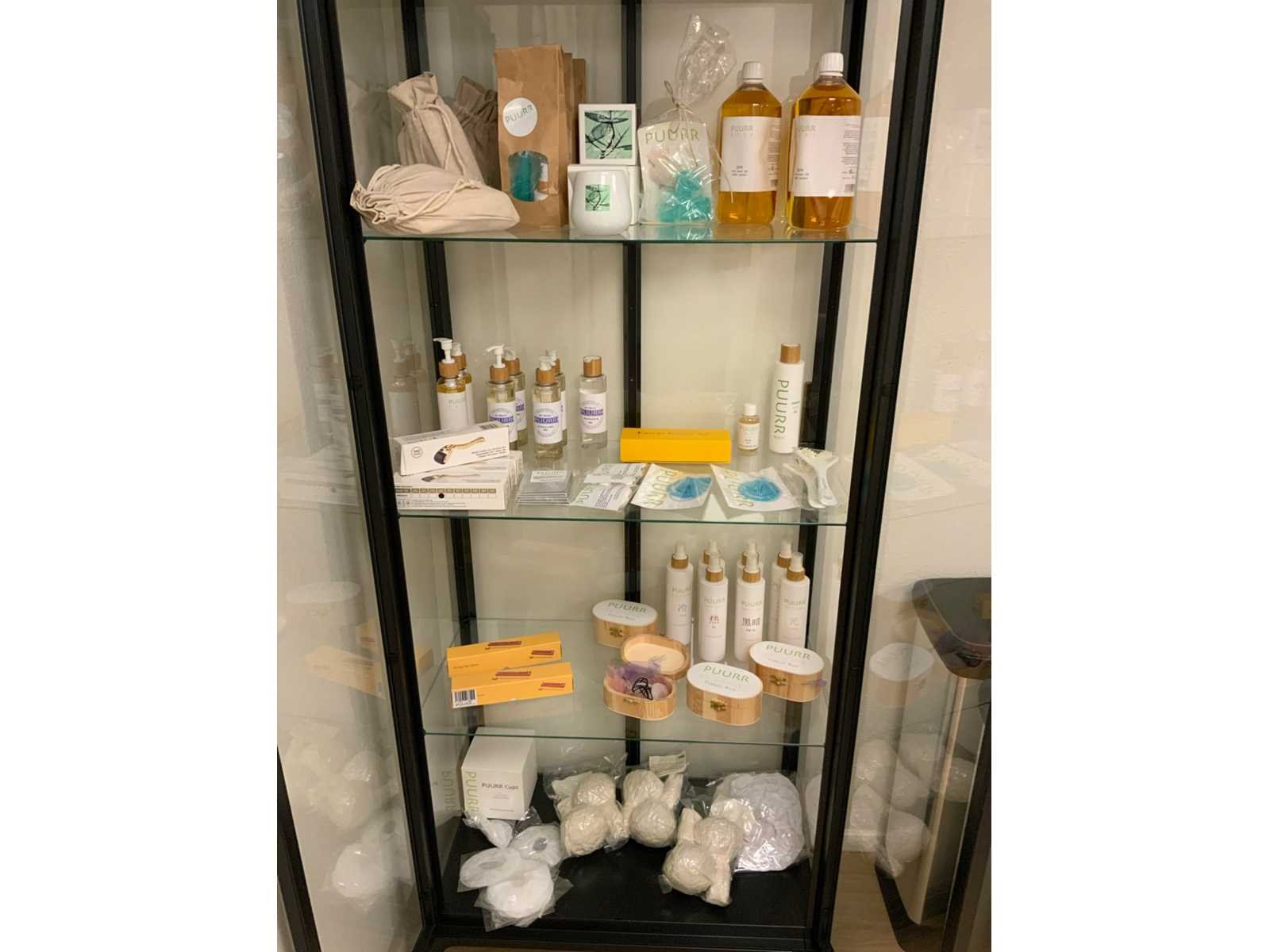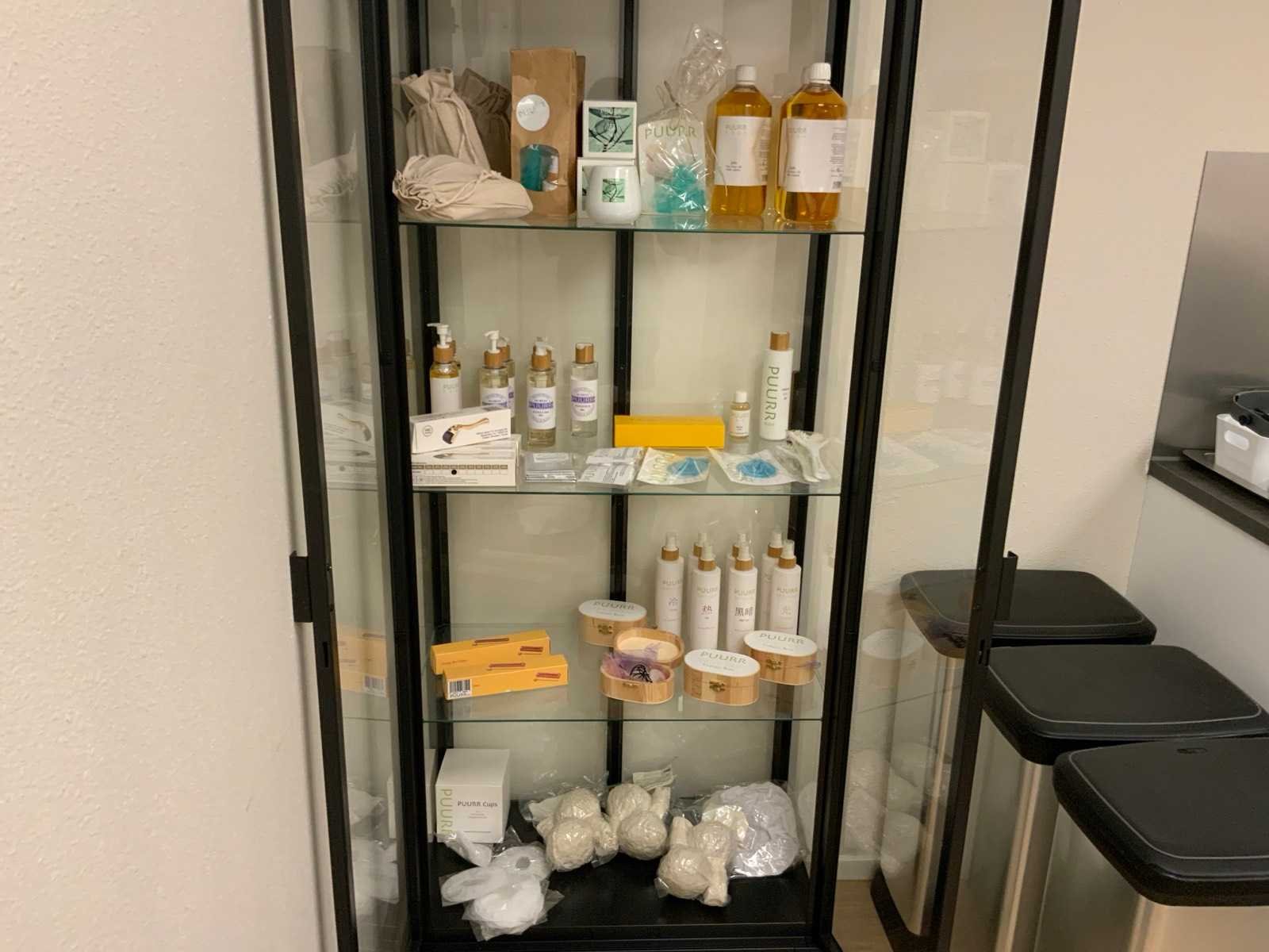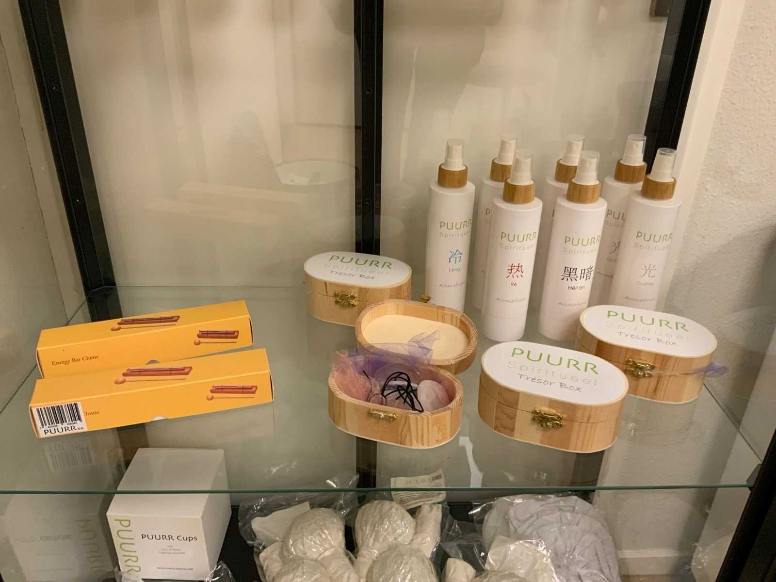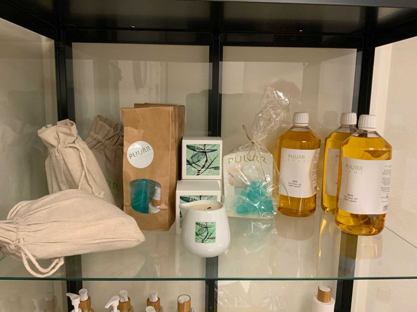 Diverse producten waaronder body oil, massage kaarsen, collageen stimulatie apparaten, energy bar chimes, oplegstenen en kruidenstempels Vitrinekast niet inbegrepen Merk: Puurr