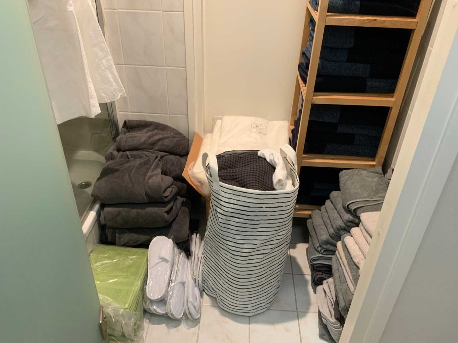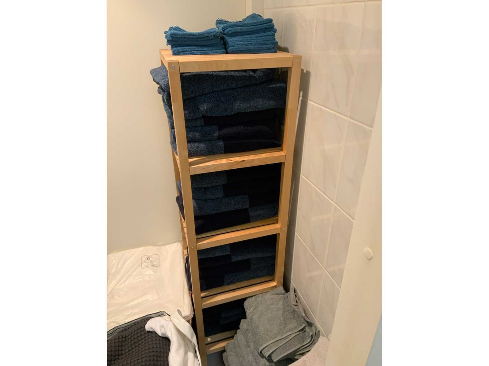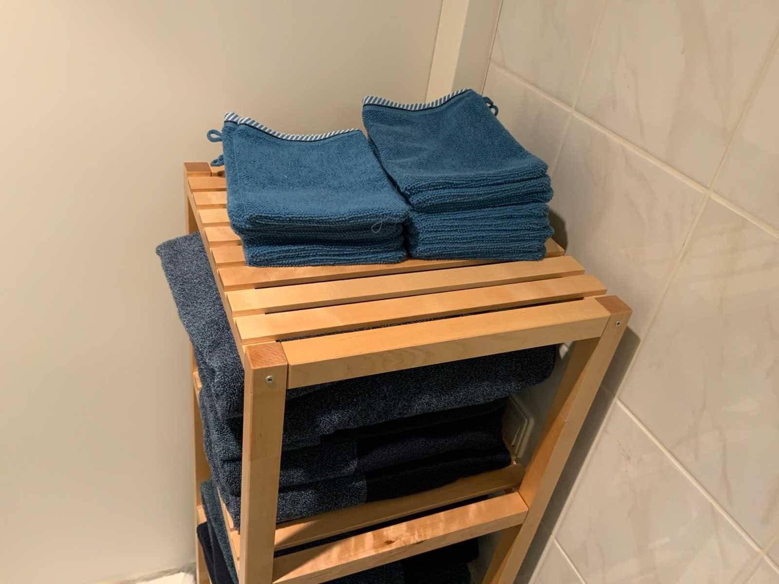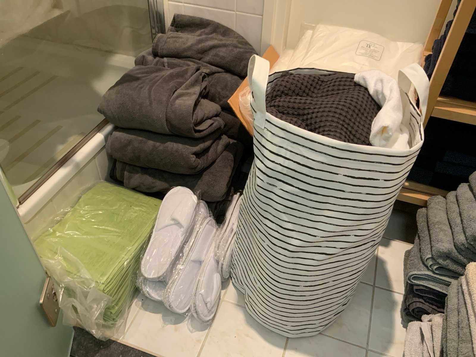 Diverse handdoeken, disposable badjassen, slippers Alsmede houten stelling Merk: Neweco