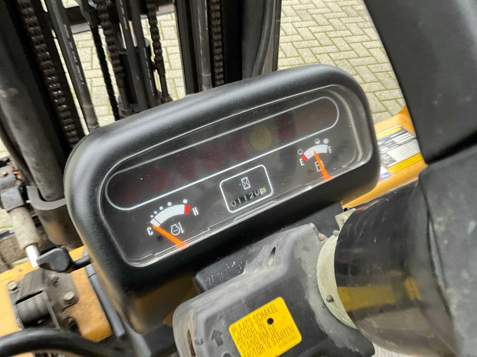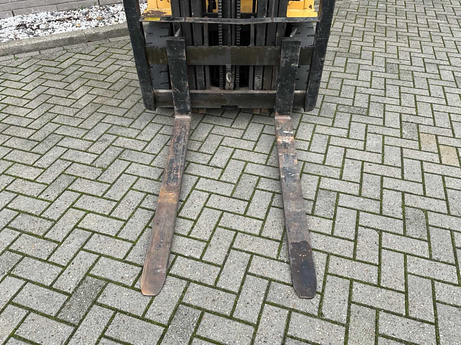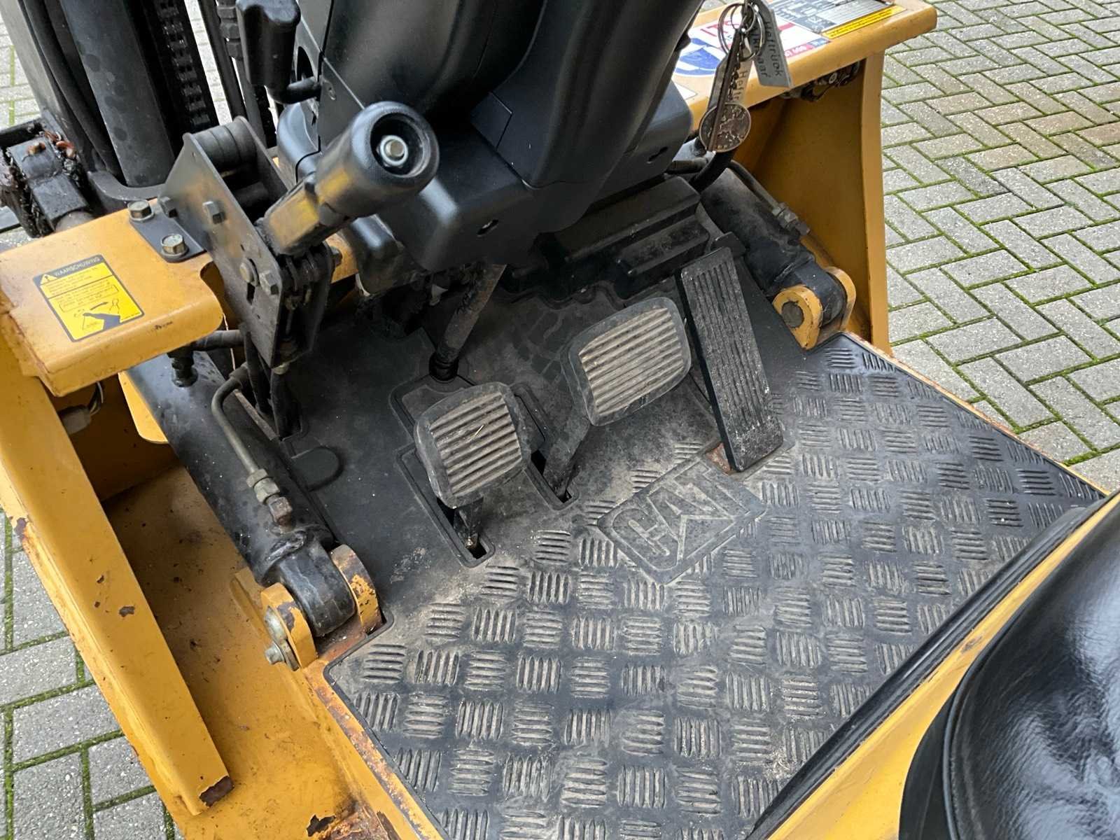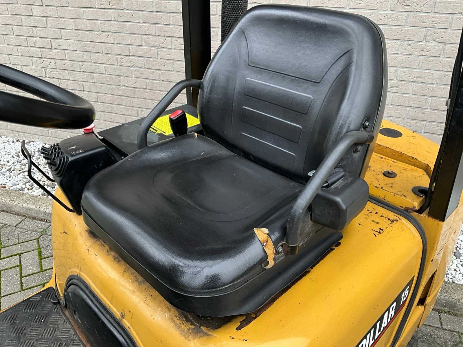Voor en achter verlichting. Merk: Caterpillar Type: DP15K Bouwjaar: 2001 Serienummer: ET16B-65181 Brandstof: Diesel Afgelezen urenstand: 1120 Free-lift: true Triple mast: true Hefvermogen: 1500kg Lepellengte: 1200mm Max. hefhoogte: 4350mm Minimale doorrijhoogte: 2120mm