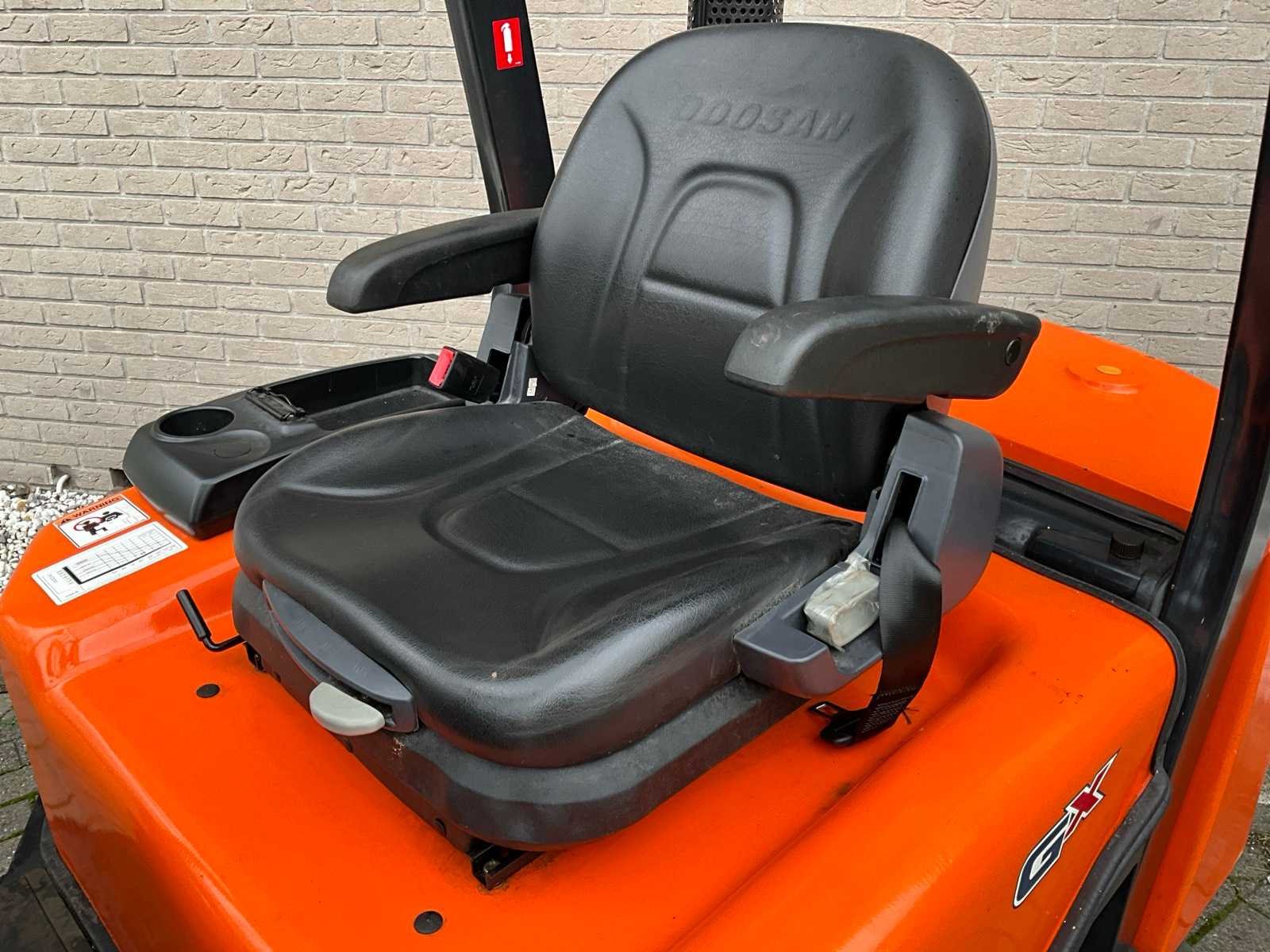 2 mastdelen met freelift; voor en achter verlichting Merk: Doosan Type: D25G Bouwjaar: 2012 Serienummer: FDA0C-1230-02493 Brandstof: Diesel Afgelezen urenstand: 175 Free-lift: true Duplex mast: true Hefvermogen: 2500kg Lepellengte: 1150mm Max. hefhoogte: 3210mm Minimale doorrijhoogte: 2140mm