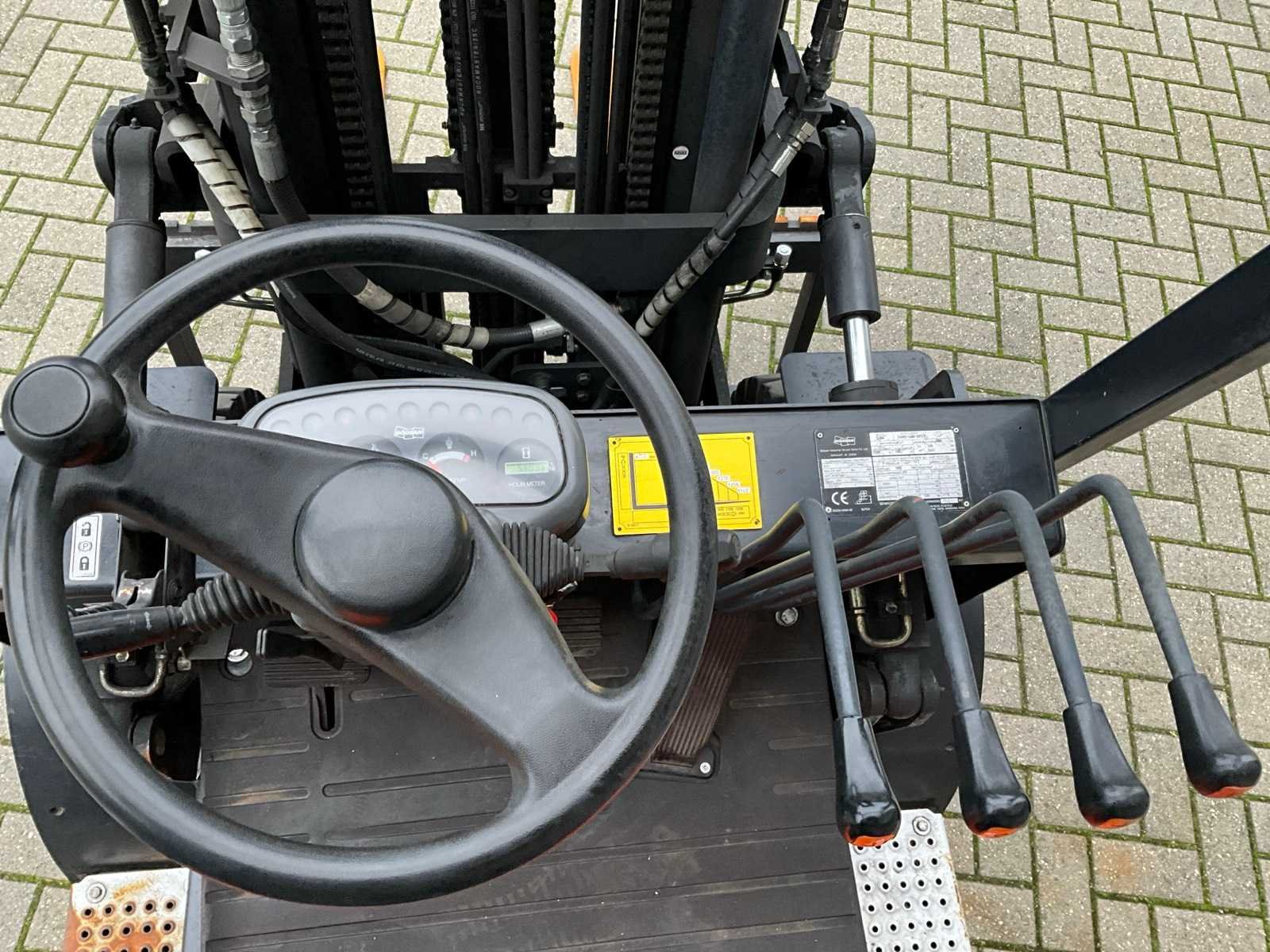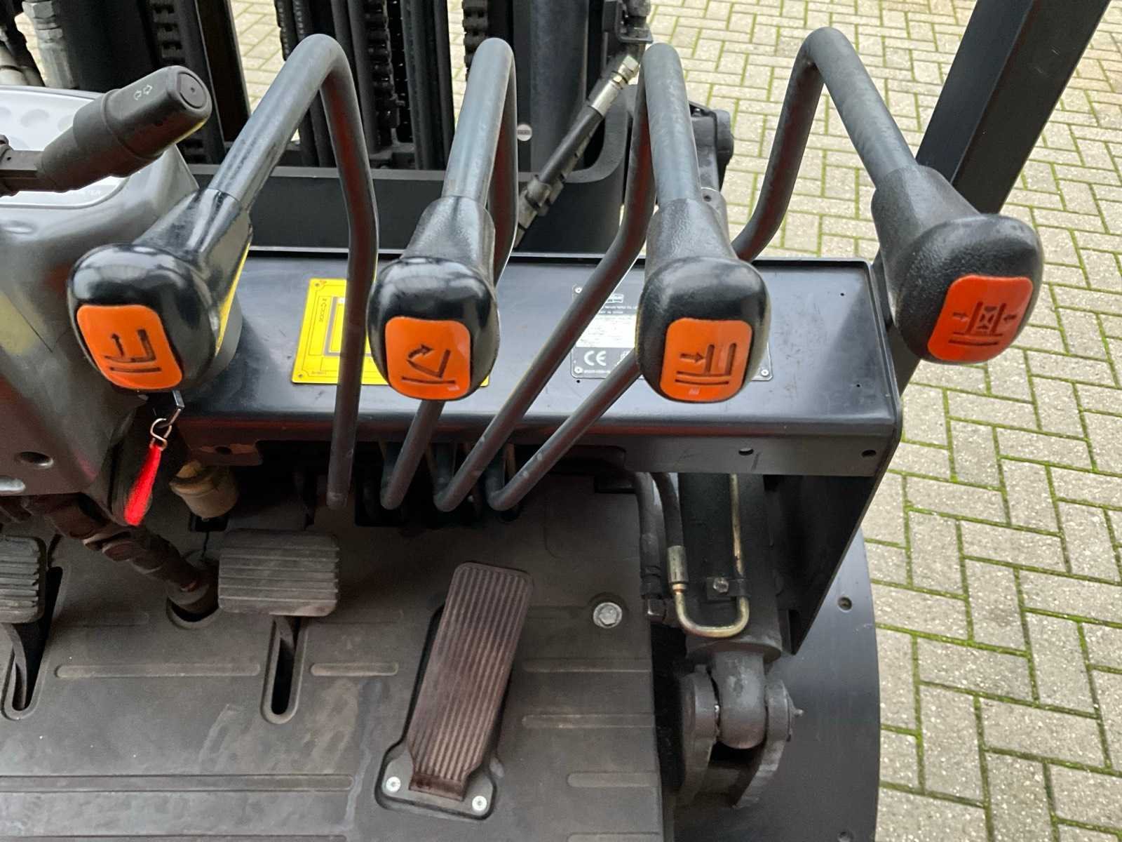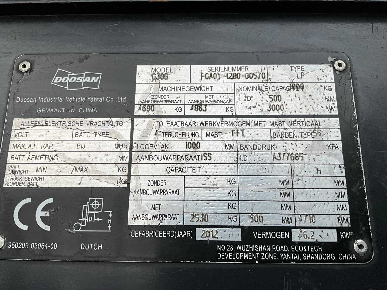 4 ventielenblok, voor en achter verlichting. Zonder gasfles. Merk: Doosan Type: G30GX Bouwjaar: 2012 Serienummer: FGAOY-1280-00570 Brandstof: LPG Afgelezen urenstand: 5609 Free-lift: true Triple mast: true Hefvermogen: 3000kg Lepellengte: 1200mm Max. hefhoogte: 4710mm Minimale doorrijhoogte: 2120mm LPG: true