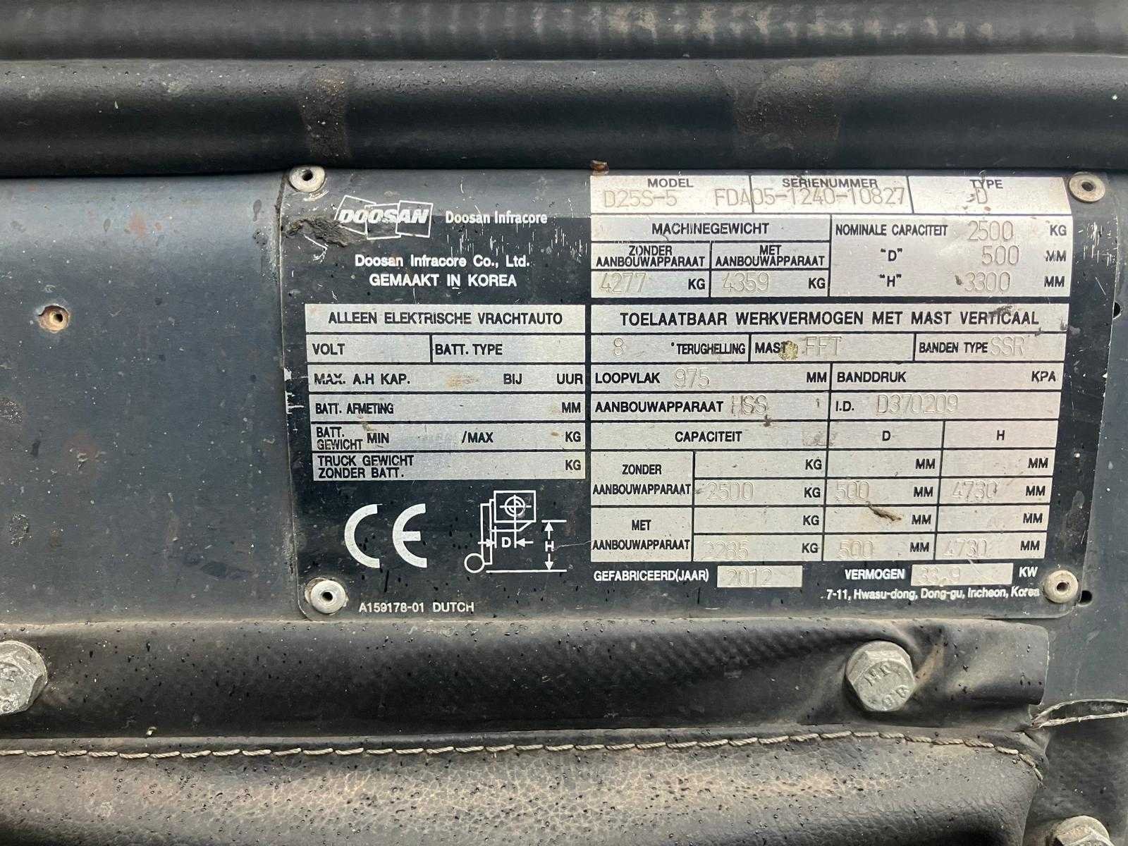 SS-hang on; werklampen voor en achter; kachel in cabine; Merk: Doosan Type: D25S-5 Bouwjaar: 2012 Brandstof: Diesel Afgelezen urenstand: 12708 Side-shift: true Hefvermogen: 2500kg Lepellengte: 1200mm Max. hefhoogte: 4370mm Hefhoogte: 2200mm Diesel: true