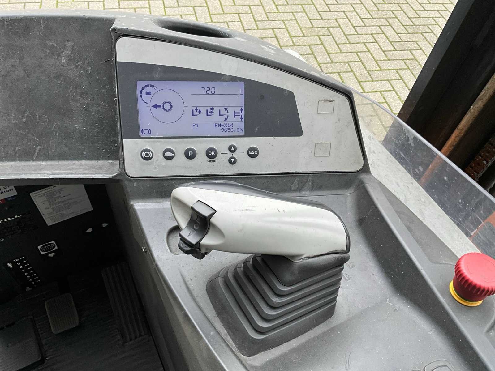 Bluespot voor en achter. Merk: STILL Type: FM-X14 Bouwjaar: 2013 Serienummer: 511801D01178 Afgelezen urenstand: 9657 Accu lader: true Free-lift: true Side-shift: true Triple mast: true Hefvermogen: 1400kg Lepellengte: 1200mm Max. hefhoogte: 7400mm Minimale doorrijhoogte: 2700mm Elektrisch: true