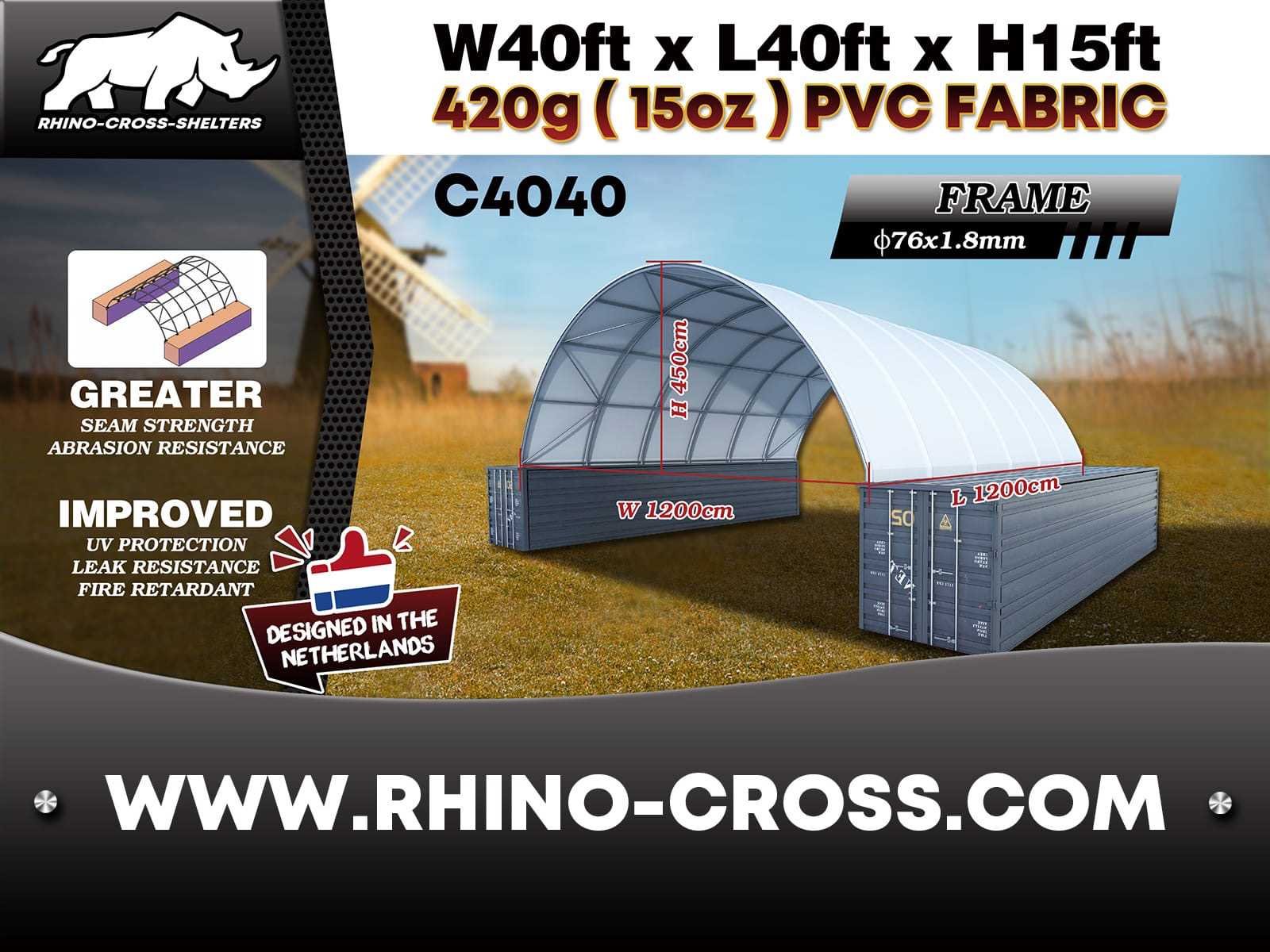 Voorzien van opslagtent / opslag shelter; singel trussen-/buizensysteem; gegalvaniseerd; beide uiteinden een deur; materiaal 420 gram PVC cover; kleur wit; inclusief montage handleiding; ongebruikt in metalen kist (transport afmetingen 243x75x118 cm) LET OP AFHALEN OP AFSPRAAK IN VERBAND MET HET GEWICHT VAN DE KAVEL ! Merk: Rhino-Cross-Shelter Type: C4040 - 12x12x4,5 m Bouwjaar: 2025 Eigen gewicht: 980kg Totale afmeting L: 12000mm Totale afmeting Breedte: 12000mm Totale afmeting Hoogte: 4500mm