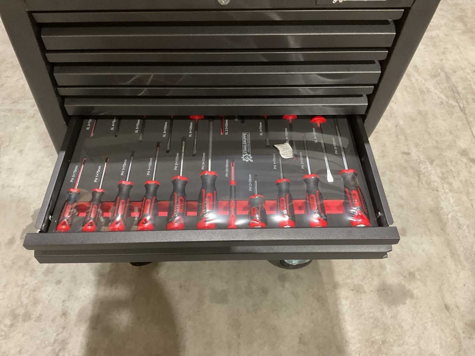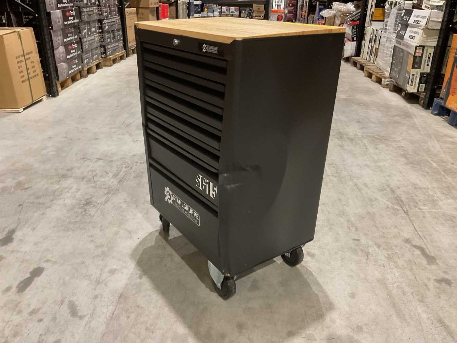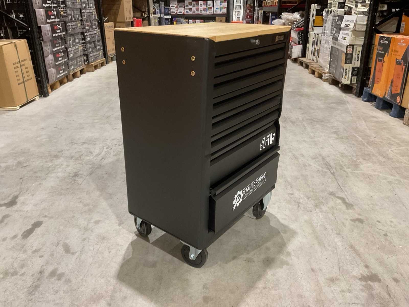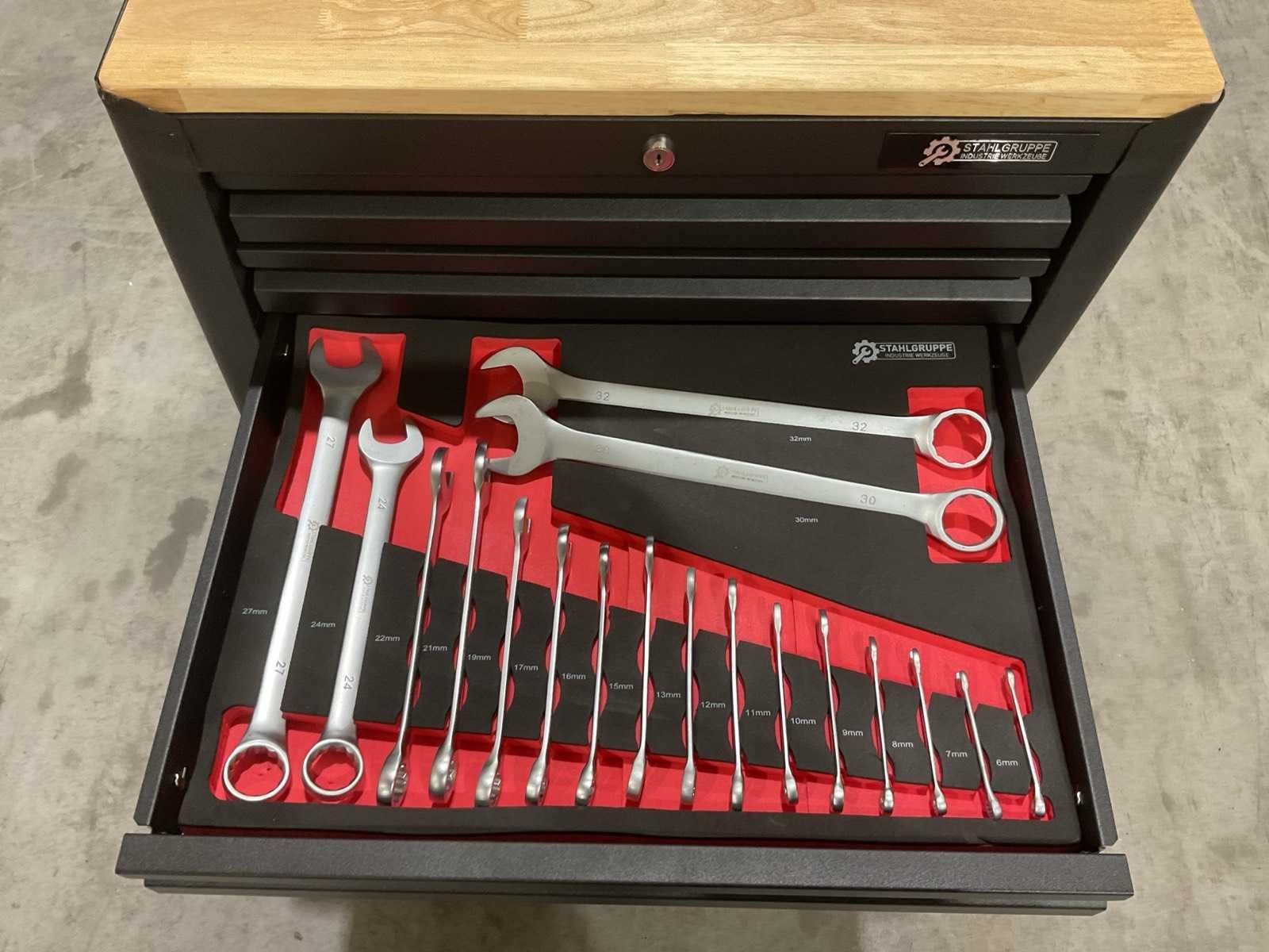 Voorzien van 7 lades waarvan 6 gevuld met gereedschap; professioneel chroom-vanadium gereedschap; heavy duty gereedschapswagen; houten werkblad; 4 wielen; stevig handvat; (transport afmetingen 70x50x105 cm); Let op transports schade Merk: Stahlgruppe Type: SG15 Bouwjaar: 2025 Aantal laden: 7 Met inhoud: true Eigen gewicht: 77kg Totale afmeting L: 68mm Totale afmeting Breedte: 48mm Totale afmeting Hoogte: 104mm