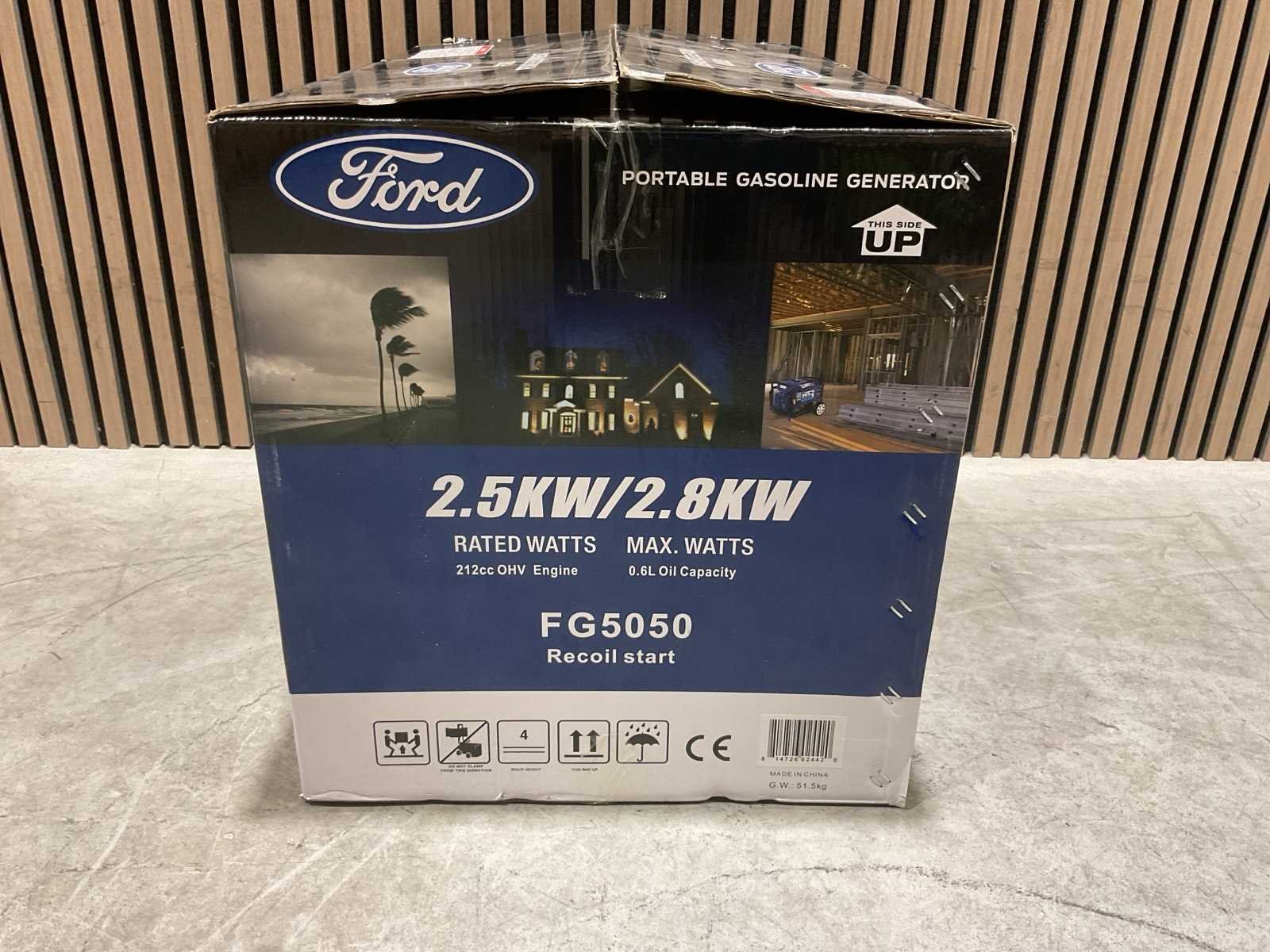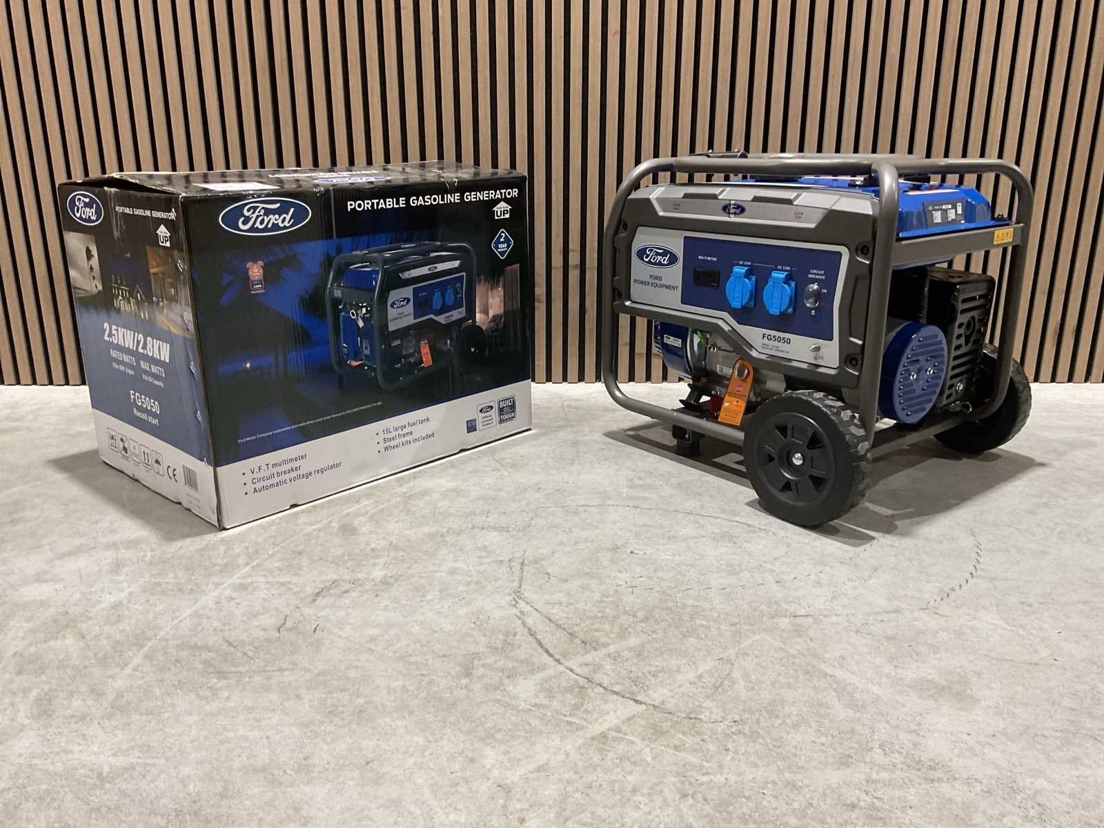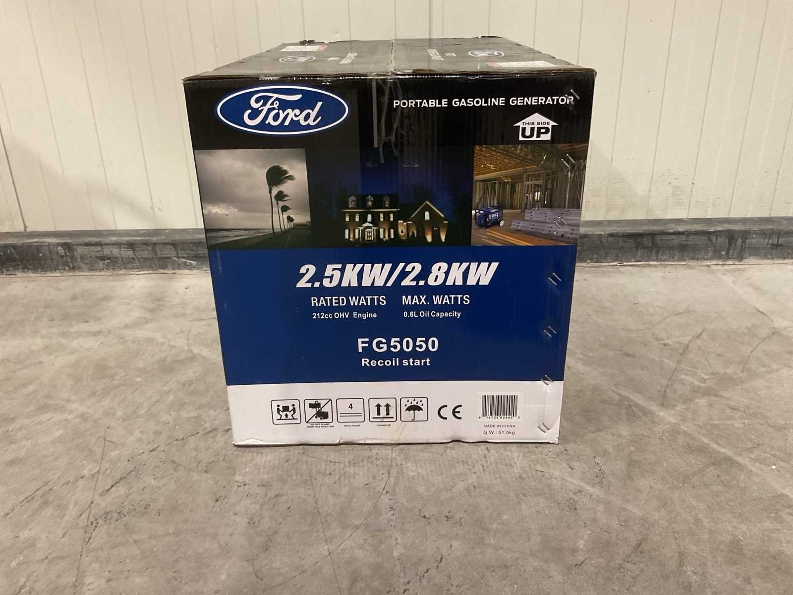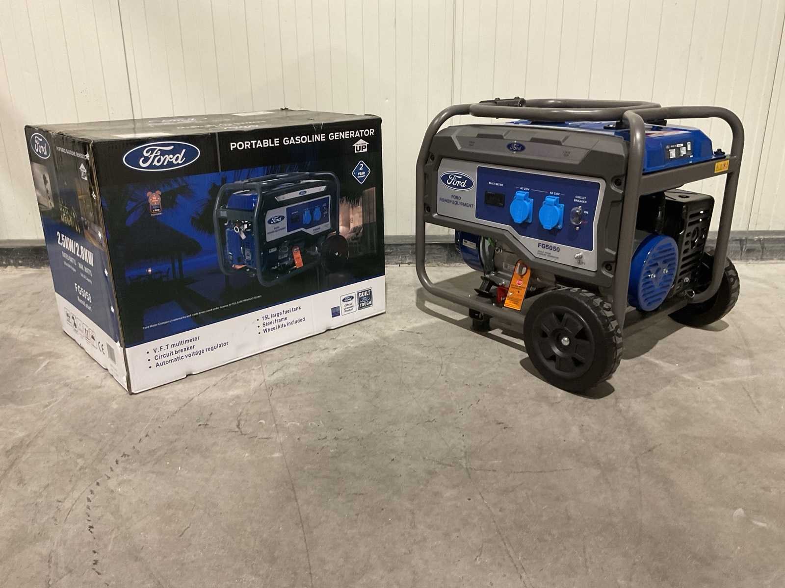 Voorzien van Brandstof Benzine motor; Brandstof consumptie 0.7 l/h; Frequentie 50 Hz; Geluidsniveau 90 dB; Tank inhoud 15 l; MPN (Manufacturer Part Number) FG5050; Vermogen 2800 W; Voltage 230 V; Vereidbaar met 2 wielen; Ongebruikt in doos Merk: Ford Type: FG5050 Bouwjaar: 2025 Benzine: true Type motor: 208cc OHV, 4-takt, luchtgekoeld Motorvermogen (kW): 2.5kW Luchtgekoeld: true Handboek aanwezig: true Machinegewicht: 50kg Totale afmeting L: 670mm Totale afmeting Breedte: 465mm Totale afmeting Hoogte: 510mm