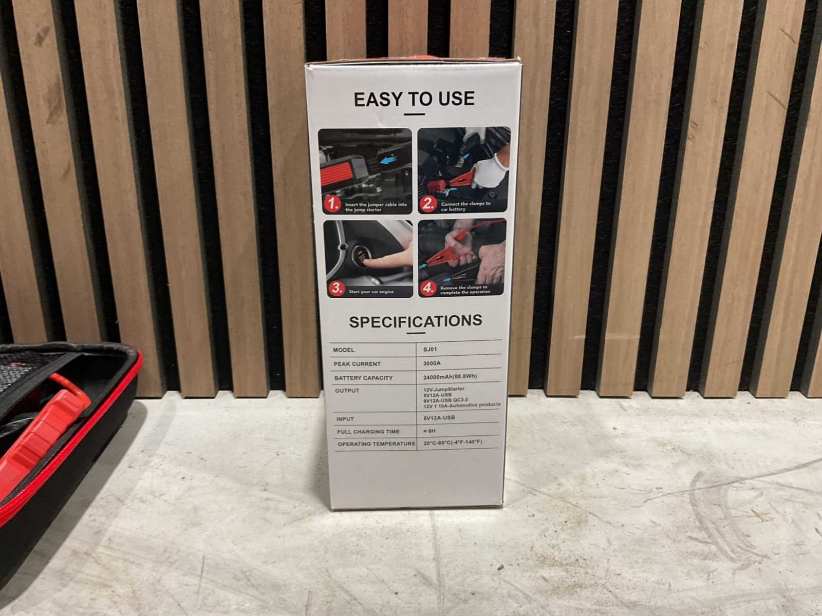 Maximale vermogen: 3000A; Batterij capiciteit: 24000mAh (88.8Wh); Laadtijd: 6 uur; Temperatuur 20-60 graden celcius; 12V/10A DC output; 9V/2A QC 3.0 output; 5V/2A input; 5V/2Aoutput; Positive wire clip; Negative wire clip; LCD Display; Aan/uit knop; Compass; LED licht Merk: Metallo Type: 3000A Bouwjaar: 2024