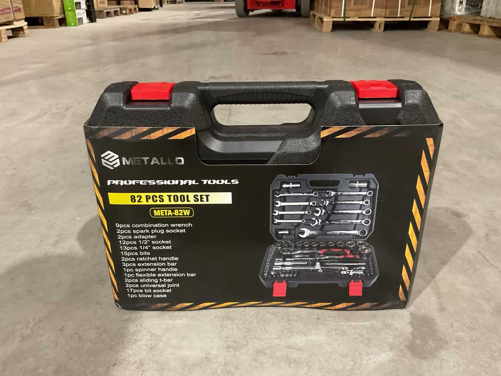 Voorzien van 9 x Ring/steeksleutel; 2 x Bougiesleutel; 2 x adapters; 12 x 1/2"Doppenset; 13 x 1/4" Doppenset; 15 x bitset; 2 x Ratelsleutel; 3 x verlengstukken; 1 x Spinner; 1 x Flexibele verlengstuk; 2 x Sliding T-Bar; 2 x Universele aansluiting; 17 x bitjes set; 1 x Kunststofkoffer; Ongebruikt in doos (Transport afmeting 385 x 80 x 290, Gewicht 5.75 KG Merk: Metallo Met koffer: true Delig: 82 Type: META-82W Bouwjaar: 2025
