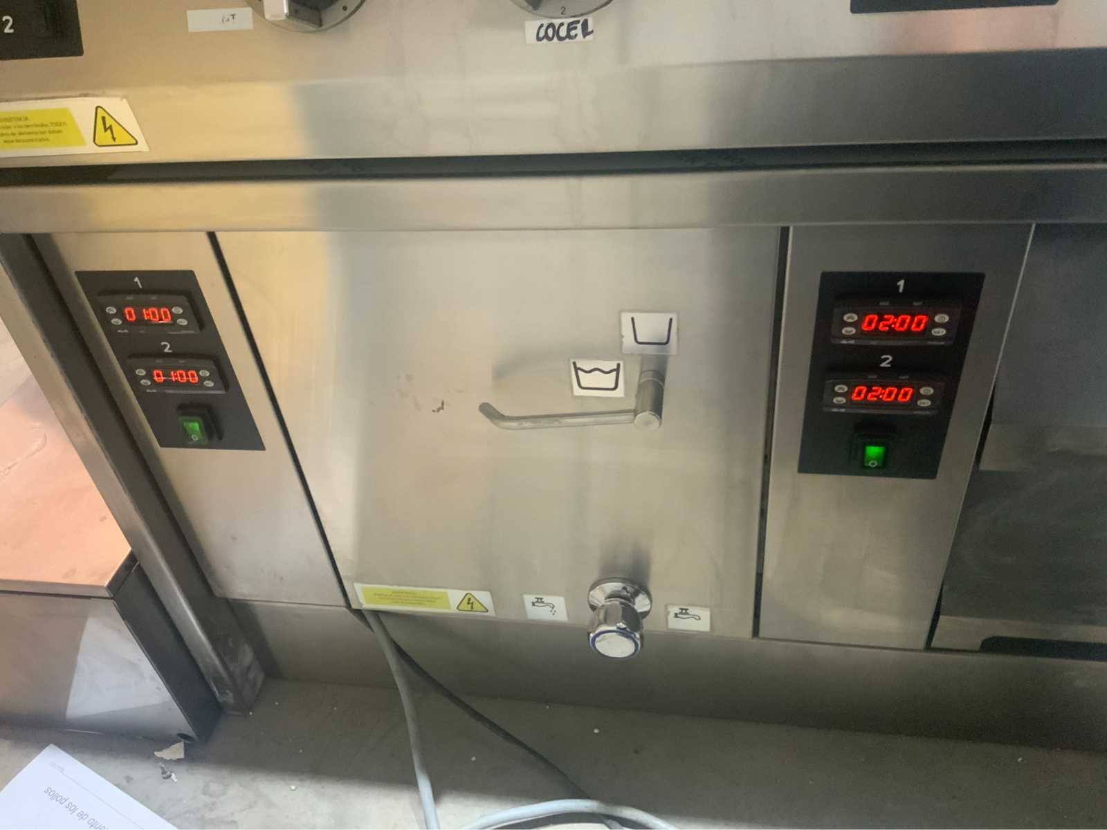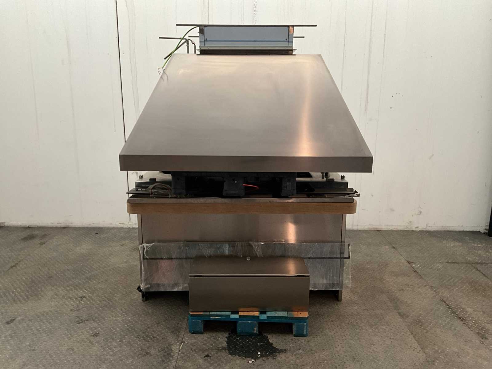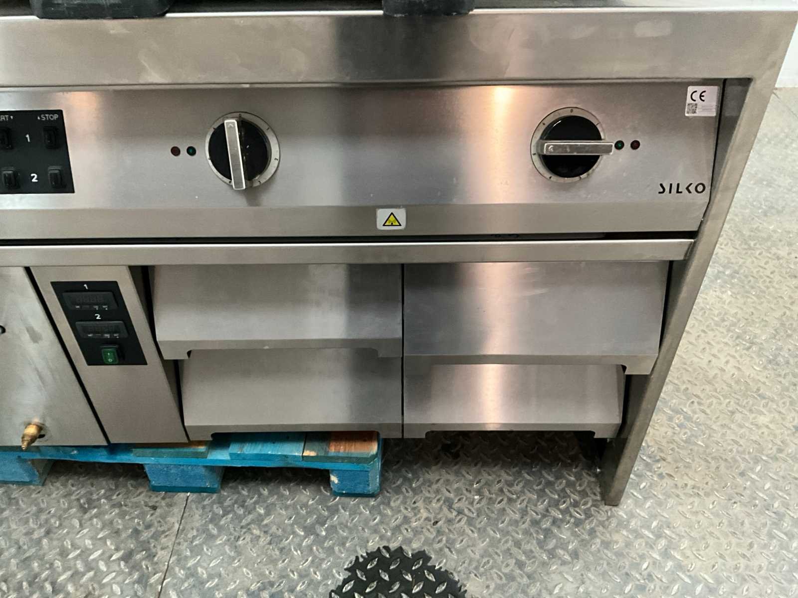 Voorzien van waterfrituur; 2 Shott Ceran inductie wok punten; lades; afzuigkap met verlichting met afmeting van circa 156x120x120cm; 380V aansluiting; Werkhoogte 95cm Merk: Silko Type: Pastakeuken Lengte: 156 Breedte: 110 Hoogte: 131 Materiaal: Rvs
