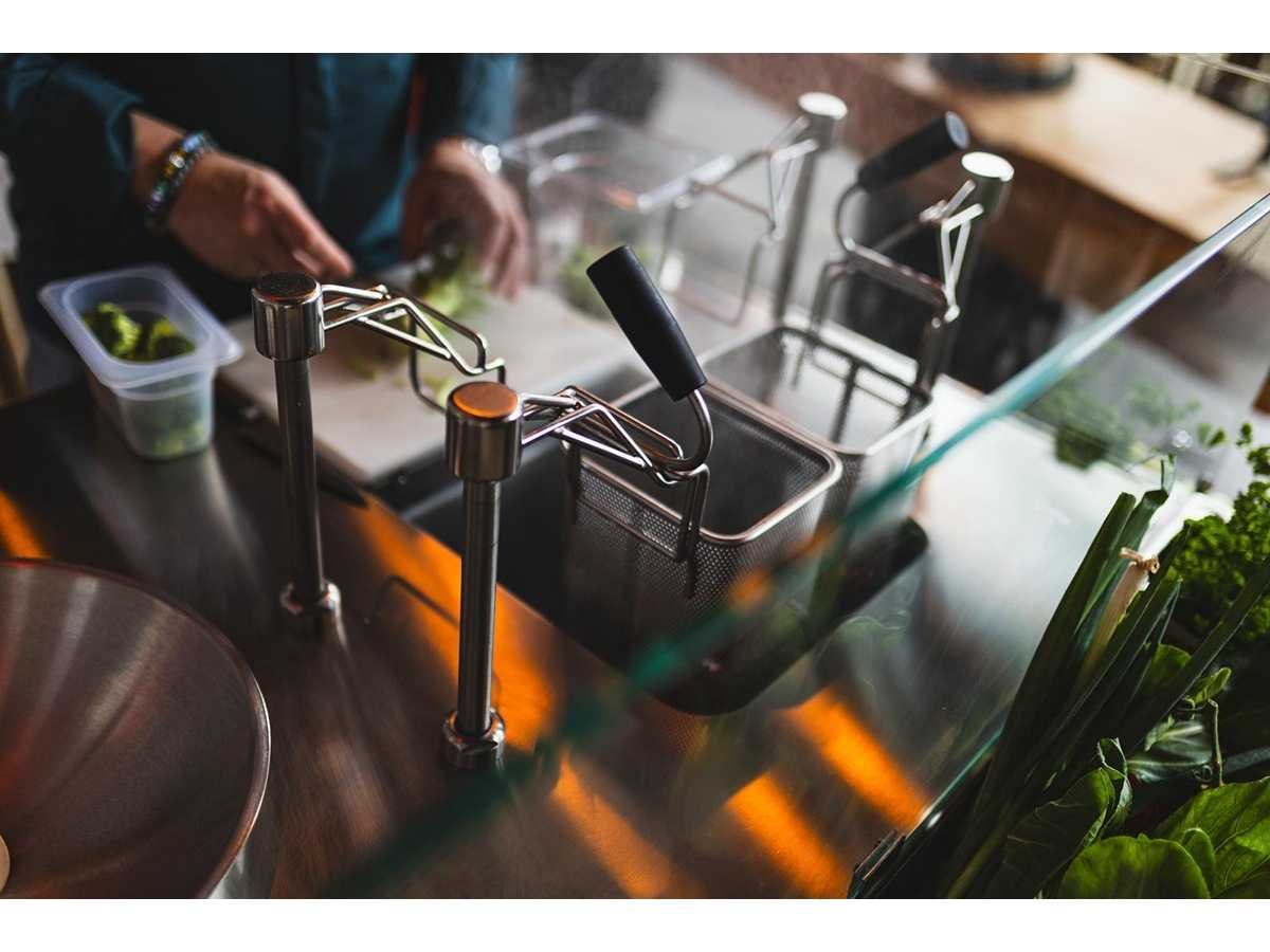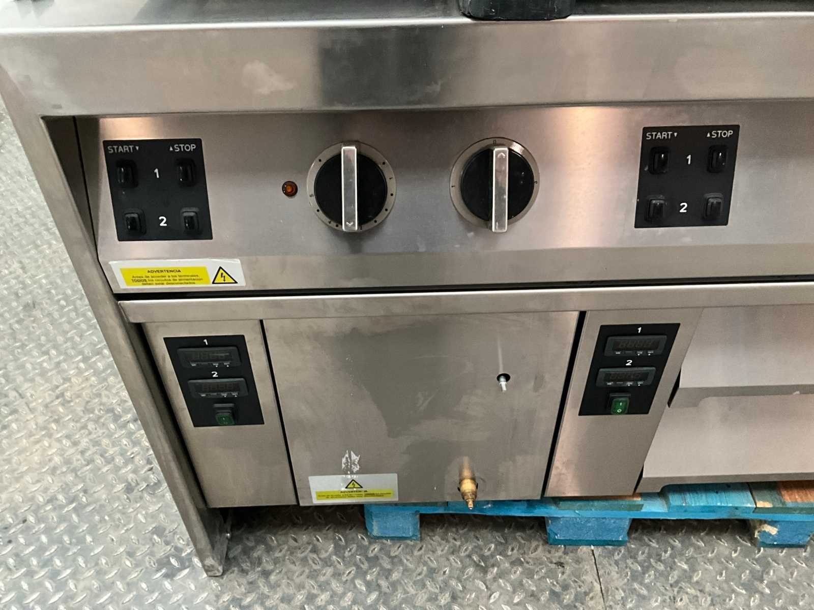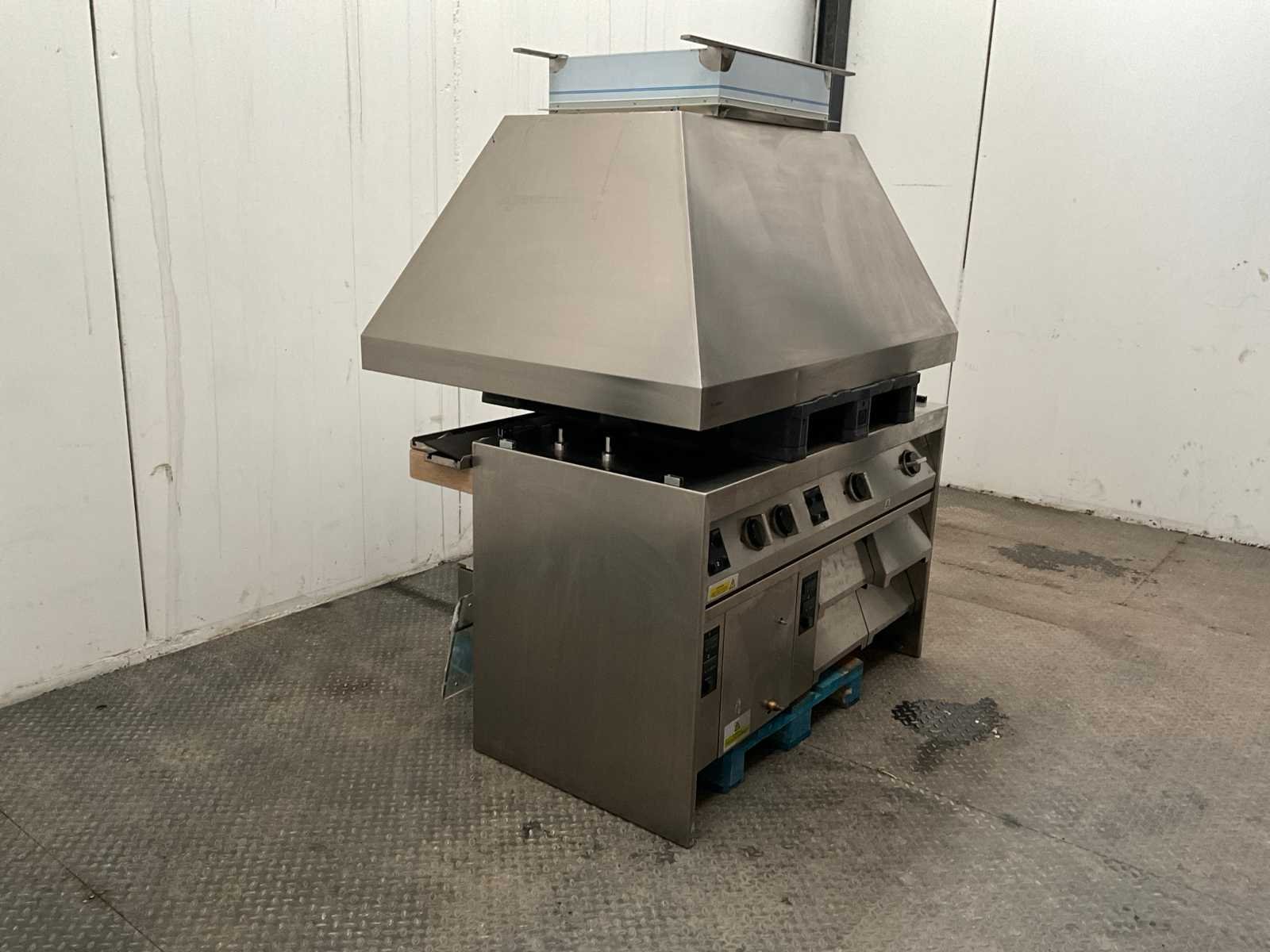 Voorzien van waterfrituur; 2 Shott Ceran inductie wok punten; lades; afzuigkap met verlichting met afmeting van circa 156x120x120cm; 380V aansluiting; Werkhoogte 95cm Merk: Silko Type: Pastakeuken Lengte: 156 Breedte: 110 Hoogte: 131 Materiaal: Rvs