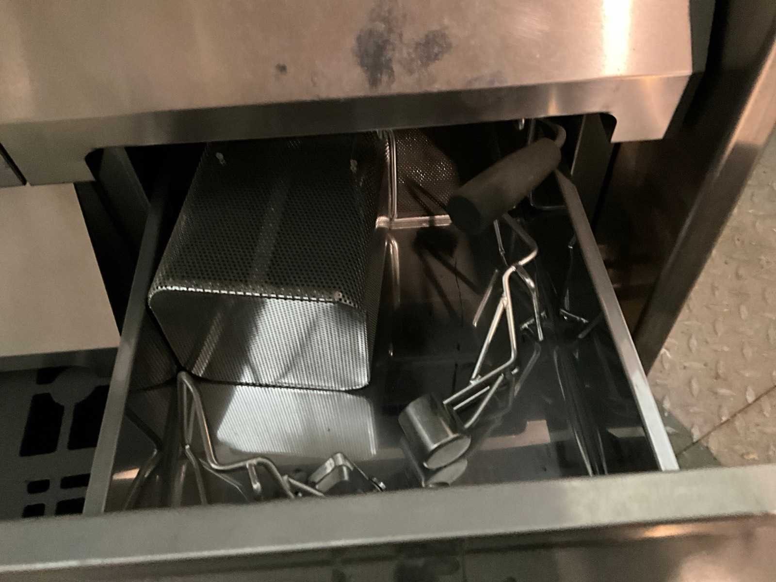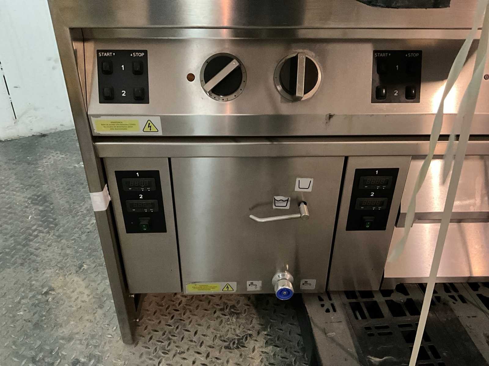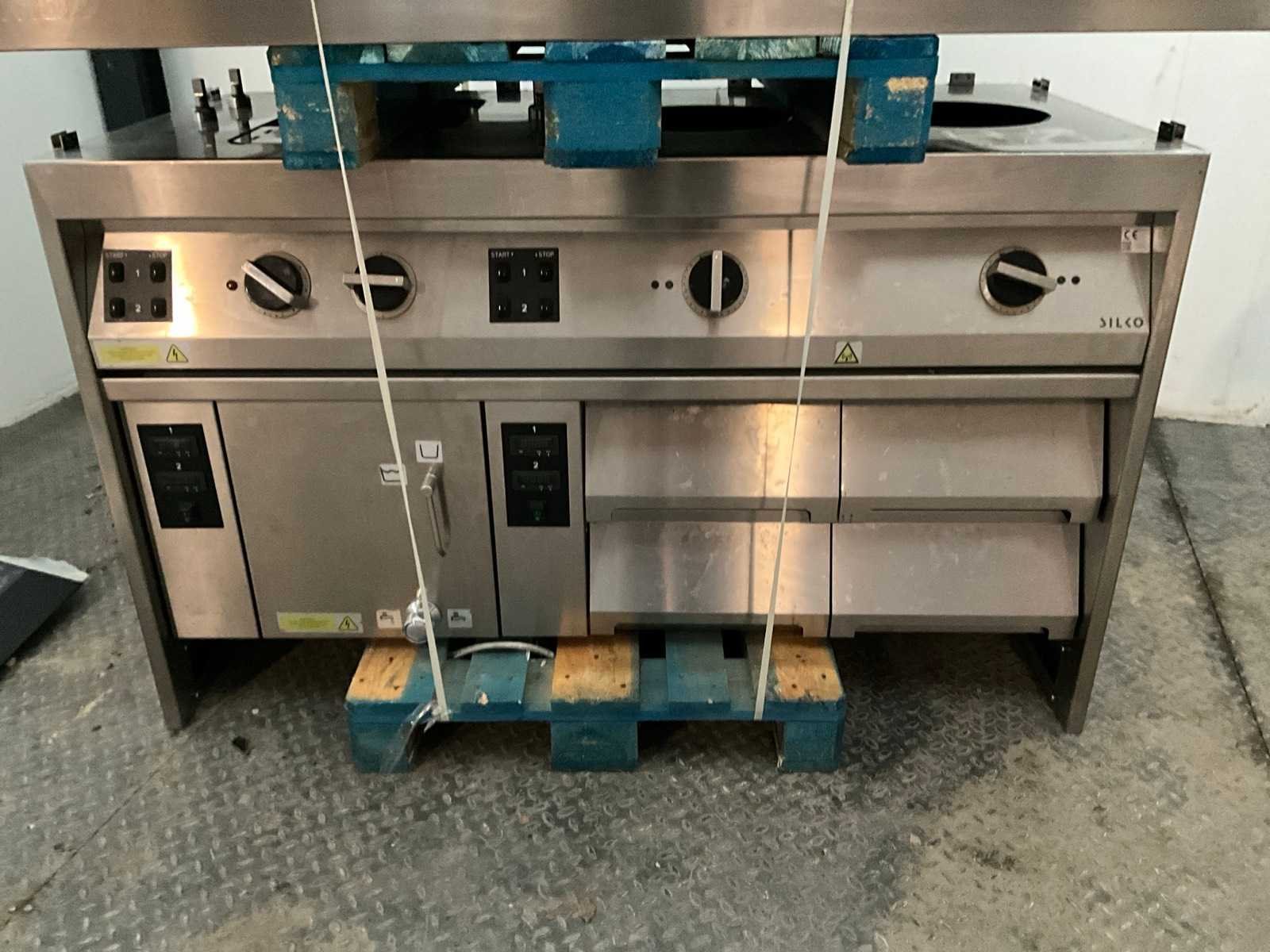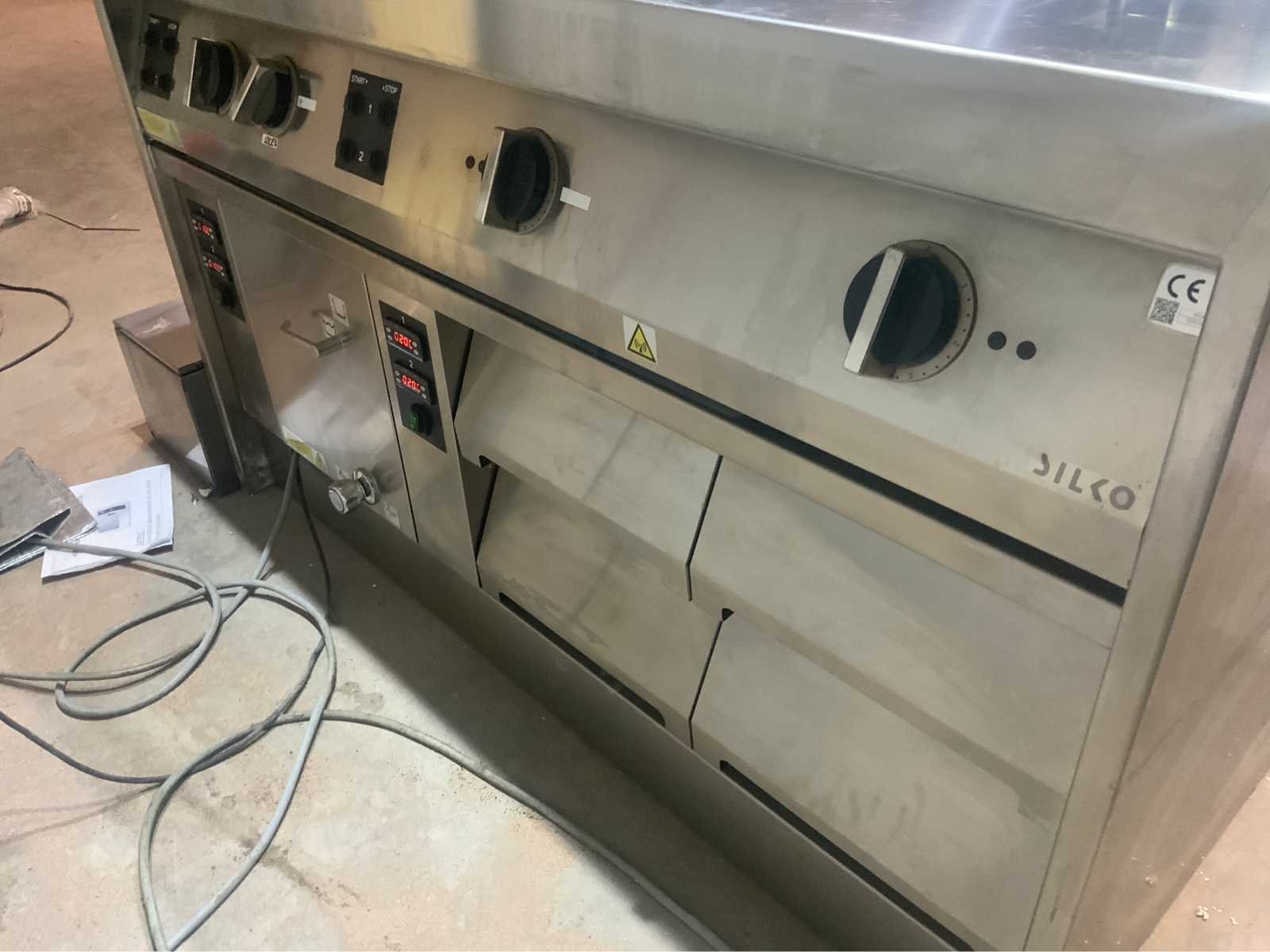 Voorzien van waterfrituur; 2 Shott Ceran inductie wok punten; lades; afzuigkap met verlichting met afmeting van circa 156x120x120cm; 380V aansluiting; Werkhoogte 95cm Merk: Silko Type: Pastakeuken Lengte: 156 Breedte: 110 Hoogte: 131 Materiaal: Rvs