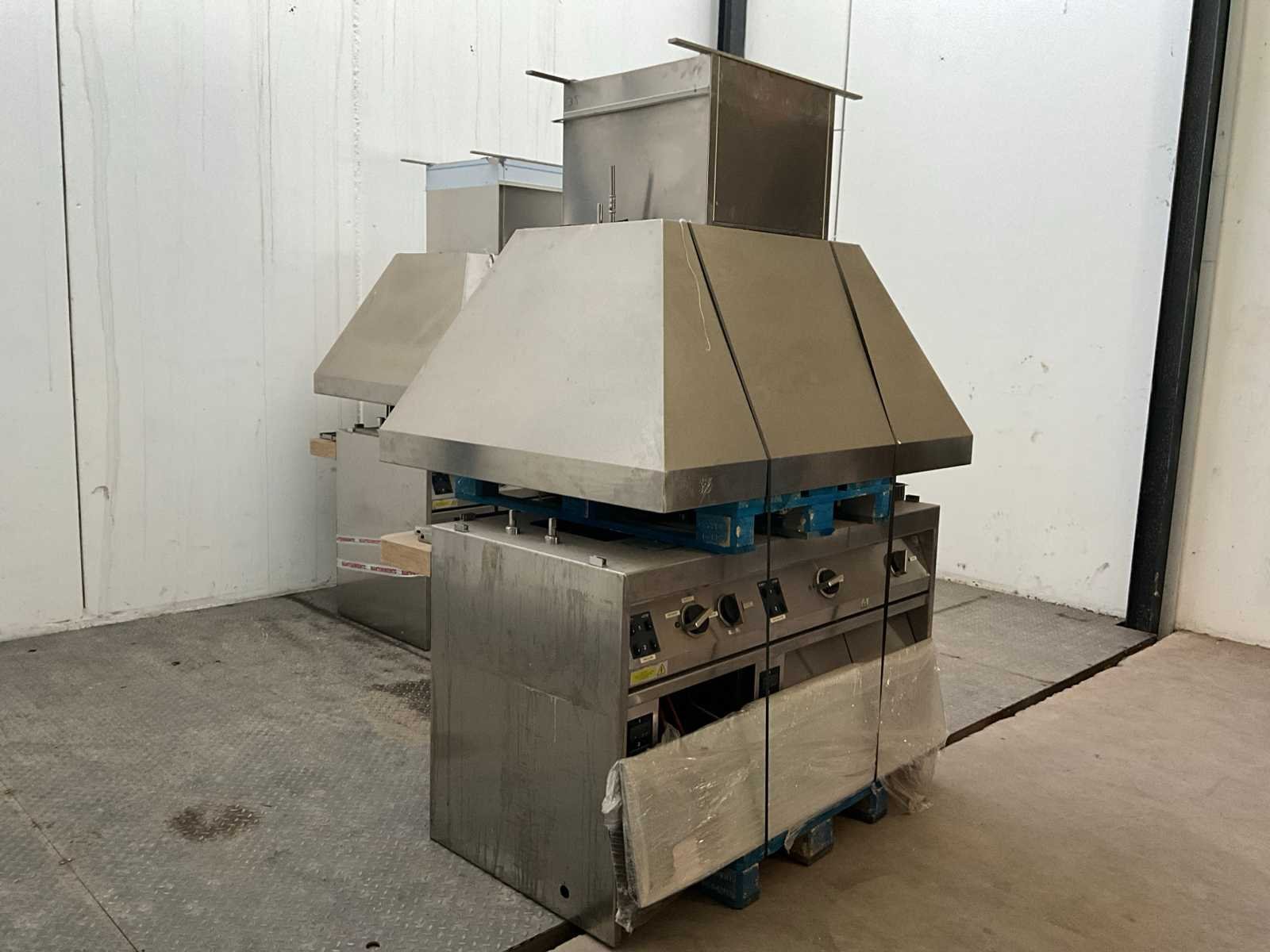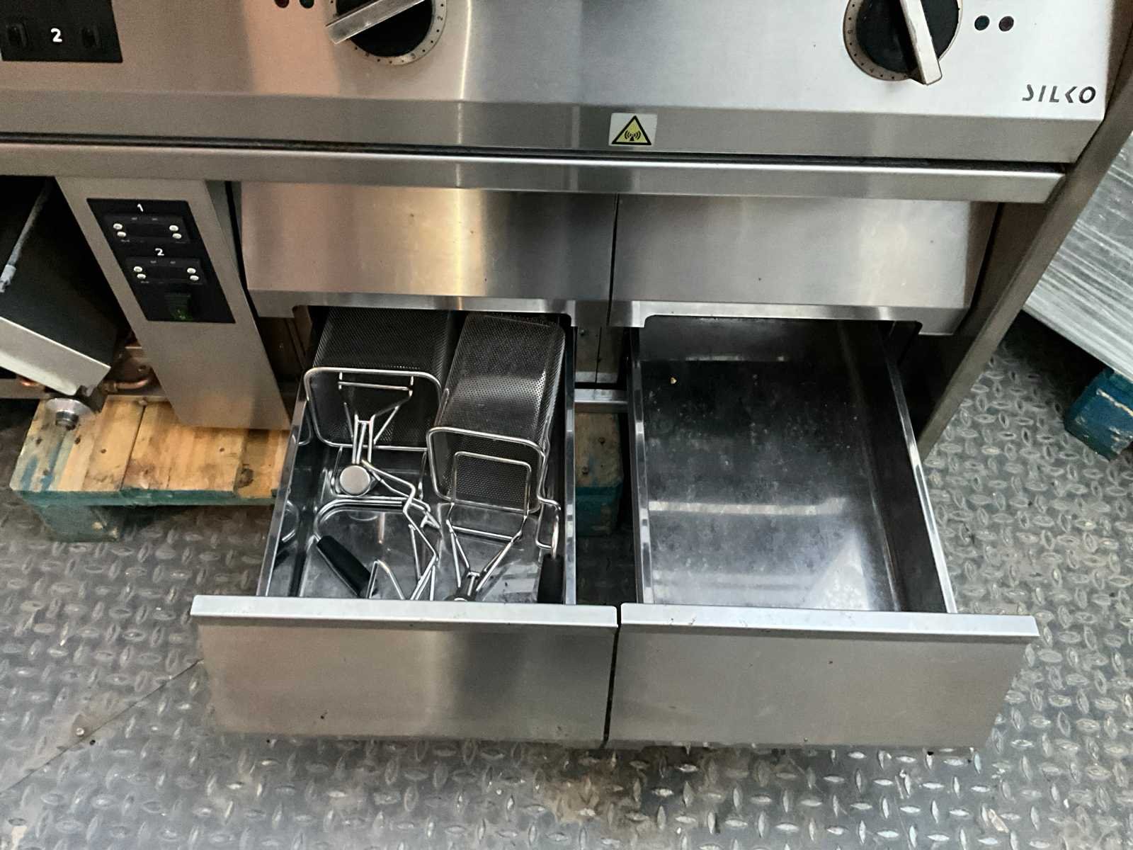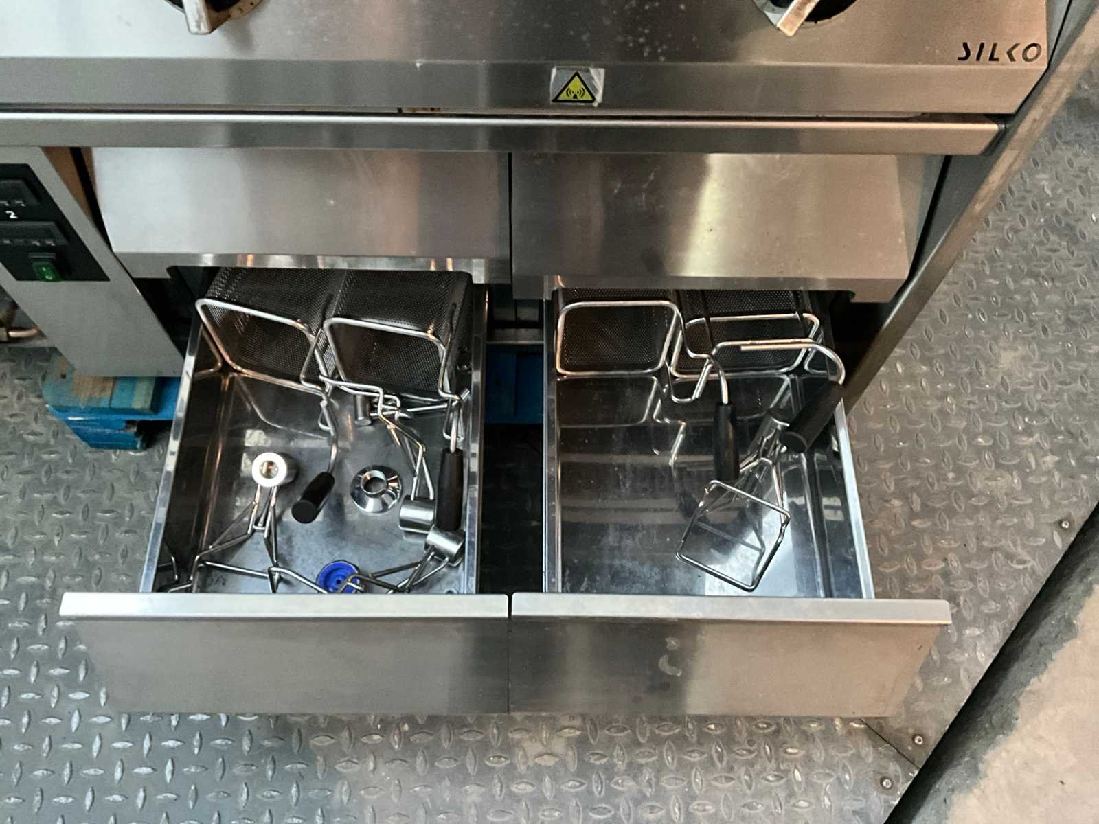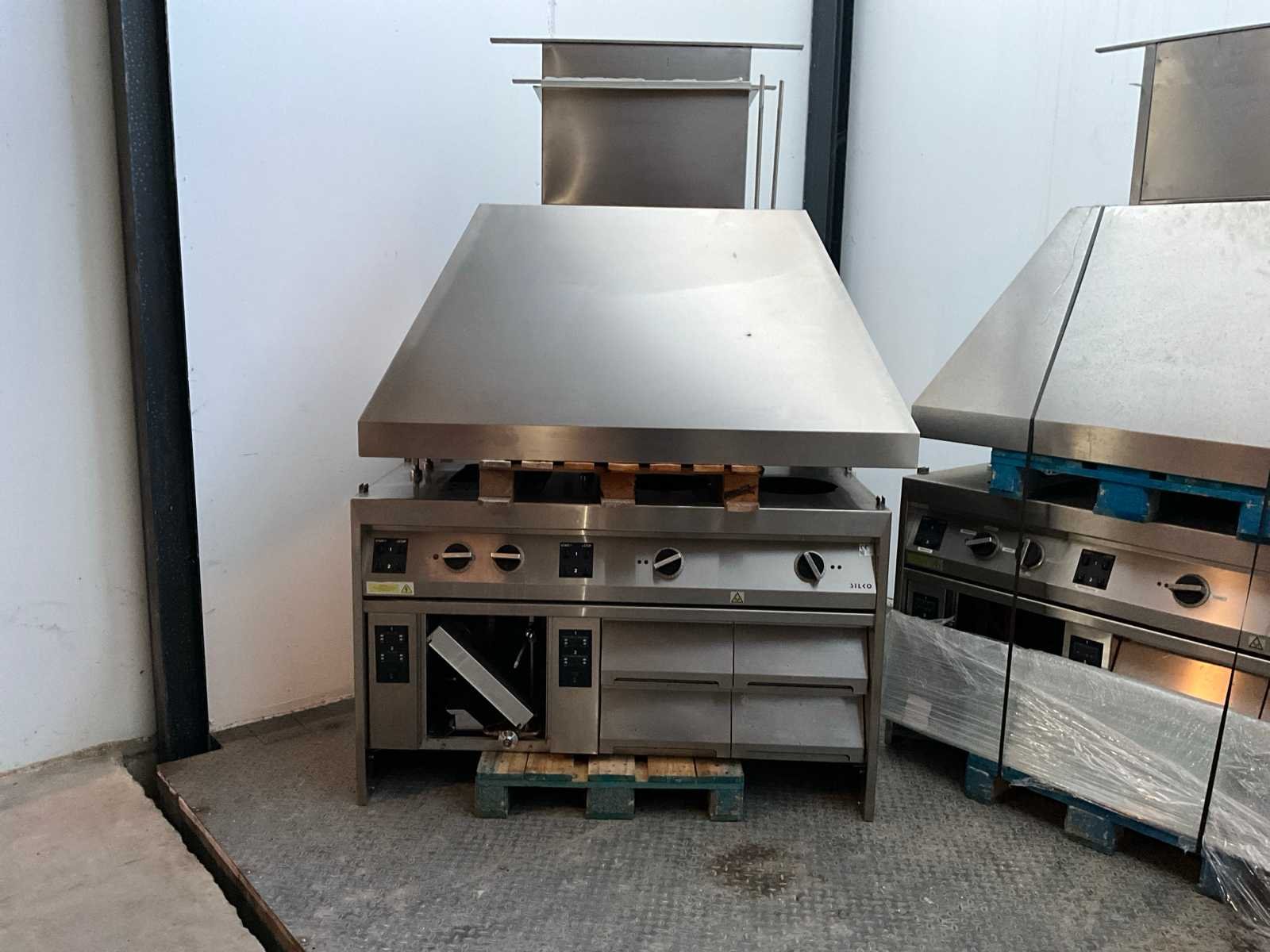 Voorzien van waterfrituur; 2 Shott Ceran inductie wok punten; lades; afzuigkap met verlichting met afmeting van circa 156x120x120cm; 380V aansluiting; Werkhoogte 95cm Merk: Silko Type: Pastakeuken Lengte: 156 Breedte: 110 Hoogte: 131 Materiaal: Rvs