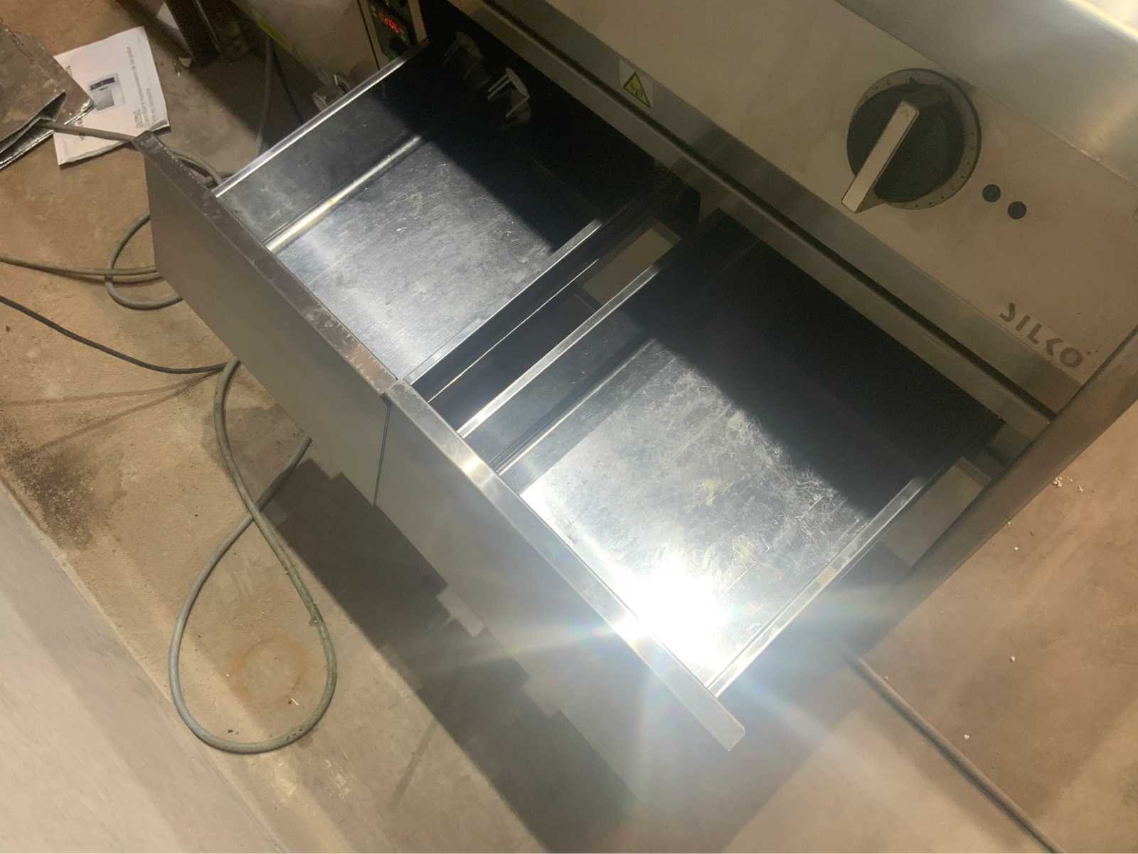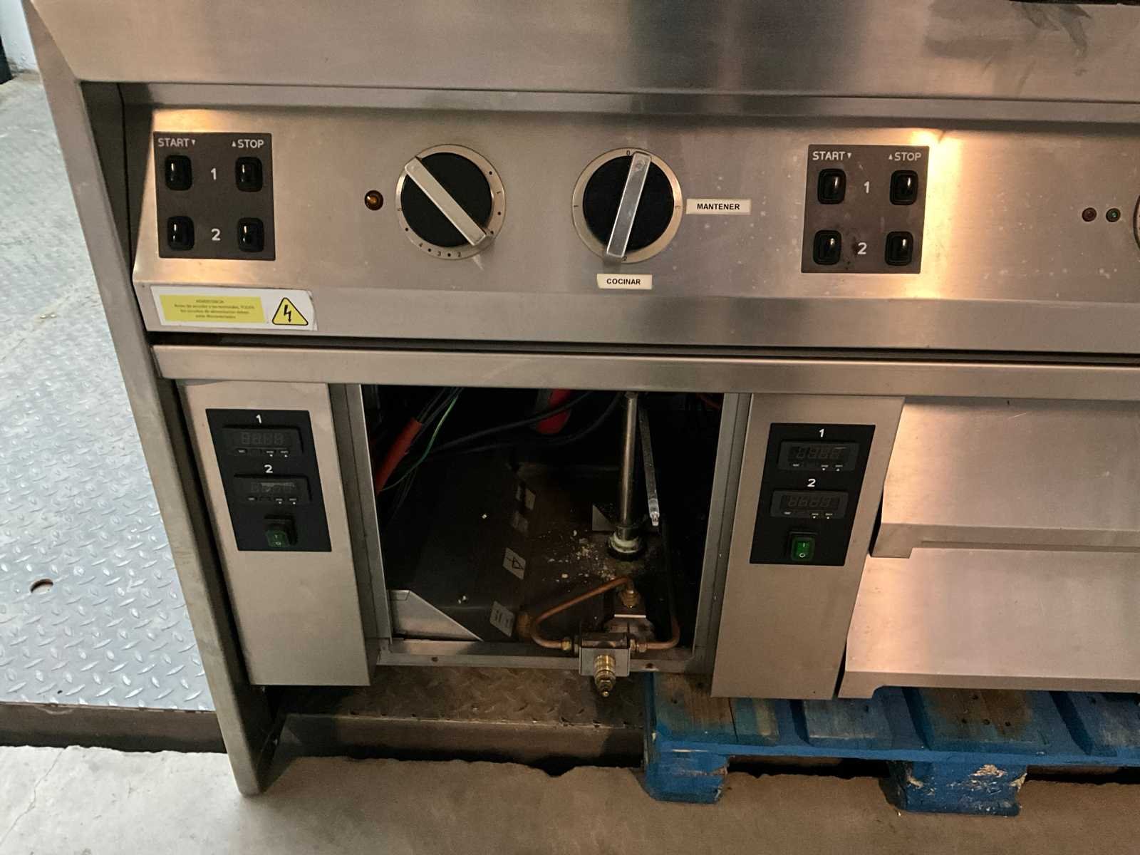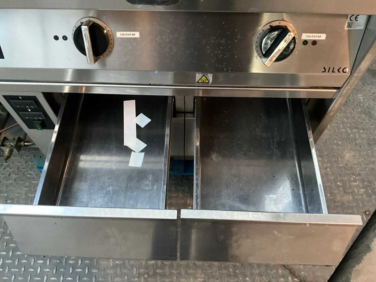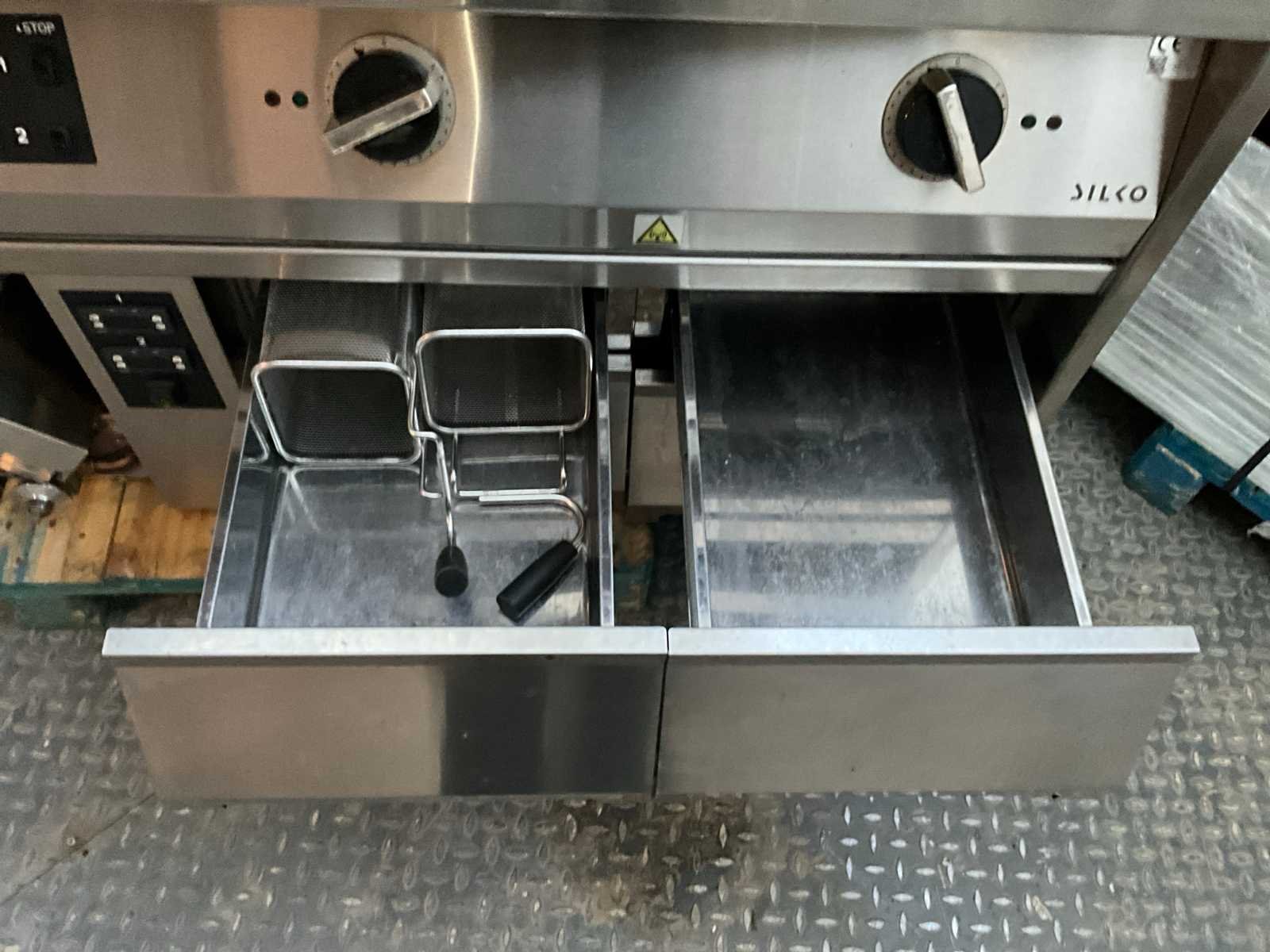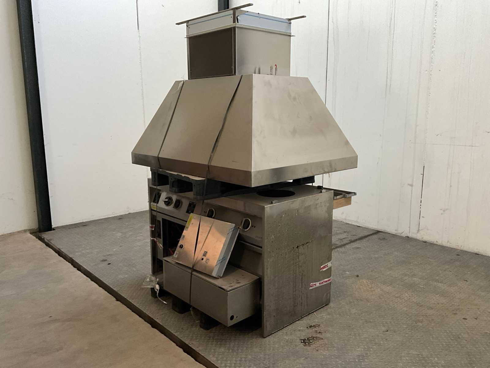 Voorzien van waterfrituur; 2 Shott Ceran inductie wok punten; lades; afzuigkap met verlichting met afmeting van circa 156x120x120cm; 380V aansluiting; Werkhoogte 95cm Merk: Silko Type: Pastakeuken Lengte: 156 Breedte: 110 Hoogte: 131 Materiaal: Rvs