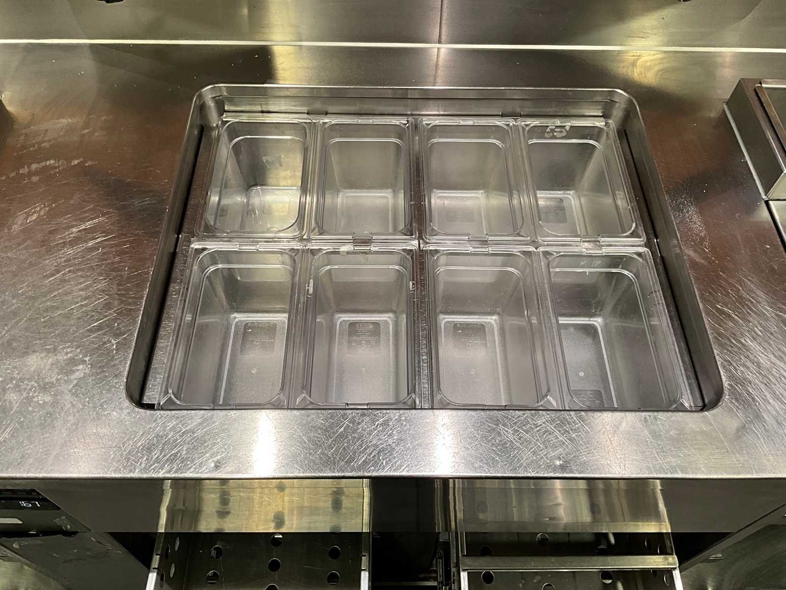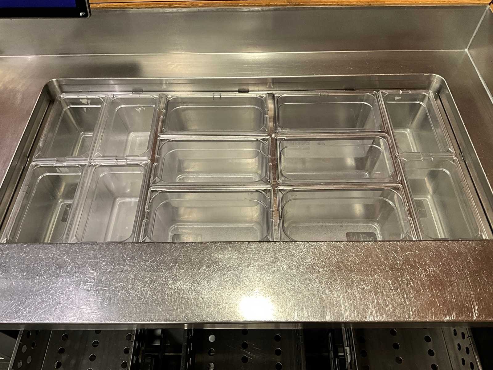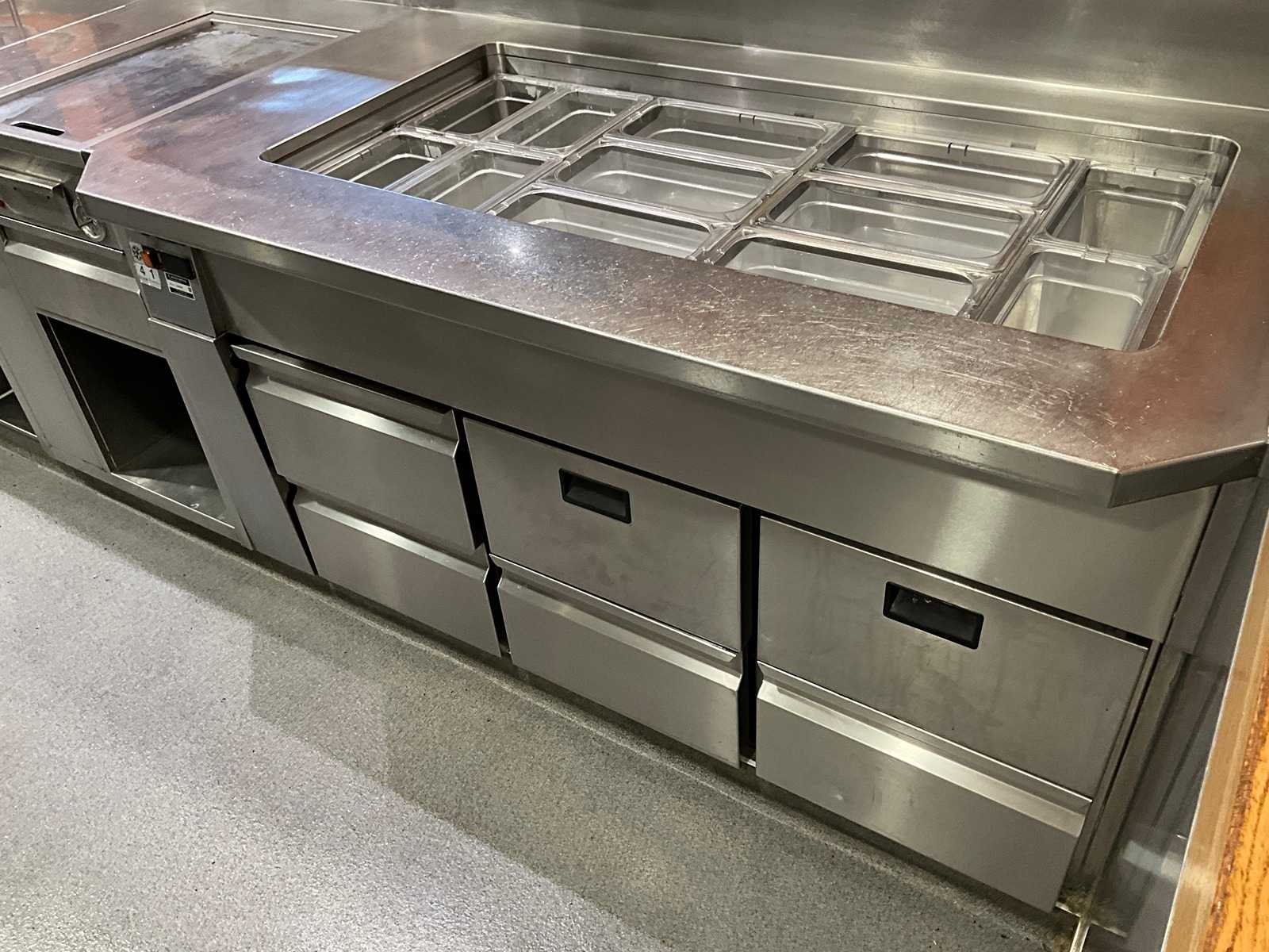 Koelwerkbanklijn met 2 saladettes en 10 gekoelde lades. LET OP! Pastakokers, inductiewokken en bakplaten behoren NIET tot de kavel. LET OP! Deze kavel maakt onderdeel uit van een combinatie kavel (kavelnummer 13) deze kavel blijft onder gunning totdat de combinatie kavel gesloten is. LET OP! Kavel betreft een apparaat wat aangesloten is op een centraal koelsysteem. Kavel heeft geen eigen koelcompressor. Het centrale koelsysteem is reeds professioneel leeg gepompt. Hiervoor zijn additionele kosten van toepassing. De koper is zelf verantwoordelijk voor het professioneel demonteren van de kavel. Kavel kan aangesloten zijn op het elektra-, water- en/of gasleidingnetwerk. Bekabeling en/of leidingen dienen netjes afgedopt en ordelijk achter gelaten te worden. Schade aan het pand of andere zaken zal op de koper worden verhaald. Wij adviseren u gebruik te maken van de kijkdag om een plan voor demontage op te stellen. Merk: AKE-Ideal Digitale uitlezing: true Rvs: true Aantal laden: 10pcs Lengte: 630cm Breedte: 75cm Hoogte: 104cm