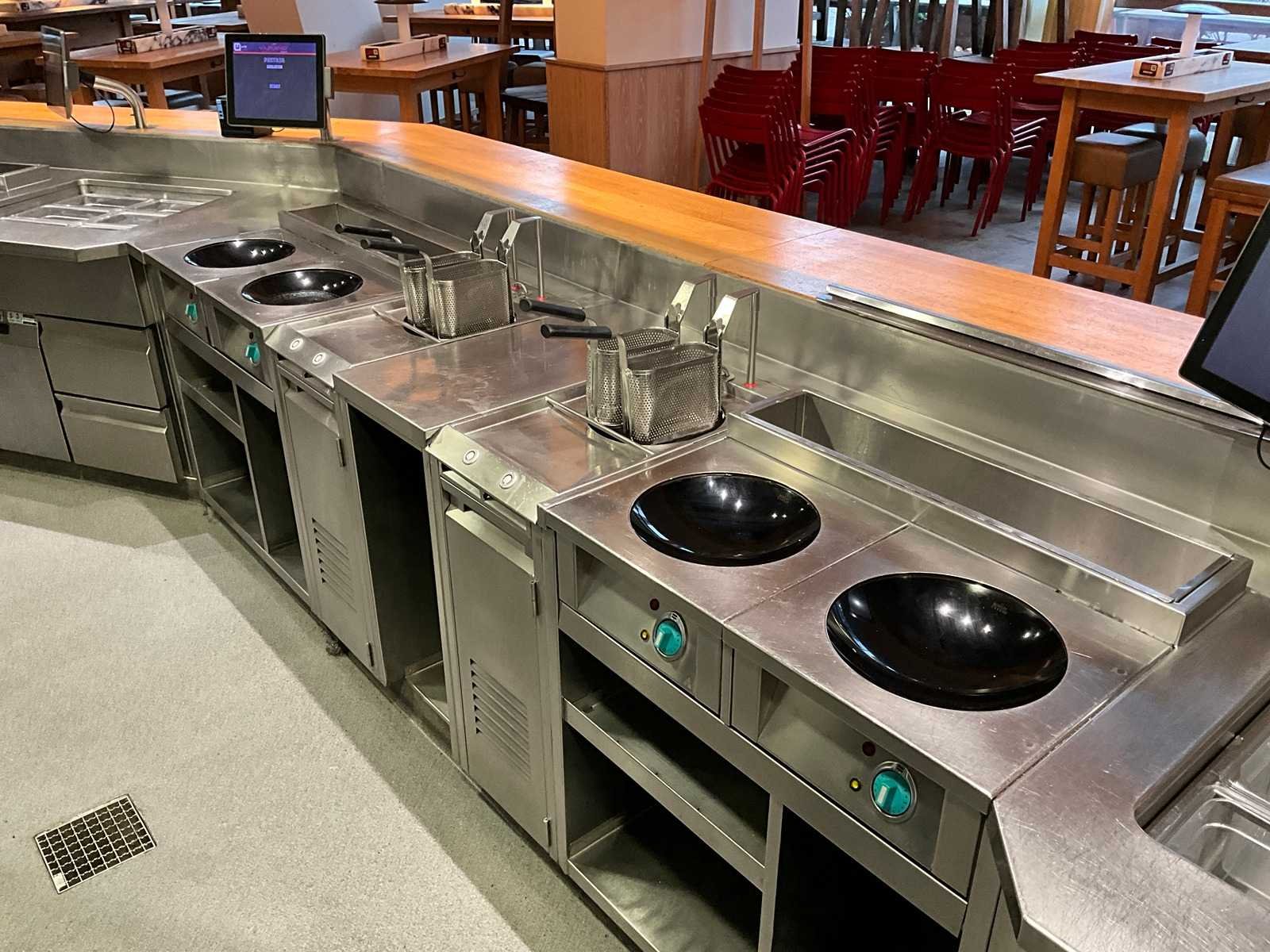 Deze kavel betreft een combinatiekavel van kavels 10 t/m 33; Voor beschrijvingen zie informatie bij desbetreffende kavelnummers. Complete frontcooking counter met ombouw, afzuigkap en apparatuur. V.v. 8x inductiewok, 4x pastakoker, koelwerkbanken, saladettes, & houten ombouw. LET OP! Kavel betreft een apparaat wat aangesloten is op een centraal koelsysteem. Kavel heeft geen eigen koelcompressor. Het centrale koelsysteem is reeds professioneel leeg gepompt. Hiervoor zijn additionele kosten van toepassing. De koper is zelf verantwoordelijk voor het professioneel demonteren van de kavel. Kavel kan aangesloten zijn op het elektra-, water- en/of gasleidingnetwerk. Bekabeling en/of leidingen dienen netjes afgedopt en ordelijk achter gelaten te worden. Schade aan het pand of andere zaken zal op de koper worden verhaald. Wij adviseren u gebruik te maken van de kijkdag om een plan voor demontage op te stellen. Totale afmeting Breedte: 9000mm