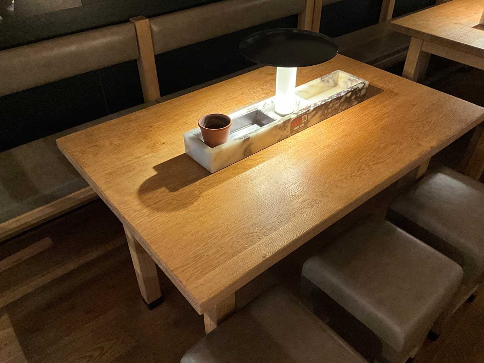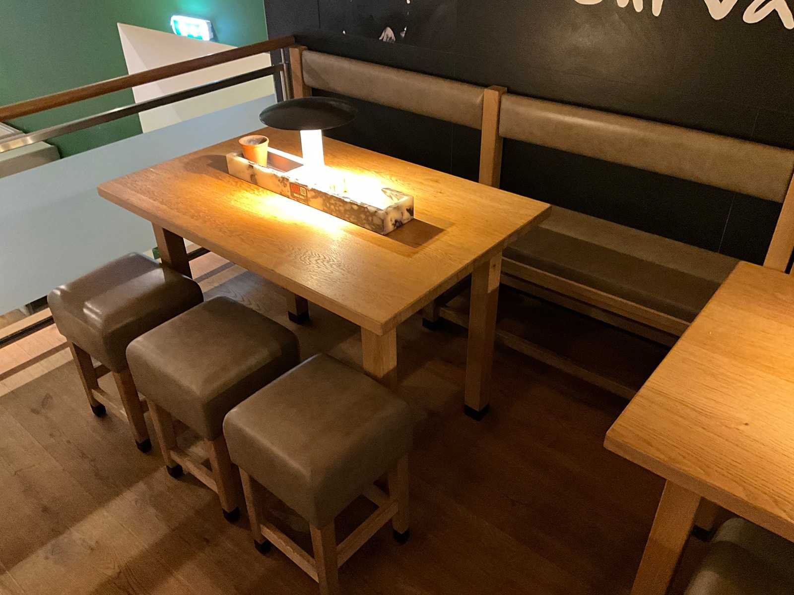 Tafel met marmeren opbouw en verlichting. Lengte bank: 240x50x94 zithoogte 55 cm. Afmeting krukken 37x37x57 cm. De tafel is reeds ontkoppeld van de vloer en elektra. Hiervoor zijn de additionele kosten van toepassing. Merk: Hutten Totale afmeting L: 1250mm Totale afmeting Breedte: 800mm Totale afmeting Hoogte: 850mm Hout: true