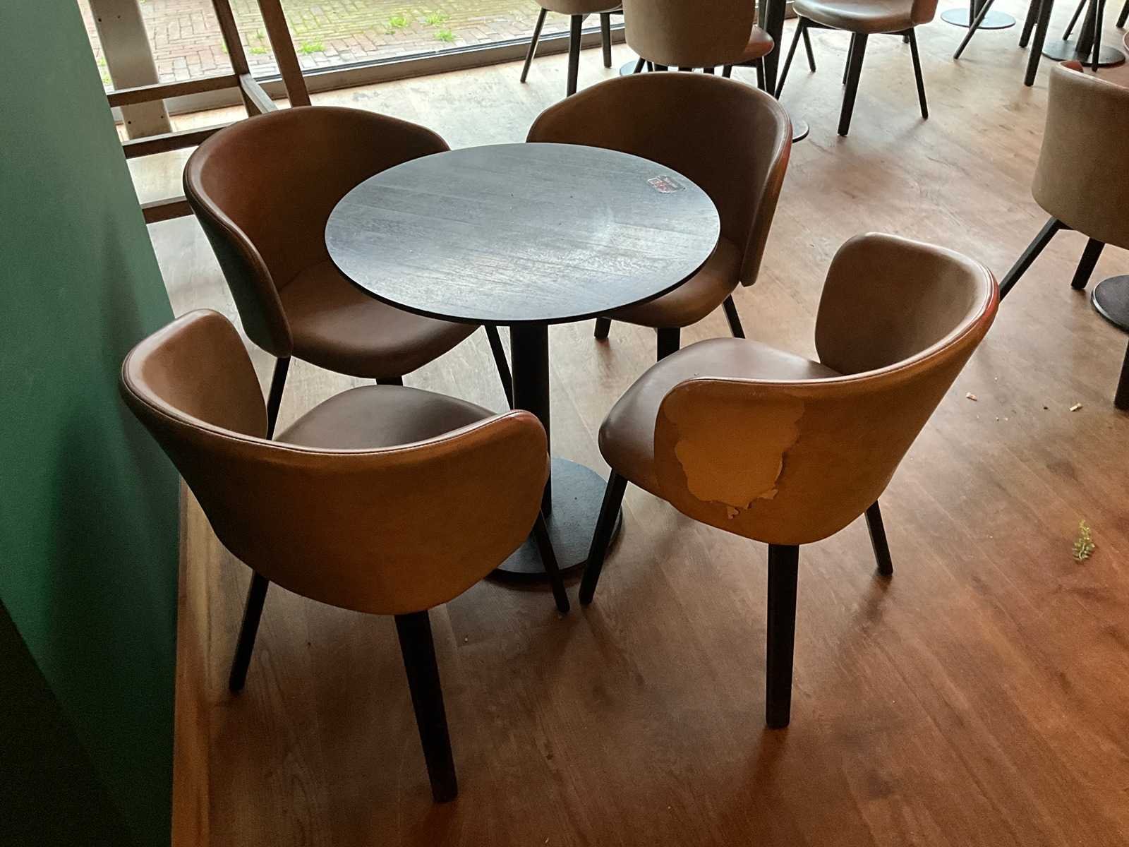 Afmeting tafel Ø 70 cm, hoogte 74 cm. Afmeting stoelen: 64x48x78 cm, zithoogte 45 cm. Merk: Hutten