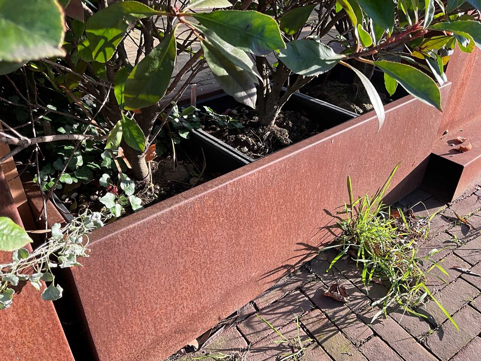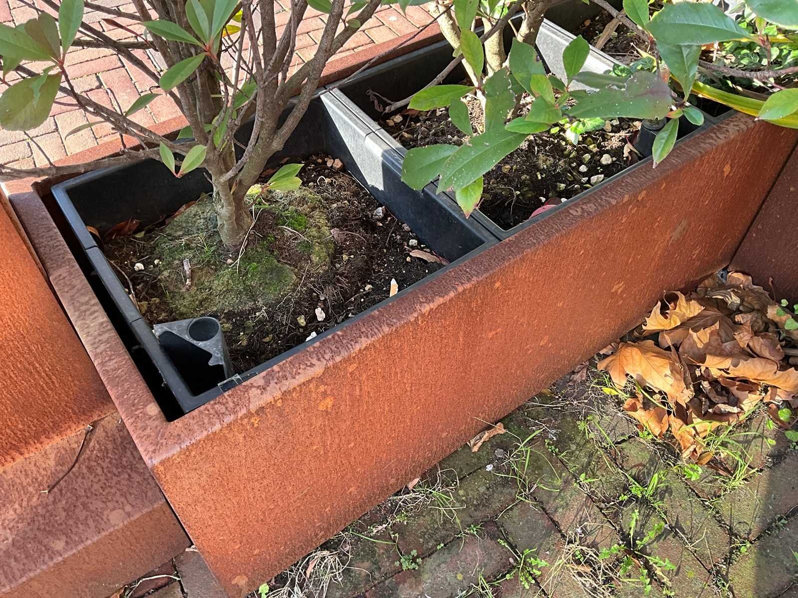 Metalen plantenbak v.v. 3 stuks Lechuza Cubico 40 binnenpot. 1x hoogte 80 cm. 1x hoogte 40 cm. Lengte: 120cm Breedte: 45cm