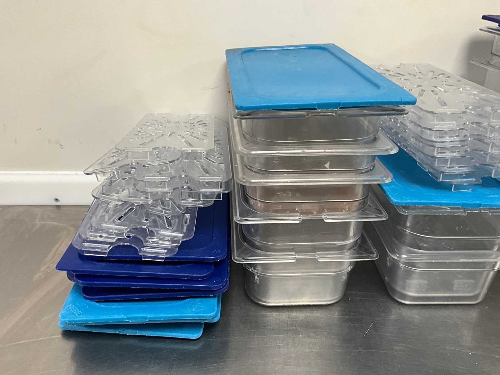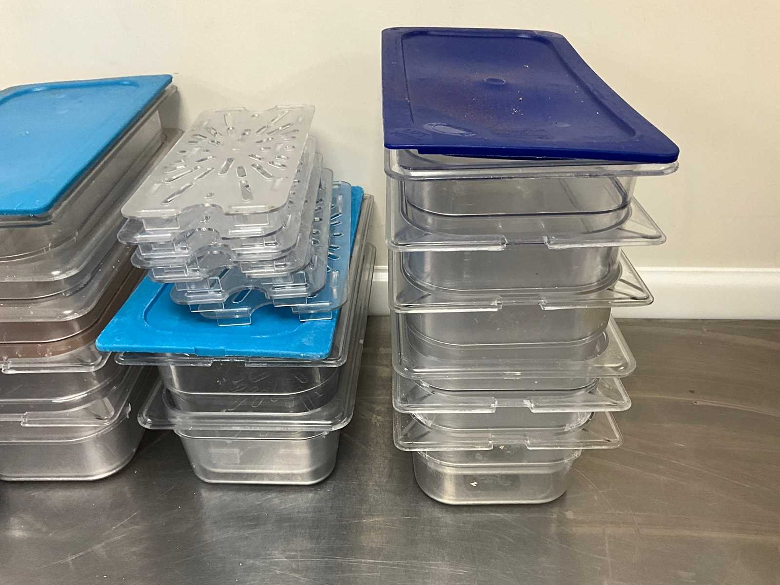 Partij betreft 12x bak, 18x deksel en 12x uitlekrooster. Merk: Carlisle Type: GN 1/3