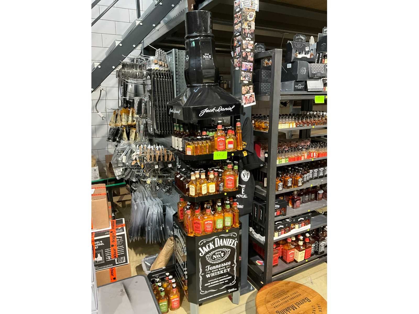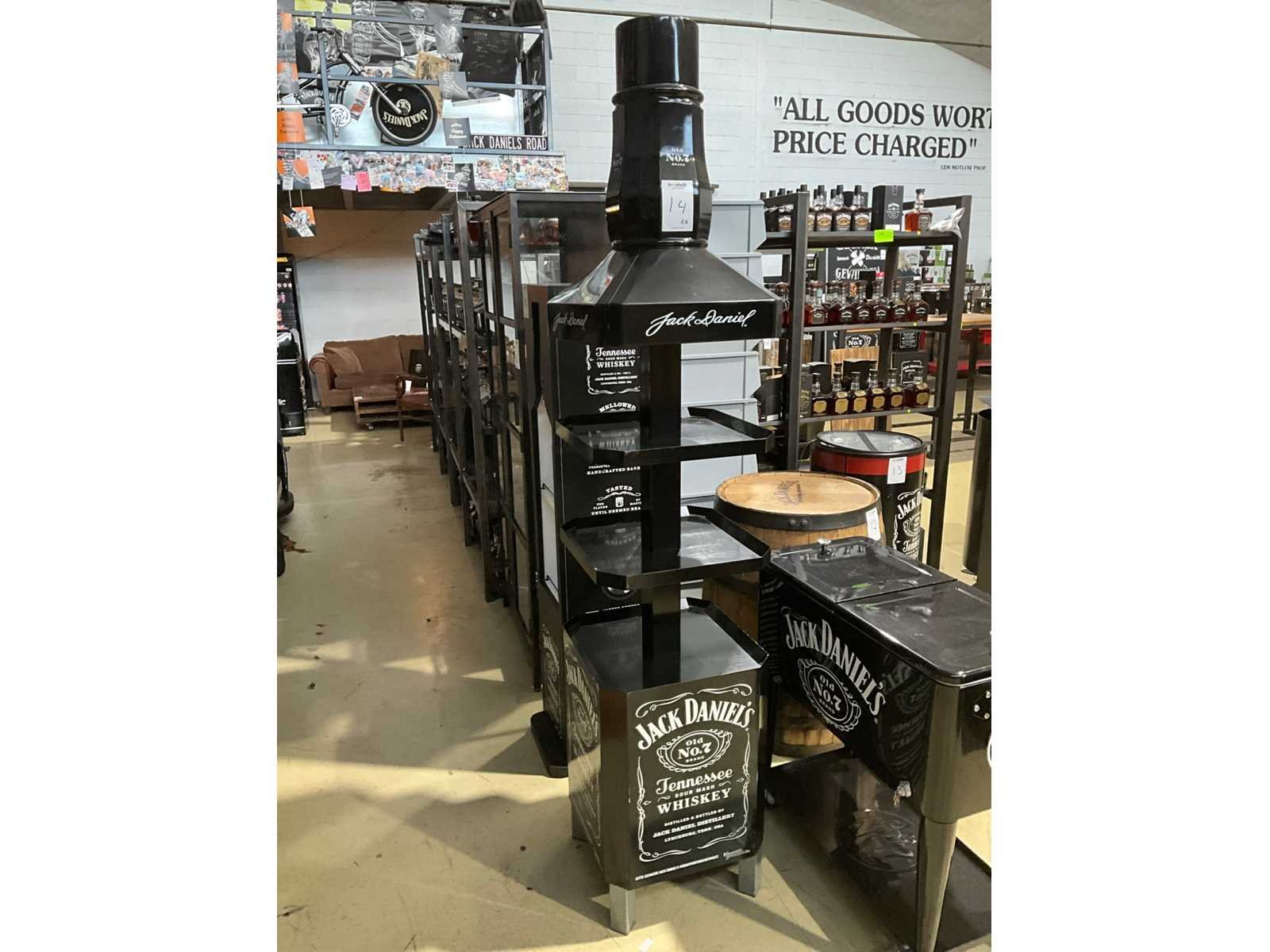 Fles vormig meubel, Zonder inhoud. Metalen basis met plastic top. Set van 2. Merk: Jack Daniels Lengte: 45cm Breedte: 45cm Hoogte: 220cm