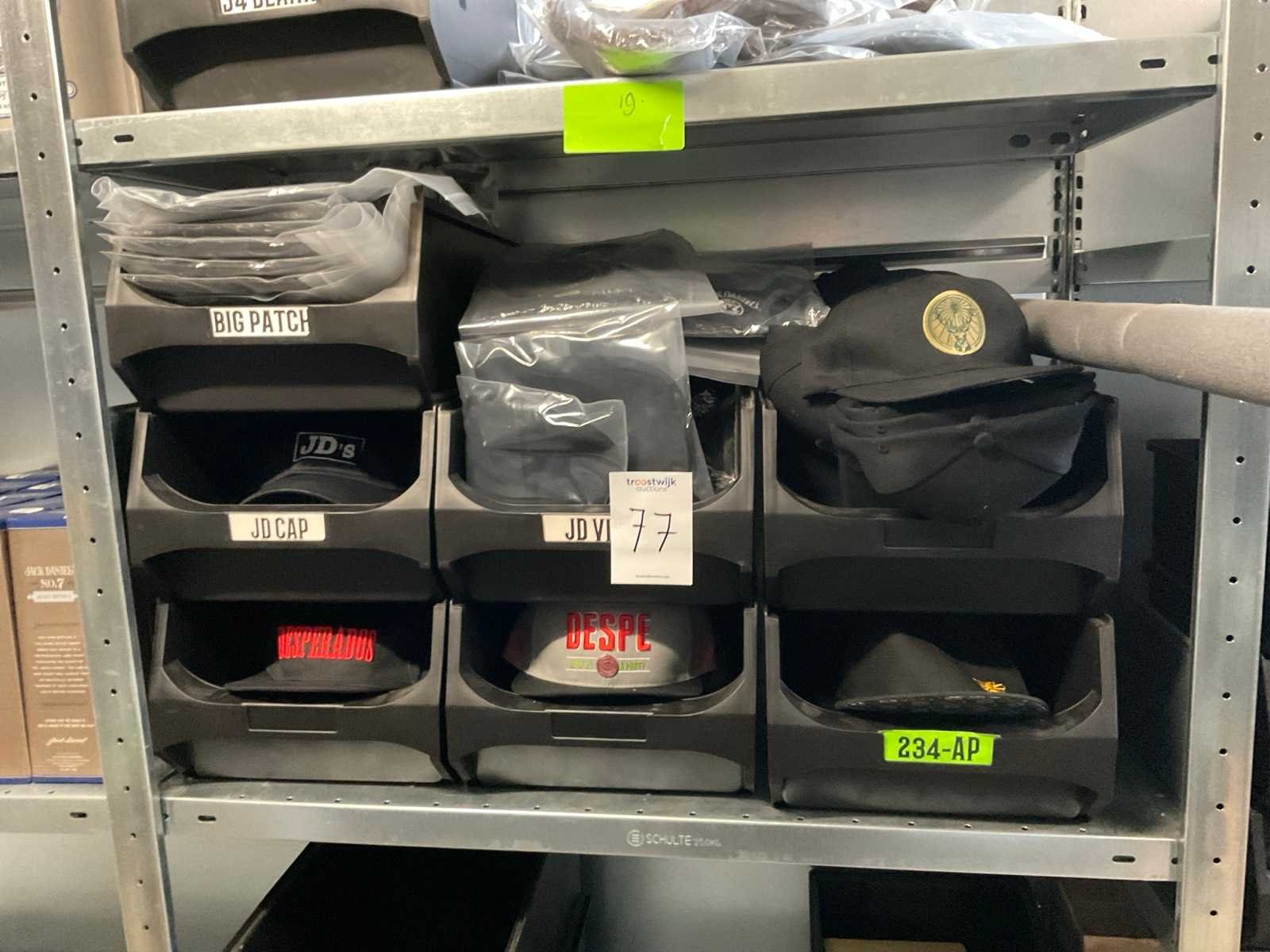 220 CAPS AND WINTERHATS: 40 x Jagermeister cap - 20x Rode despo - 20 x JD - 26 x Grijze Despo - 5 x JD vis - 8 x Honey caps - 10 x Apple - 25 x Big patch - 19x wobble old - 2 wobble new - 5 x 1588 - 12 x beanie - 5 x fisher hat - 20x 150th - 5 x brown Honey