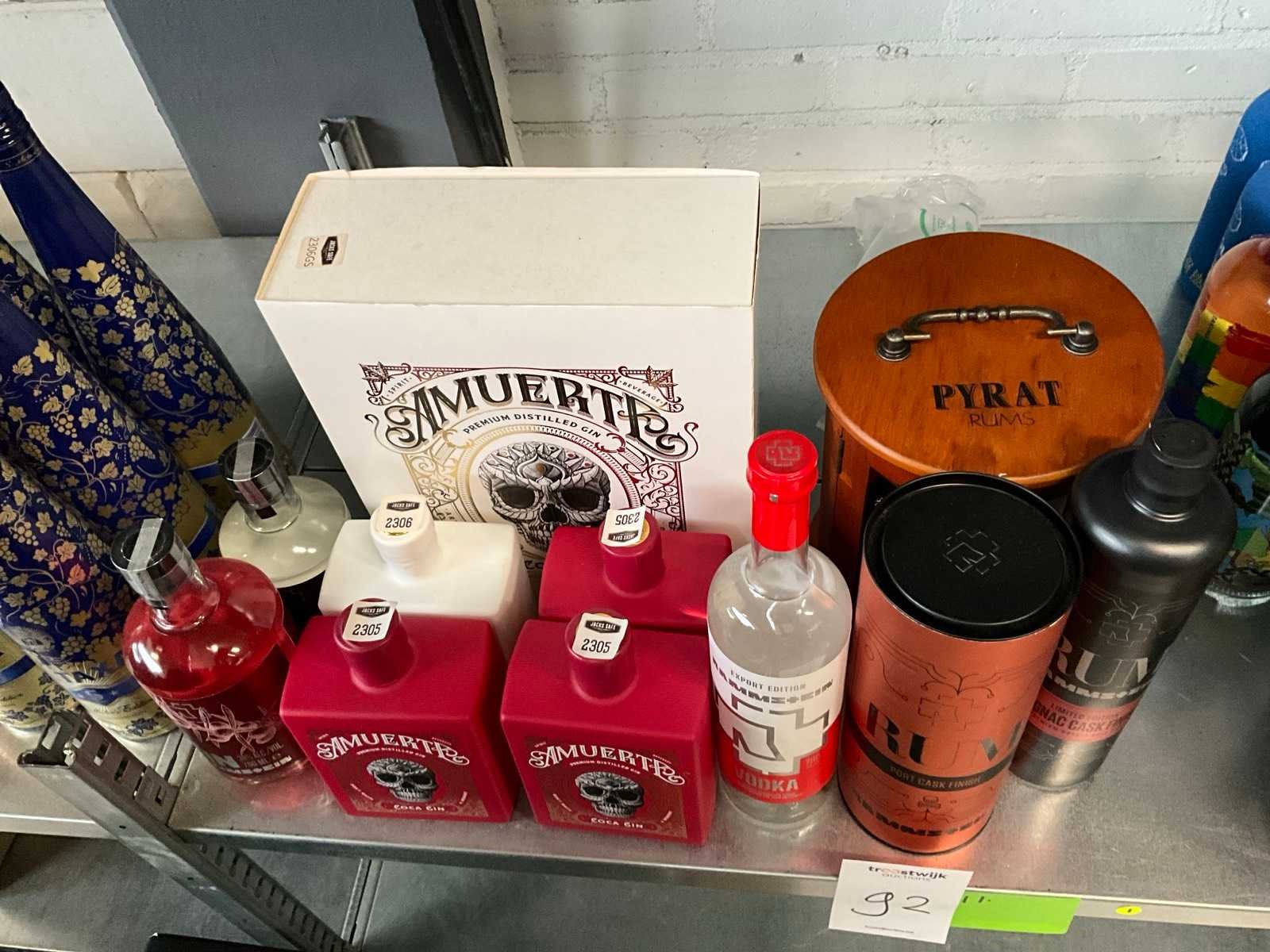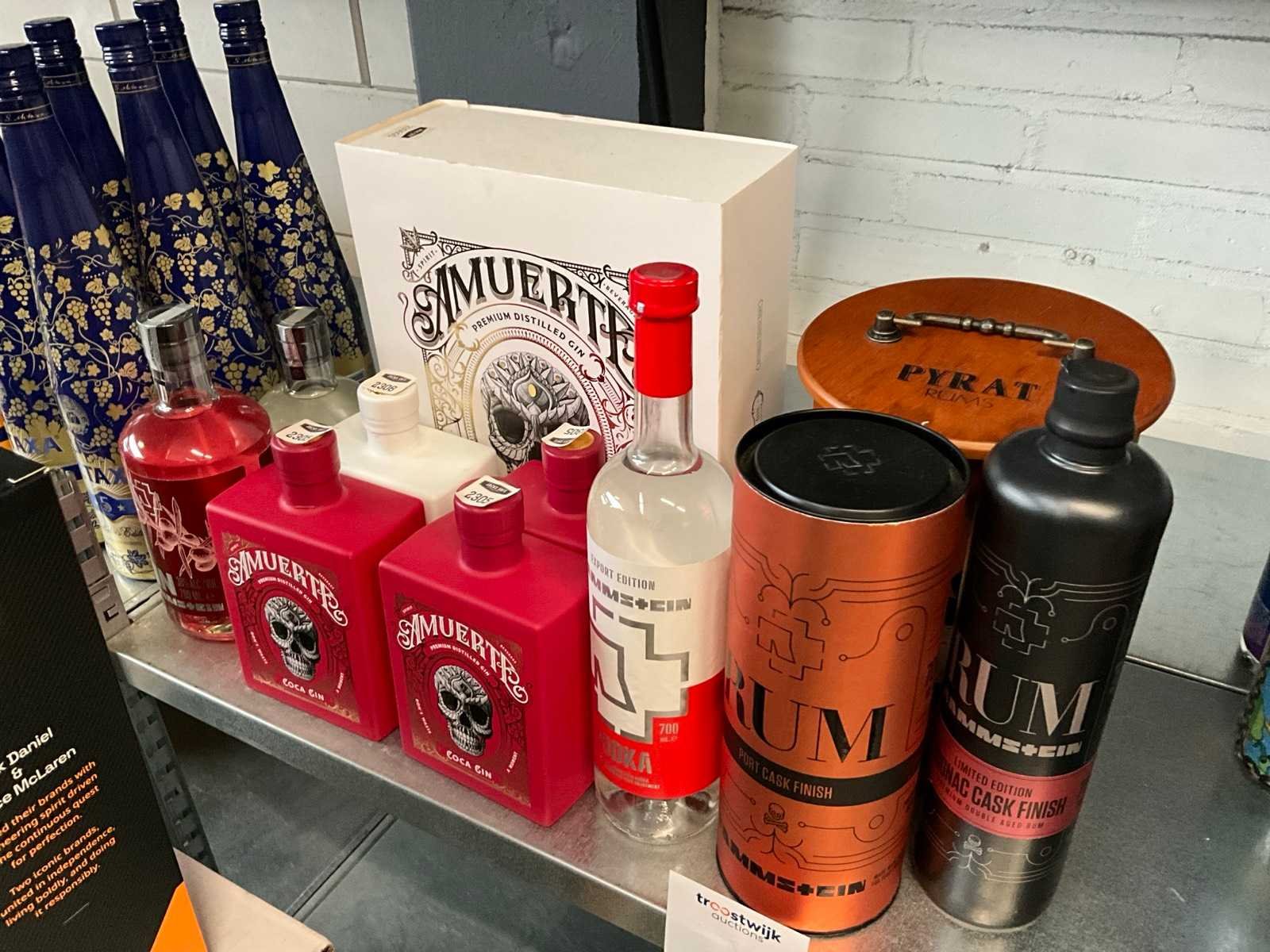 Diverse soorten gin o.a. Amuerte Giftset met 2 glazen, 3 x Rode Amuerte limited Edition, 1 x witte Amuerte Limited Edition en diverse Rammstein Gins en Rums. Inclusief een Pyrat Rum in houten kist