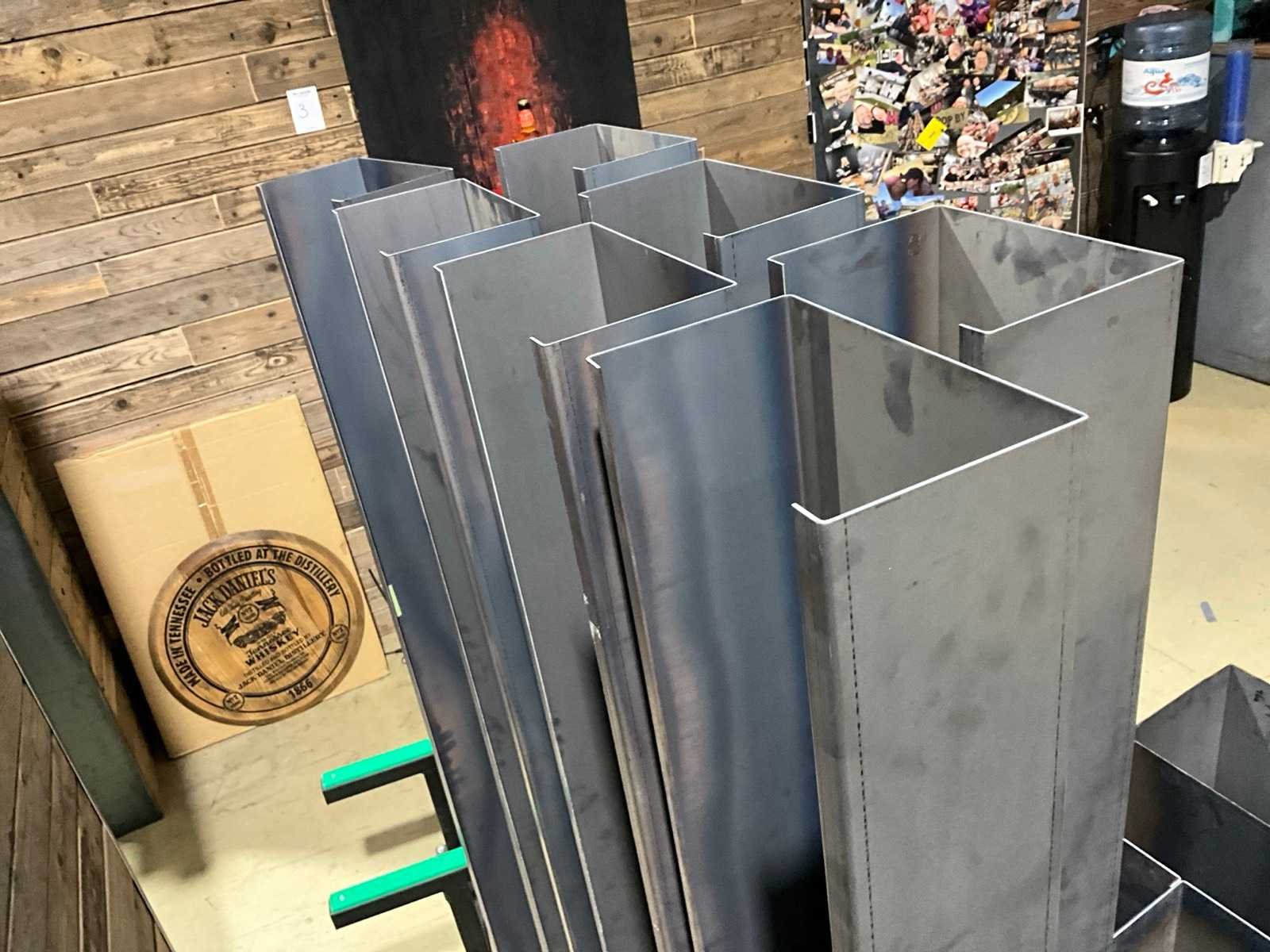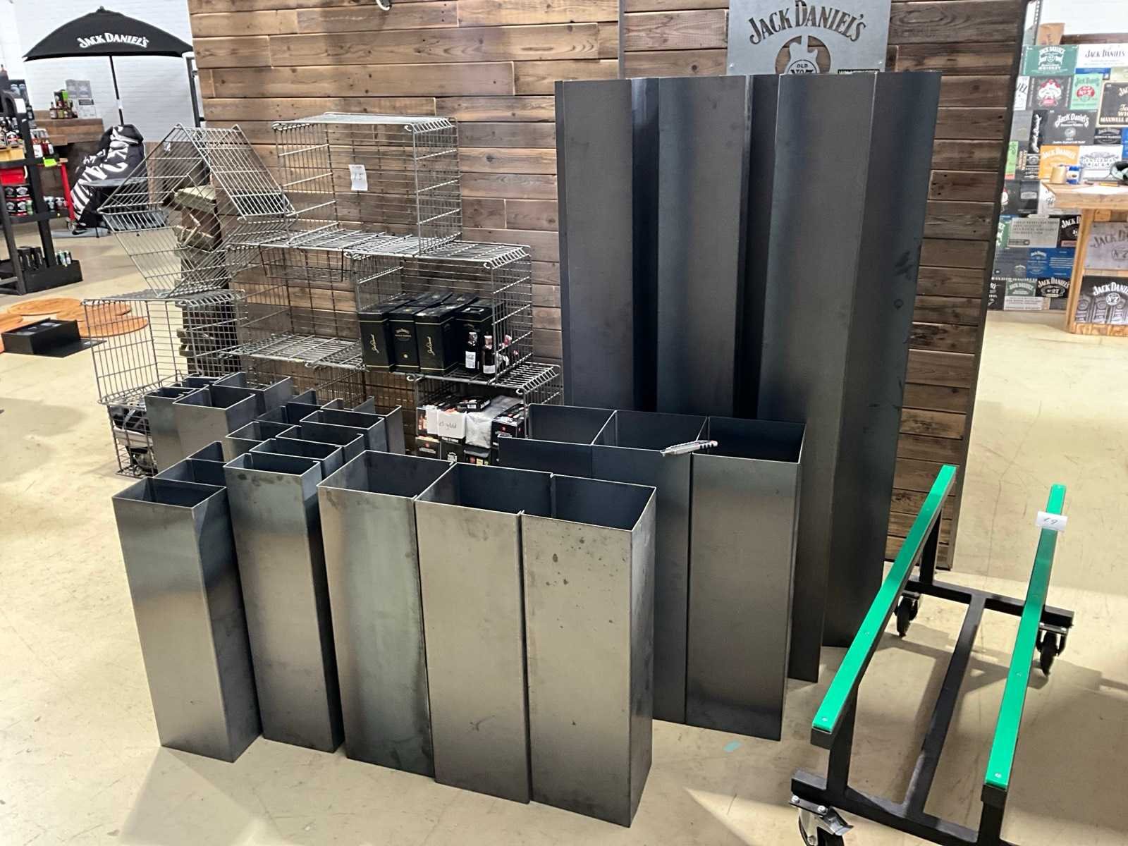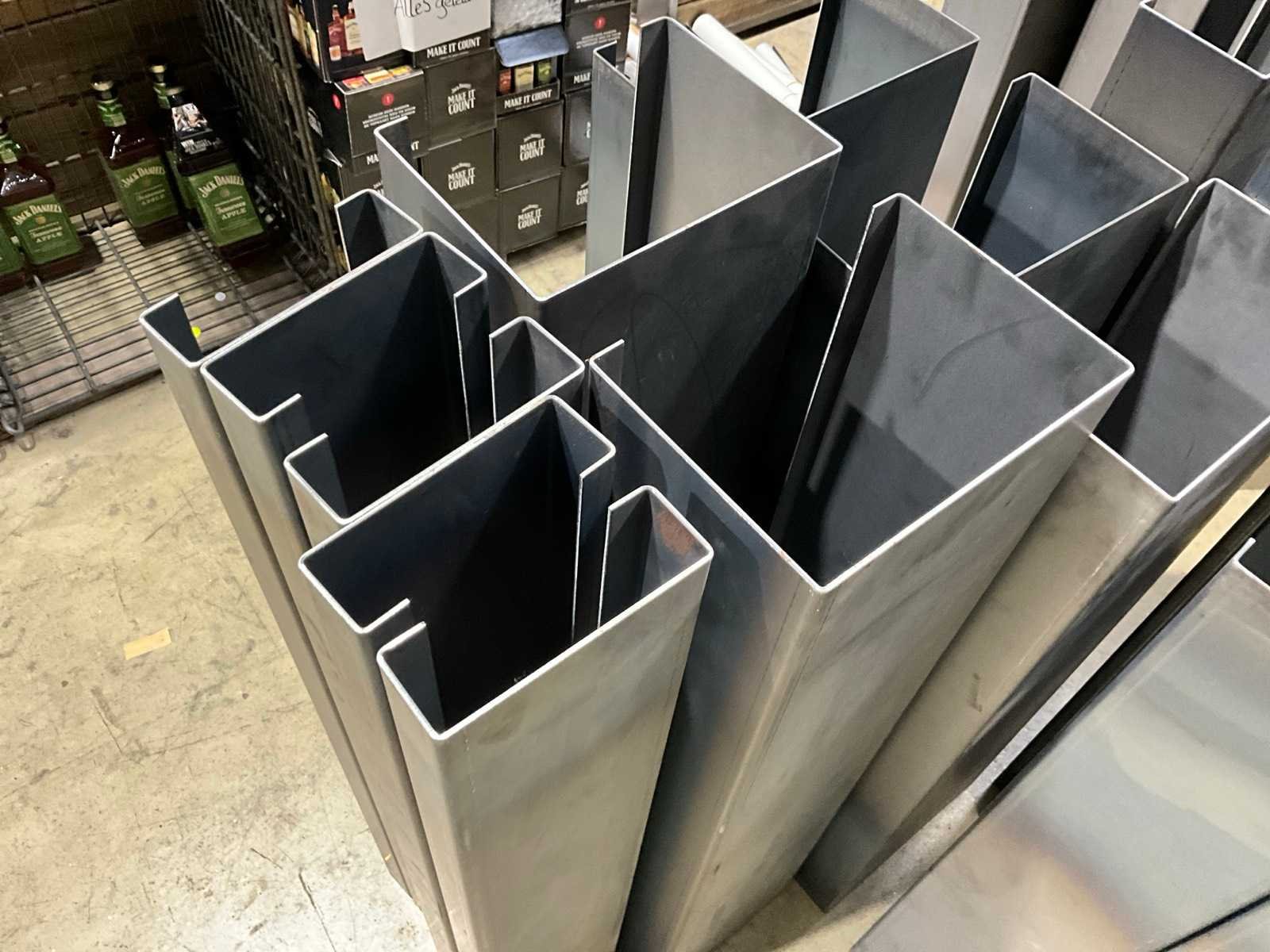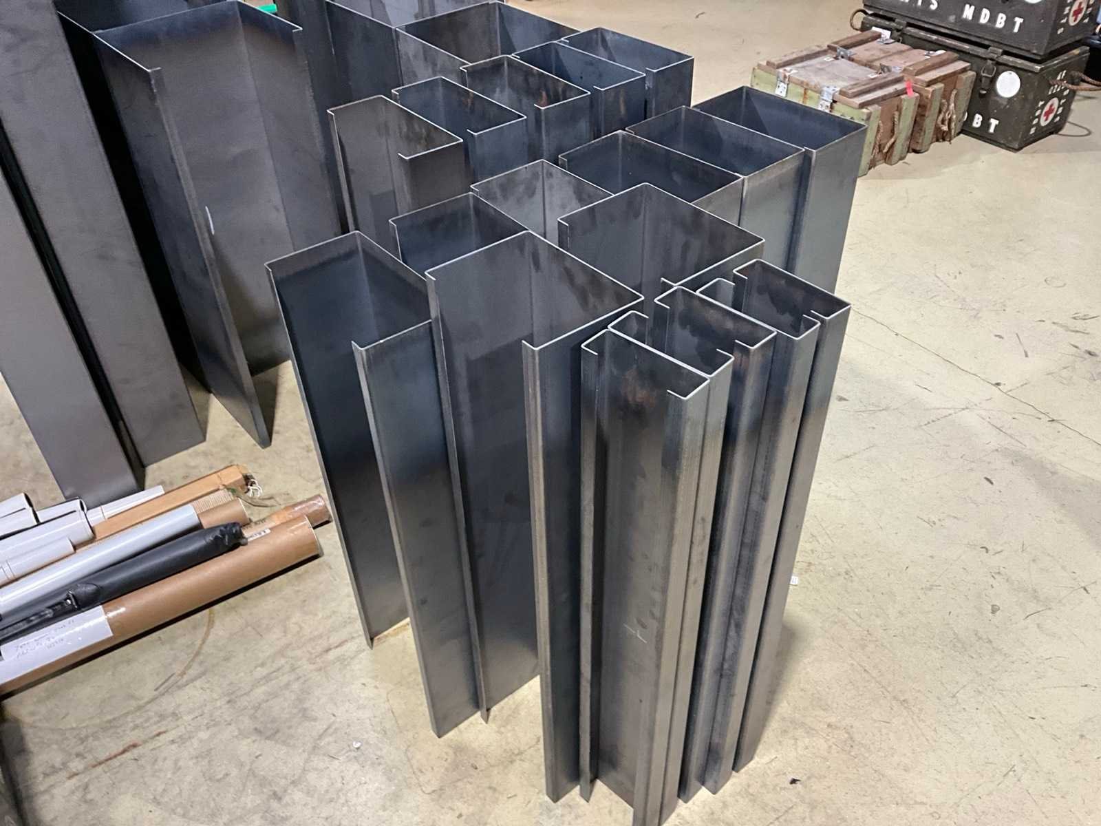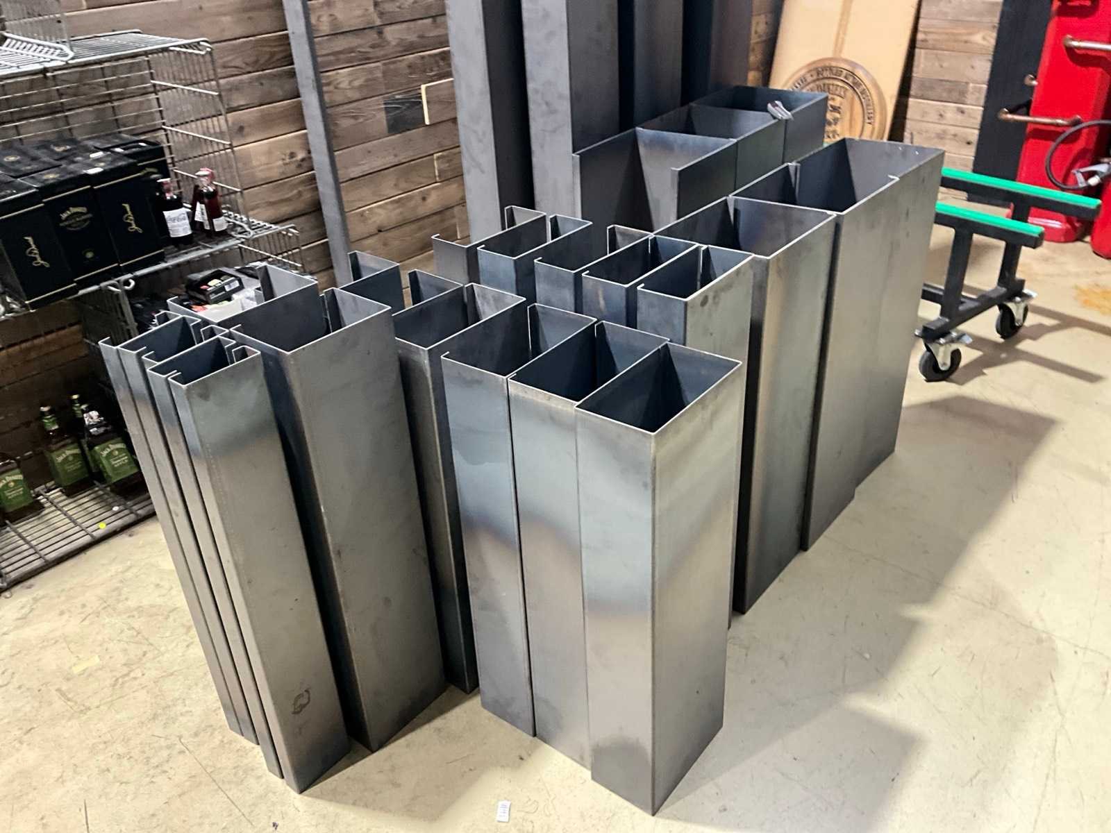 Diverse stands van dik koudgewalst staal, gebogen en op maat gemaakt. Stalen niveau regelaars 7 stuks 170x22x12cm (LxBxH), Stalen niveau regelaars 3 stuks 86x28x26cm (LxBxH), Stalen niveau regelaars 3 stuks 80x24x26cm (LxBxH), Stalen niveau regelaars 5 stuks 86x22x9cm (LxBxH), Stalen niveau regelaars 6 stuks 76x22x13cm (LxBxH), Stalen niveau regelaars 2 stuks 86x19x14cm (LxBxH), Stalen niveau regelaars 5 stuks 86x12x4cm (LxBxH)