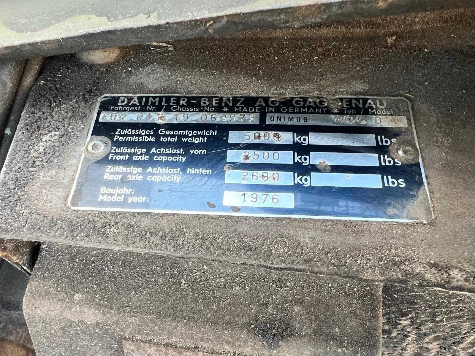 Let op: Kijkdag en ophaaldag alleen op afspraak! Let op: Objecten op verschillende locaties! Wij adviseren u gebruik te maken van de kijkdag, voor u eigen oordeel. Maak hiervoor een afspraak via info@sbservicetrucks.com! Kenteken: 84YD04 Merk: Unimog Type: 404 Bouwjaar: 1976 Cilinderinhoud: 2195cc Vermogen (kW): 60kW Datum eerste toelating: 1976-06-30 Datum eerste toelating (NL): 2021-06-15 APK vervaldatum: 2022-06-14 Aantal zitplaatsen: 2 Kleur: niet van toepassing Ledig gewicht: 2757kg Laadvermogen: 743kg Aantal cilinders: 6 Carrosserie: huifopbouw Emissieklasse: 0