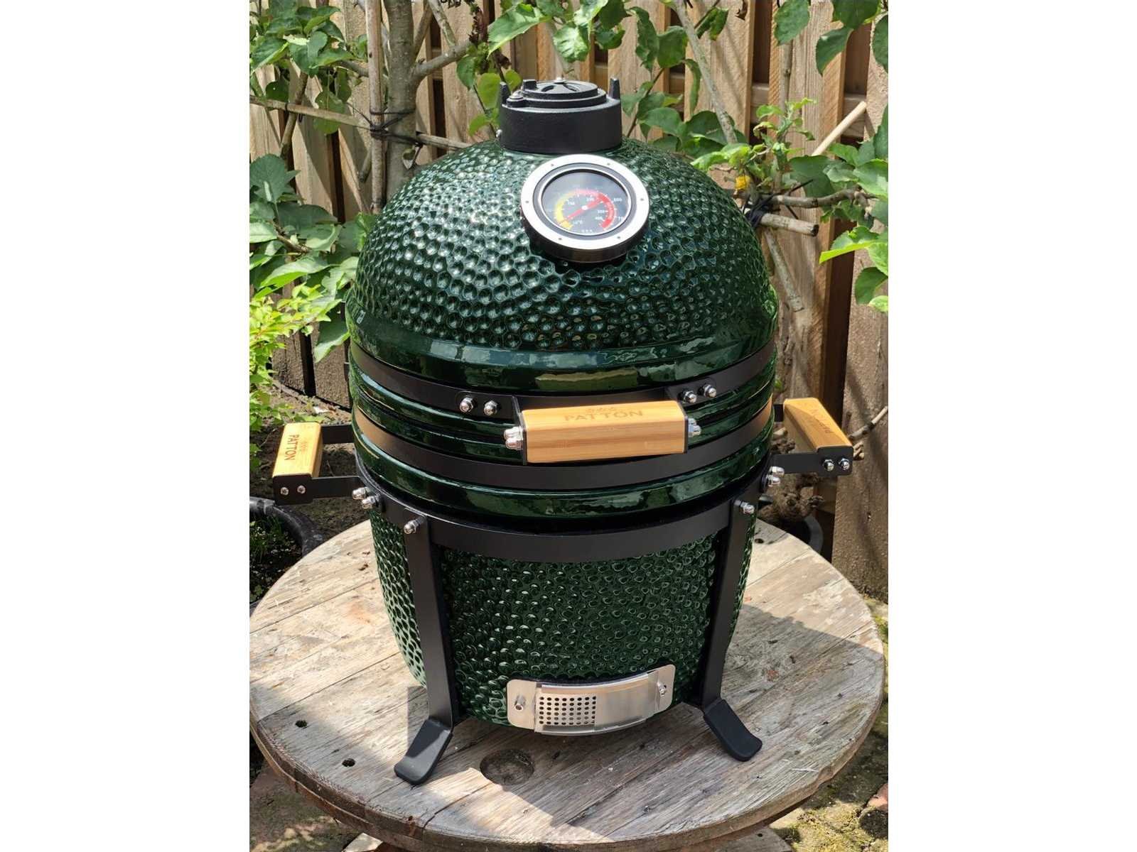 Kenmerken: • Kleur: groen • Uitvoering 15”; Diameter grilloppervlak 34 cm. • Hoogwaardig geglazuurd industrieel keramiek, welke bestand is tot temperaturen van zo’n 1.000 graden Celsius. • Dankzij de keramische schaal en gecontroleerde luchtstroom wordt het vlees of ander gerecht sappiger en malser dan in welke andere stalen barbecue ook ! • Vanwege het ventilatierooster aan de onderzijde i.c.m. met de zgn. margrietschijf aan de bovenzijde is de temperatuur uitermate goed te controleren en in te regelen. • 15” uitvoering standaard uitgevoerd met degelijk onderstel • Middels de temperatuur meter op het deksel is de temperatuur goed te volgen Merk: Patton Model: 15 inch groen (55CCe207) Kleur: groen Materiaal: keramiek